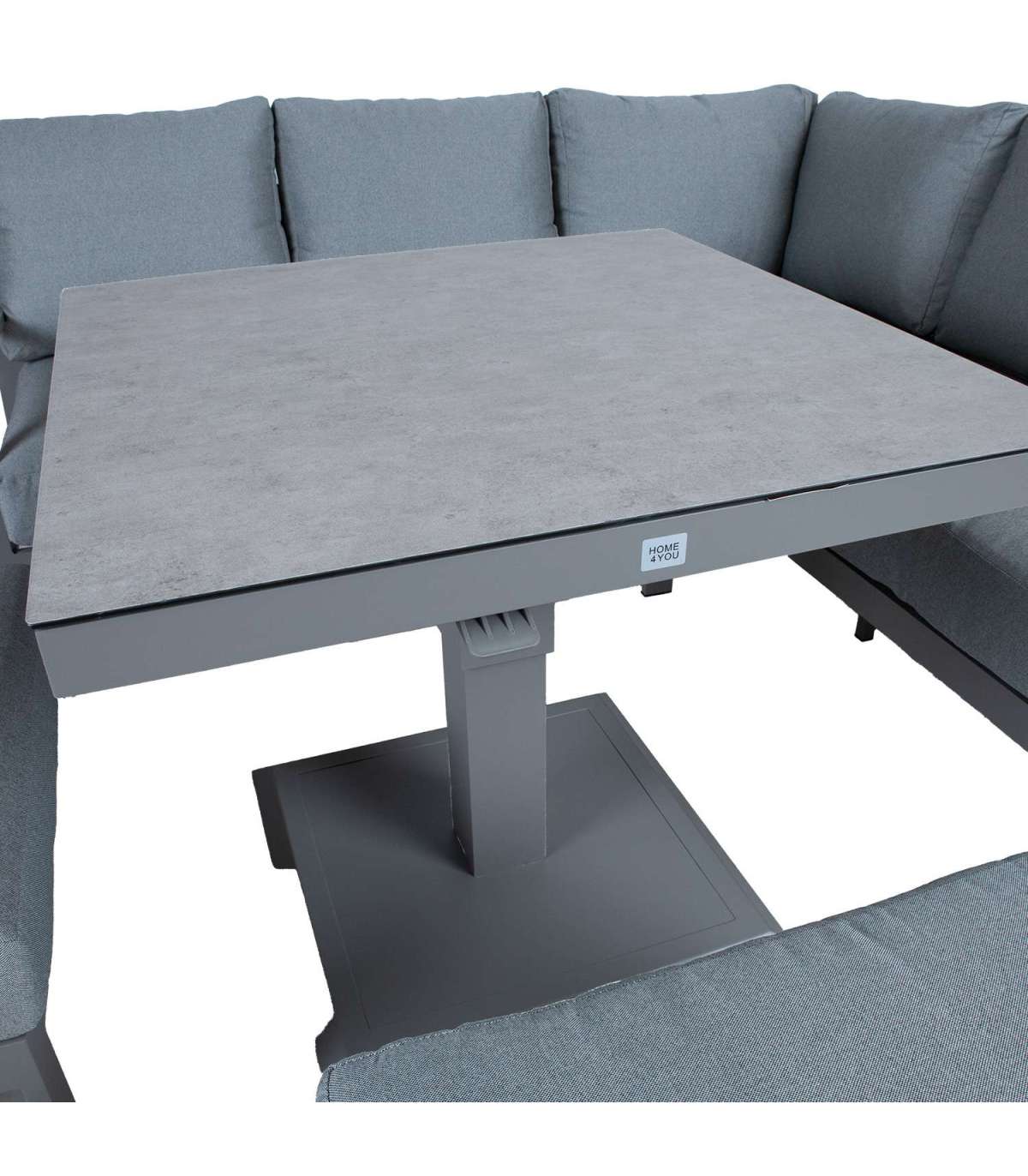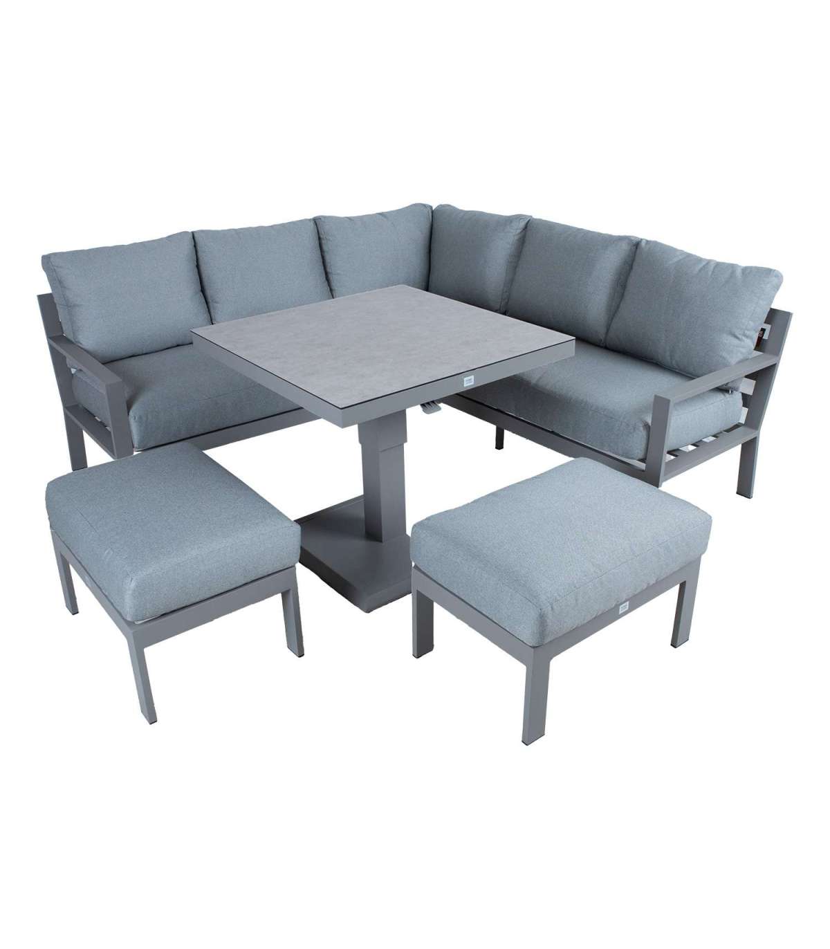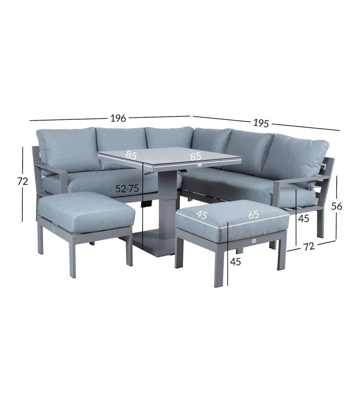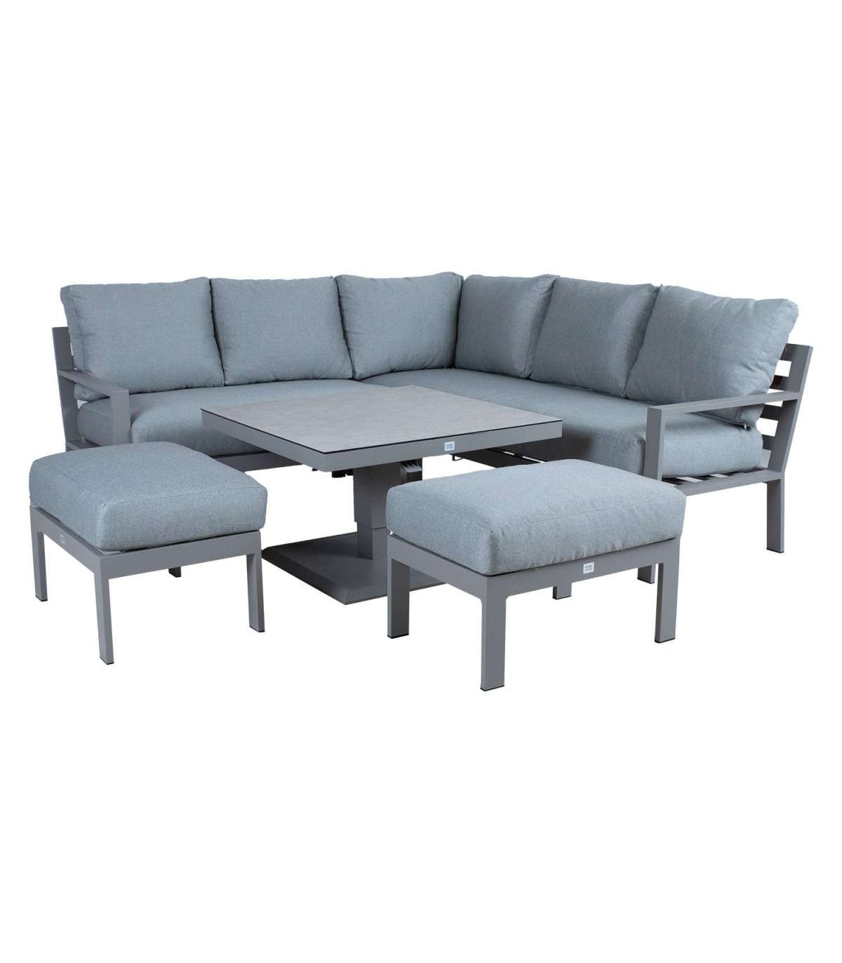 Komplekti kuulub muudetava kõrgusega laud, nurgadiivan ja 2 tumbat. Komplekti kõigi osade raamid on valmistatud alumiiniumist ja viimistletud hallikasbeeži pulbervärviga.