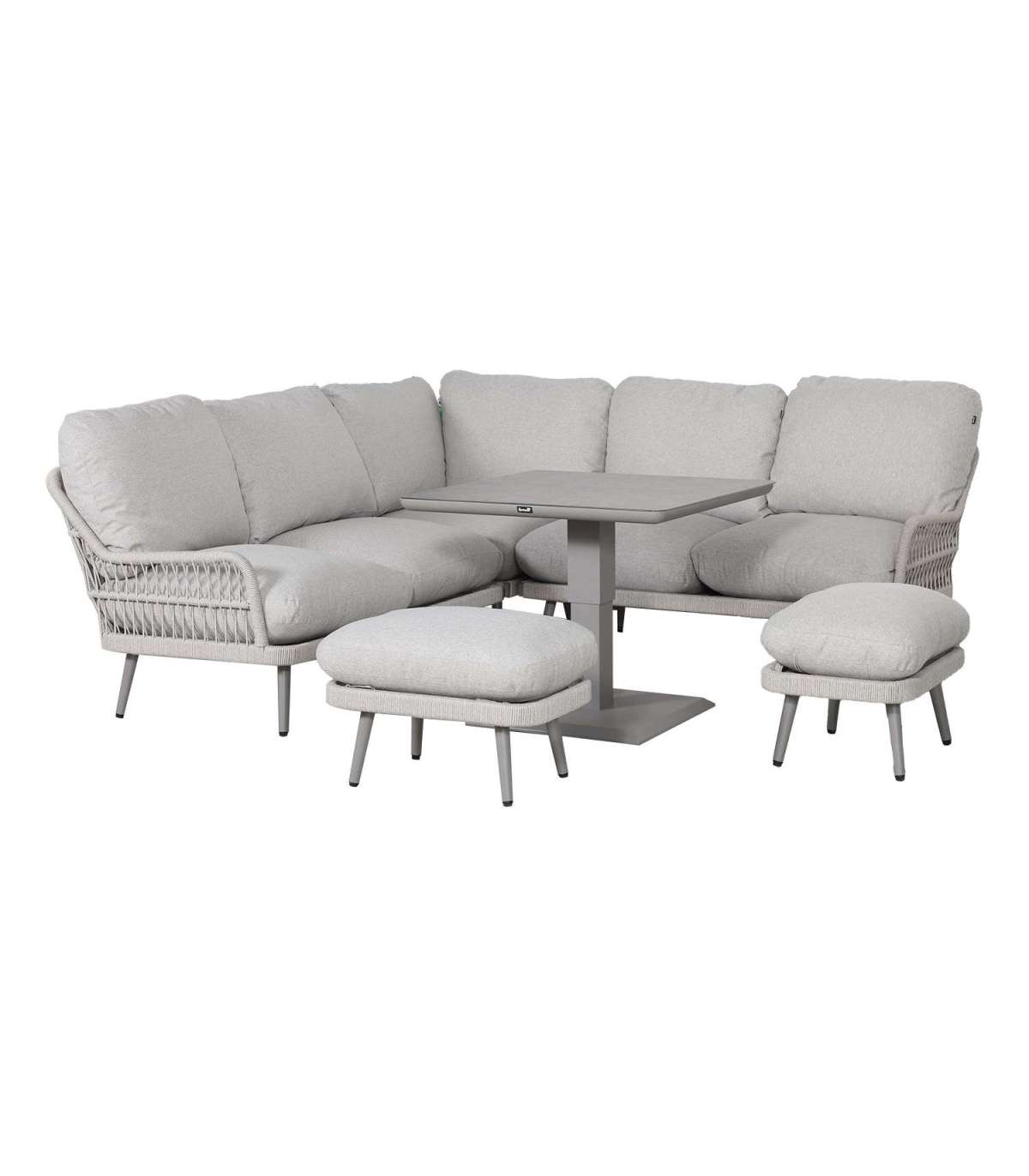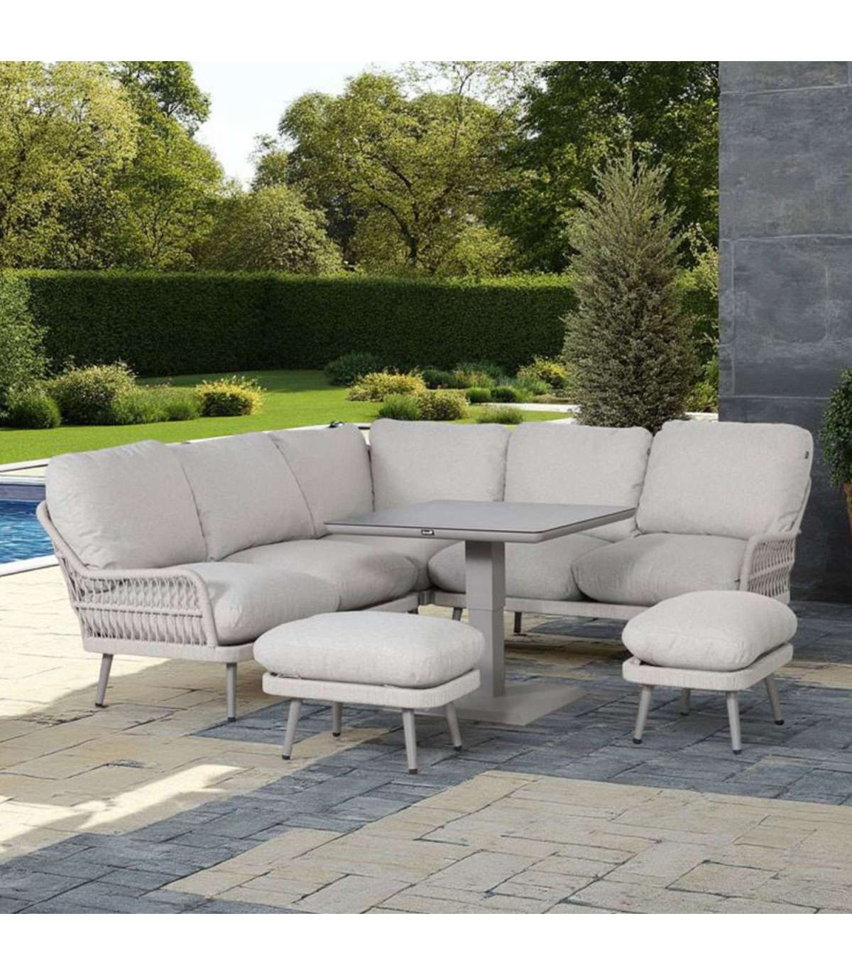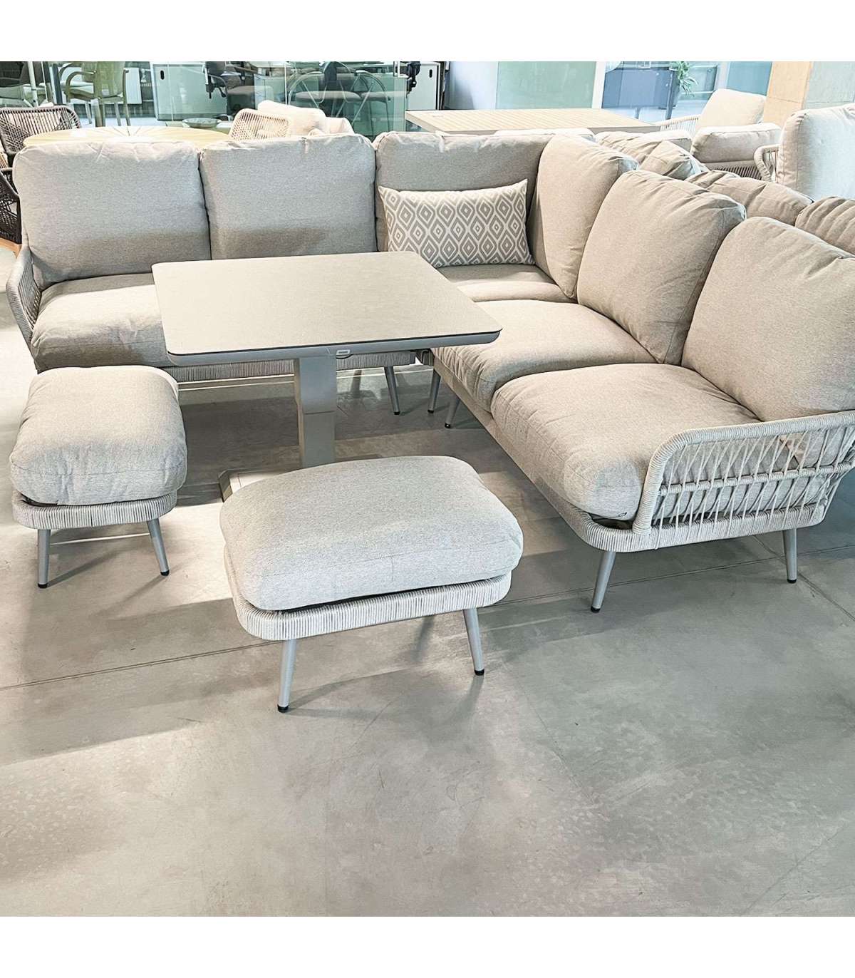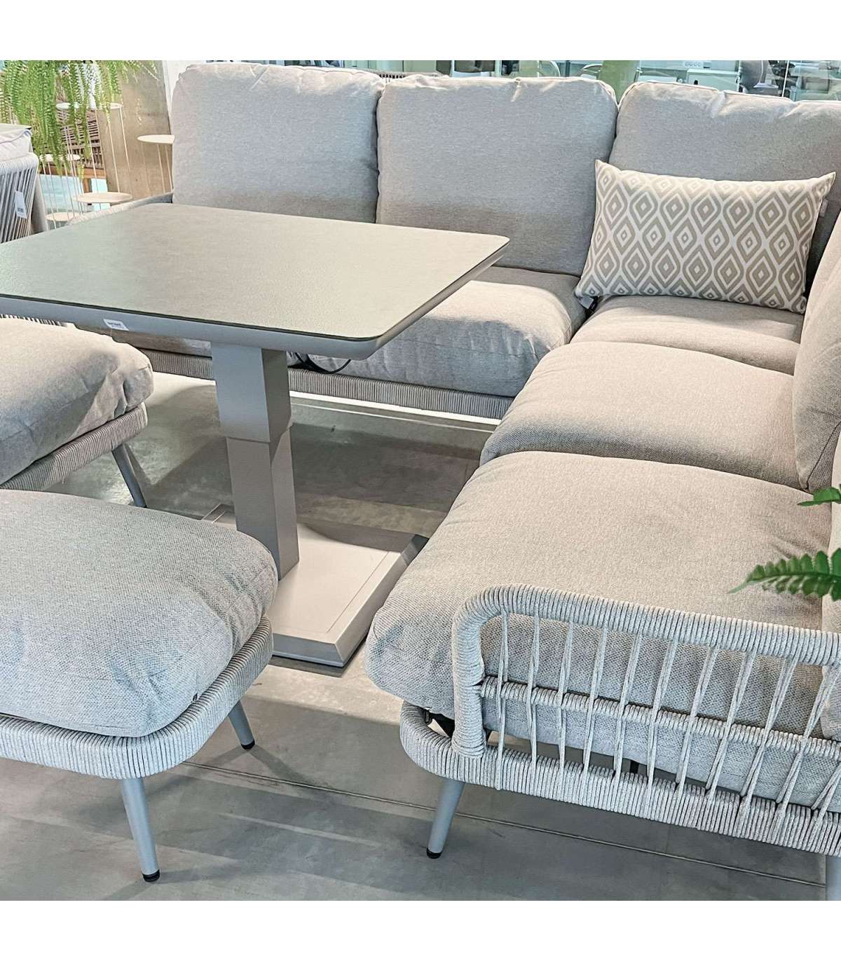 Komplekti kuulub muudetava kõrgusega laud, nurgadiivan ja 2 tumbat.