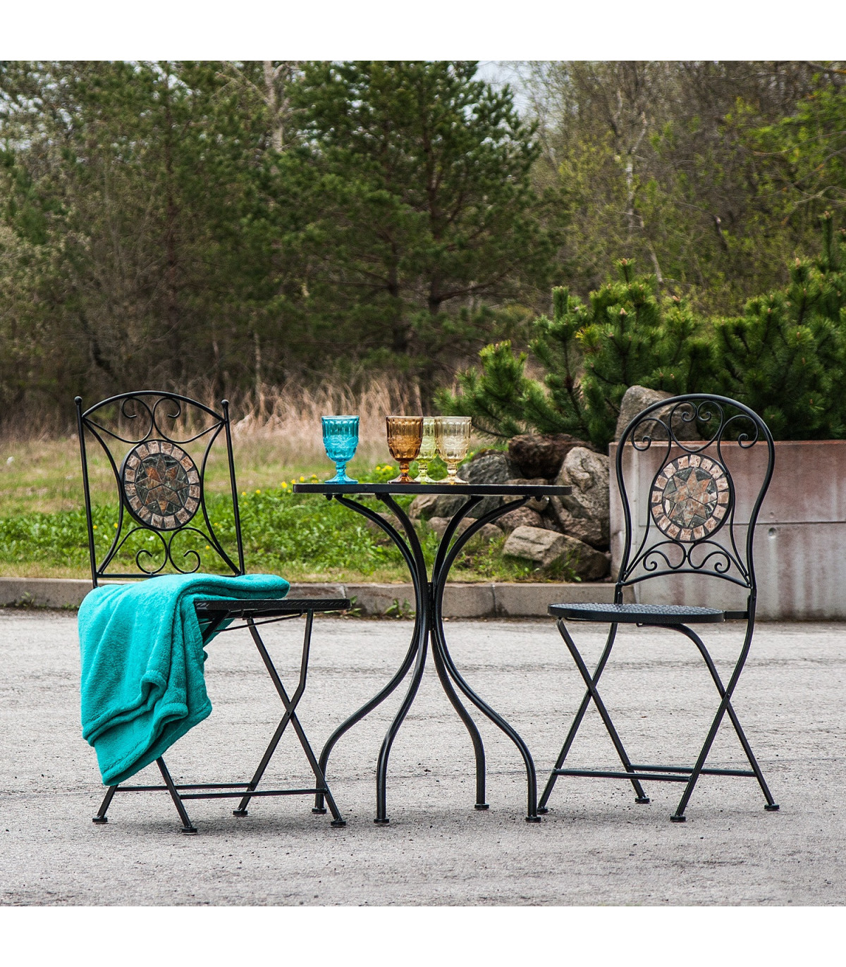 Балконный комплект MOSAIC стол, 2 стула (38666). Стол D60xH70см, мозаичная столешница: темно-серый/коричневый камень, металлический каркас, цвет: черный. Стул 38x38xH93см, складной, металлический каркас.