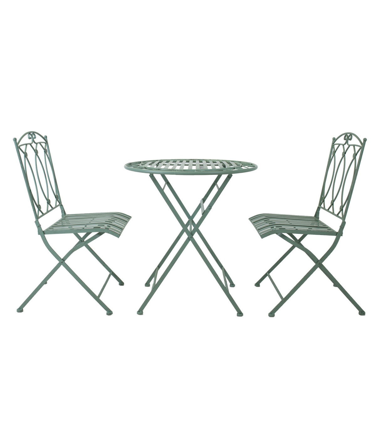 Балконный комплект MINT, стол и 2 стула, антично-зеленый. Кованая мебель – это стильно и долговечно! В процессе отделки порошковое покрытие в сочетании с электрофоретическое покрытие обеспечивает превосходную устойчивость к ржавчине. Размеры стола D70xH75см. Габаритные размеры стула 40x51xH92см, ширина сиденья 39см, глубина сиденья 39см, высота сиденья 45см. Размеры кресла в сложенном виде 40х105х12см. Ограничение по весу 100 кг. Стол и стулья складные. УХОД И ХРАНЕНИЕ: кованая мебель практически не требует ухода, достаточно регулярной чистки. В конце летнего сезона мы рекомендуем хранить садовую мебель в помещении. Очистите и высушите мебель перед хранением. Для хранения используйте сухое, хорошо проветриваемое помещение.