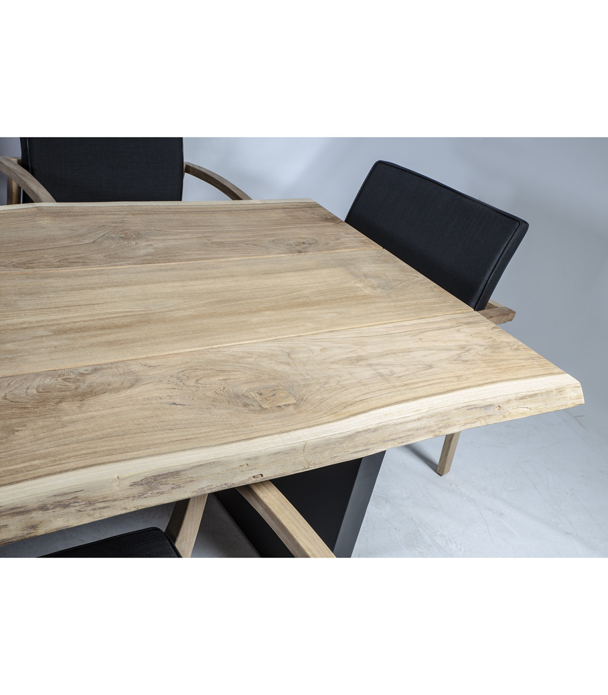 Столешница: тик, обработка: рустикальный, не промасленный, алюминевые ножки, цвет: серый. Столешница изготовлена из массива дерева, внешние края необрезная. Алюминиевые ножки покрыты серой порошковой краской. Стул NAUTICA 64x65xH90см, сиденье: чёрный textiline, ножки и рама: тик, обработка: слегка полированный, не промасленный.