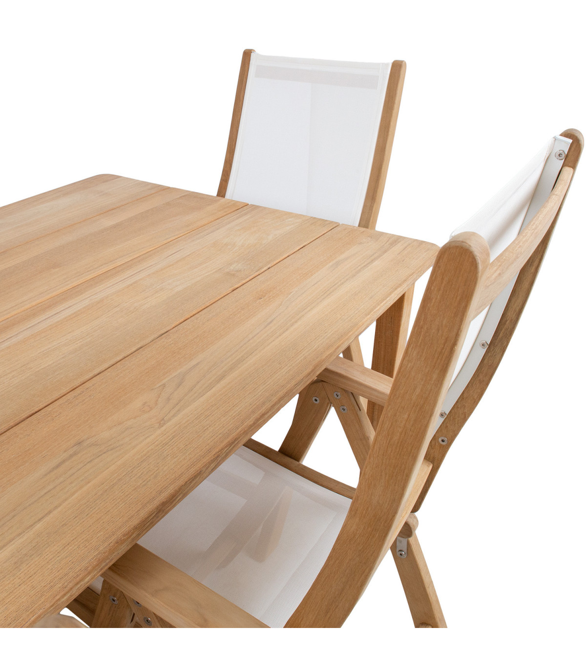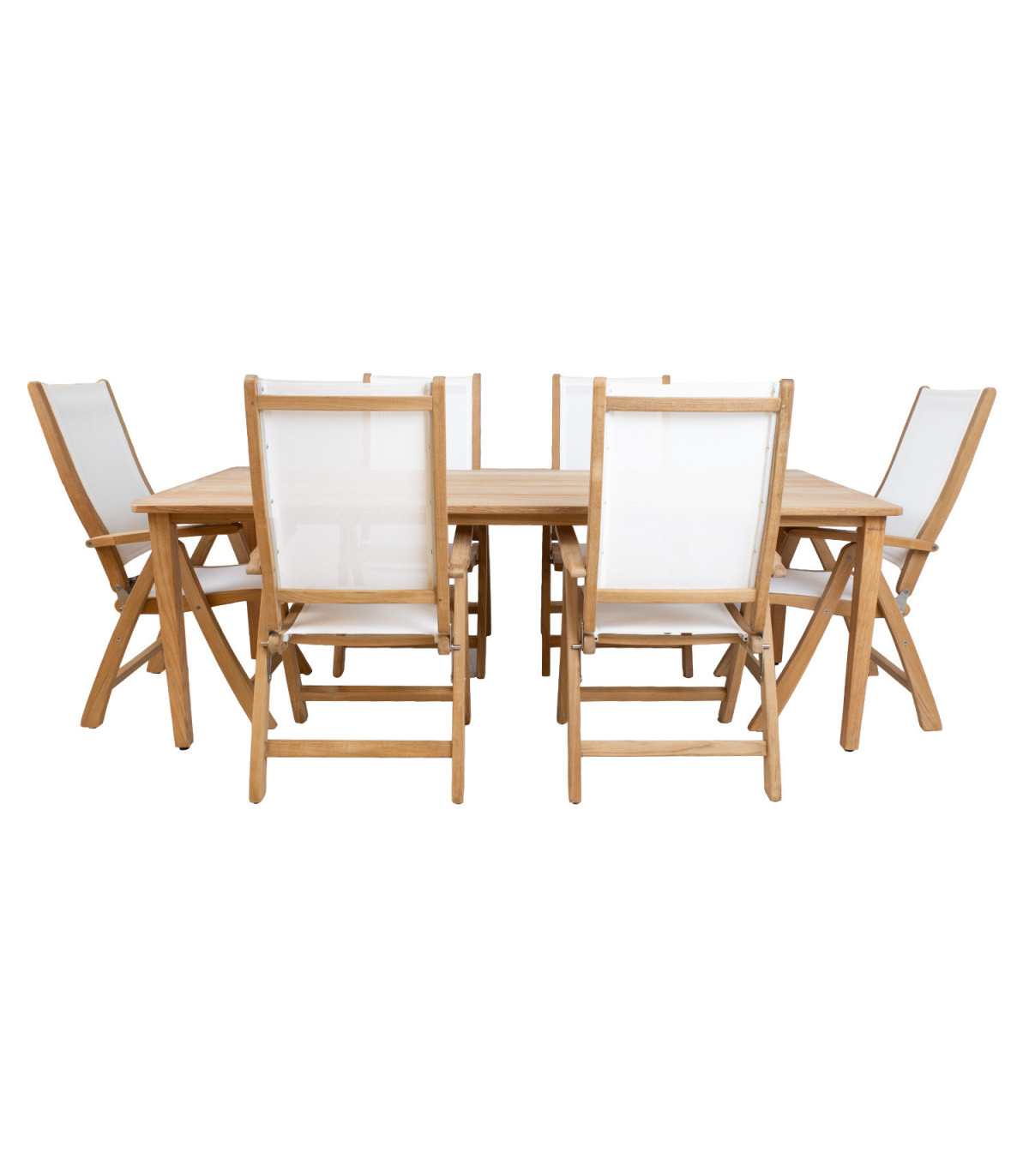 Обеденный комплект MALDIVE стол и 6 стульев. Размеры стола 220x100xH75см. Стол изготовлен из тщательно отобранного зрелого тикового дерева. Мелко отшлифованная поверхность дерева полностью натуральна. Благодаря высокому содержанию натуральных масел тик очень устойчив к влаге и древесным вредителям и не требует дополнительной обработки. Габаритные размеры стула 60x70xH110см, ширина сиденья 48см, глубина сиденья 46см, высота сиденья 45см, высота спинки 70см, высота подлокотника от земли 66см. Ограничение по весу 120 кг. Каркас стула изготовлен из тикового дерева. Все деревянные детали тщательно отшлифованы. Сиденье и спинка выполнены из белого батилина. Важнейшей особенностью материала батилин является его гибкость и оптимальный комфорт для сидения. Помимо исключительной механической прочности, материал обладает высокой химической стойкостью. Синтетическое покрытие гарантирует чрезвычайно высокую устойчивость к атмосферным воздействиям и ультрафиолетовому излучению. Тот факт, что влага не впитывается, обеспечивает быстрое высыхание, максимальную устойчивость к пятнам и плесени, а также простоту очистки. Чтобы отрегулировать спинку, поднимите подлокотники, выберите подходящее положение спинки и заблокируйте подлокотники. Можно выбрать между 6 различными позициями. Тиковая древесина очень хорошо переносит различные погодные условия и сохраняет свой прекрасный внешний вид и лучшие свойства на долгие годы. Чем более зрелая древесина, тем выше ее плотность и маслосодержание, тем она долговечнее и устойчивее к погодным условиям. Под воздействием солнечных лучей и влаги поверхность древесины со временем приобретает красивый серебристо-серый цвет. Это изменение цвета является естественным и не влияет на качество древесины. УХОД: регулярно чистите мебель, защищайте ее от чрезмерной влажности и УФ-излучения. Чтобы освежить деревянные поверхности, при желании их можно слегка отшлифовать. Чтобы продлить срок службы садовой мебели, мы рекомендуем использовать чехлы для садовой мебели. ХРАНЕНИЕ: в конце летнего сезона мы рекомендуем хранить садовую мебель в помещении. Очистите и высушите мебель перед хранением. Для хранения используйте прохладное, сухое, хорошо проветриваемое помещение.
