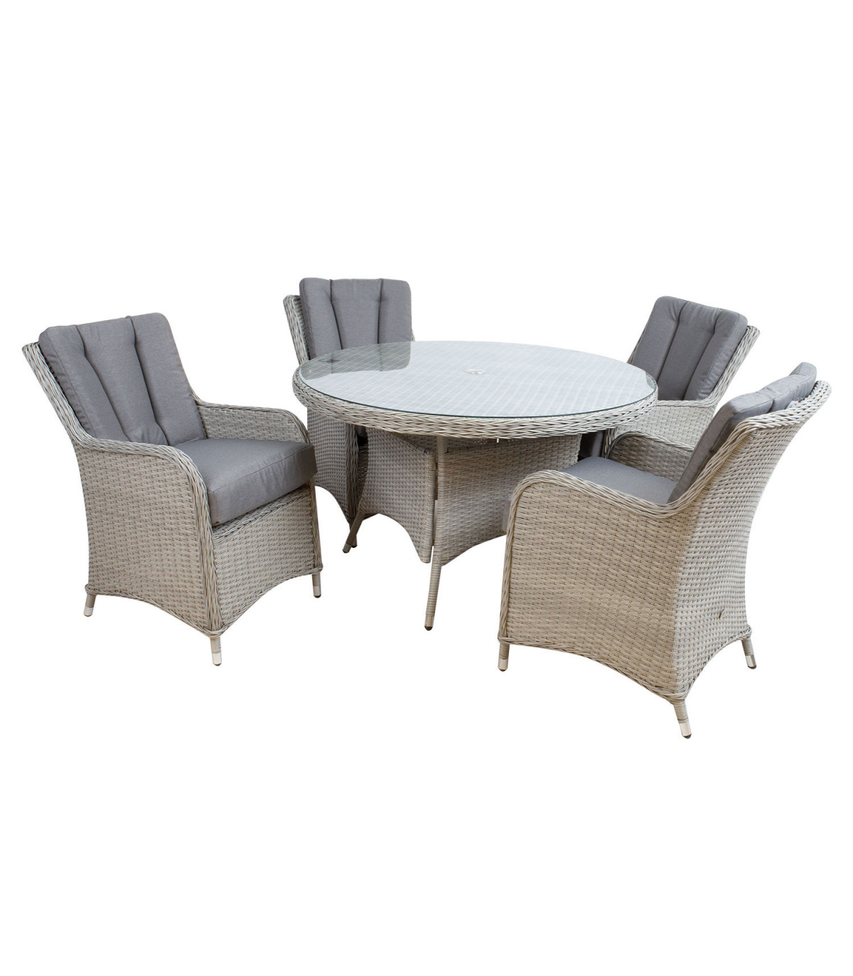 Комплект садовой мебели ASCOT стол и 4 стула. Размеры стола D121xH75см. Каркасы стола и стульев изготовлены из алюминия и обтянуты пластиковым плетением серого цвета. Столешница: закаленное прозрачное стекло 8 мм. В середине стола отверстие (D4см) для зонта от солнца. Размеры кресла 58x70xH90cm. Ширина сиденья 48см, глубина сиденья 49см, высота сиденья с подушкой 54см. Высота подлокотника от земли 66см. Подушки включены. Чехлы на подушки изготовлены из полиэстера серого цвета. Размеры подушки сиденья 48x49xH13см, размеры подушки спинки 50x45x5см. Продукт долговечен в меняющихся погодных условиях и очень прост в уходе. Чтобы продлить срок службы уличной мебели, мы рекомендуем использовать чехлы для уличной мебели. ХРАНЕНИЕ: в конце летнего сезона рекомендуем хранить садовую мебель в помещении. Очистите и высушите мебель перед хранением. Используйте для хранения прохладное, сухое, хорошо проветриваемое помещение.