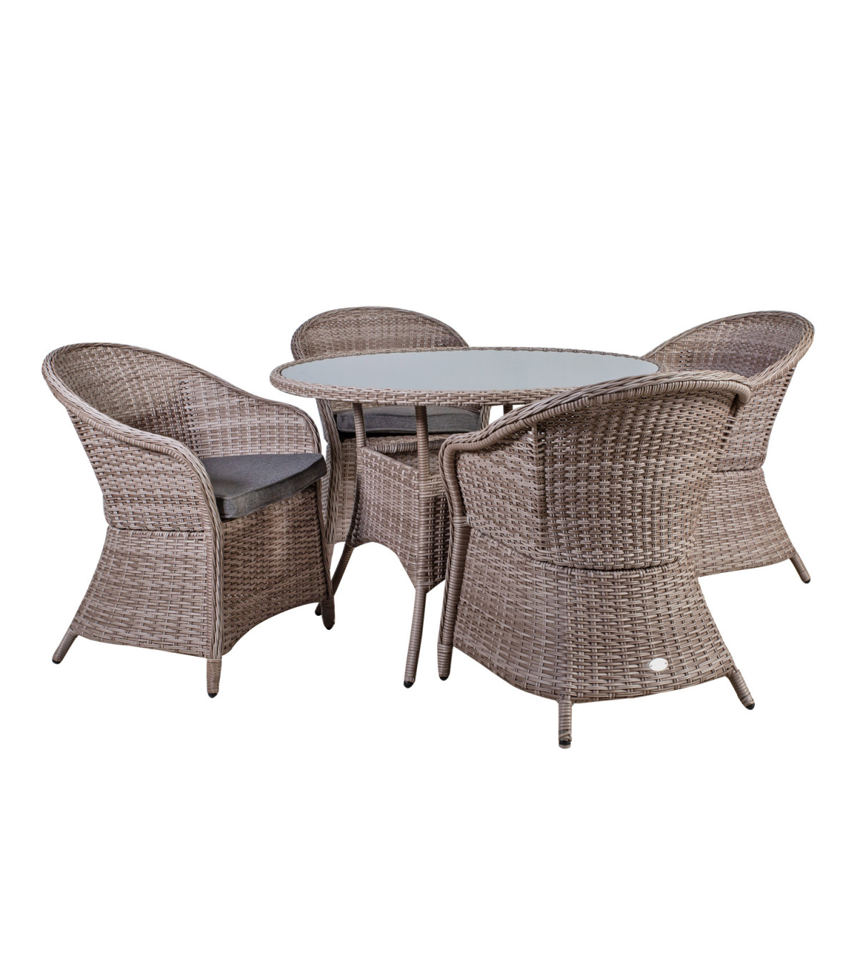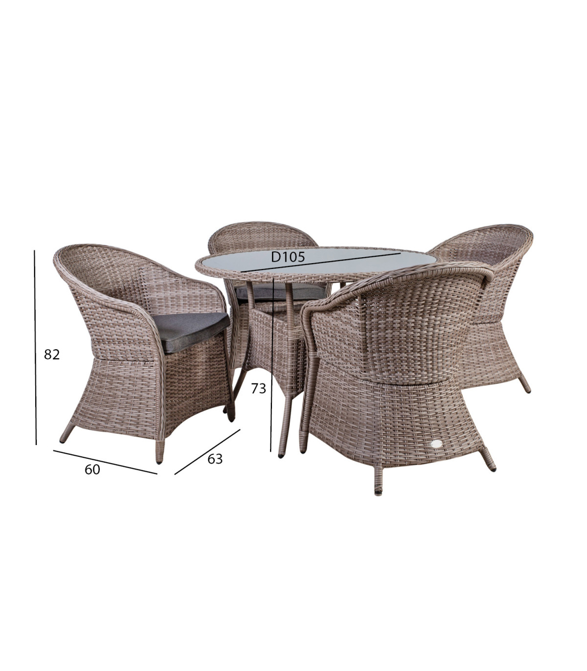 Комплект садовой мебели SIENA стол и 4 стула. Каркасы стола и стульев изготовлены из алюминия и обтянуты пластиковой оплёткой серо-коричневого цвета. Размеры стола D105xH73см, столешница: закаленное стекло. В комплекте подушки для сидения. Чехлы на подушки изготовлены из полиэстера серого цвета. Толщина подушек 6см. Размеры кресла 63x60xH82см. Изделие очень прочное при изменении погодных условий и простое в уходе. Только подушки нуждаются в защите от непогоды. Чтобы продлить срок службы садовой мебели, мы рекомендуем использовать чехлы для садовой мебели. ХРАНЕНИЕ: в конце летнего сезона мы рекомендуем хранить садовую мебель в помещении. Очистите и высушите мебель перед хранением. Для хранения используйте сухое и хорошо проветриваемое помещение.