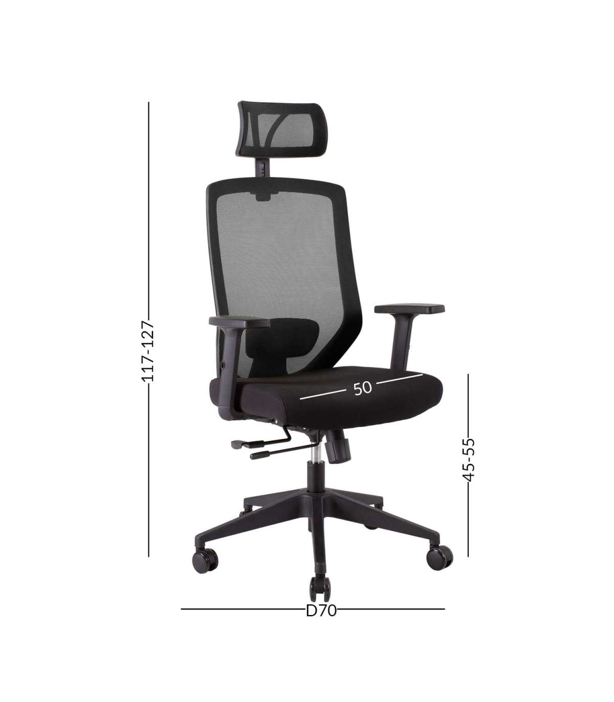 Рабочий стул JOY черный. Материал покрытия: сиденье: полиэстер. Спинка и подголовник: покрытие: сетка-ткань из полиэстер. Эргономичная рама спинки из пластика, цвет: чёрный. Механизм и настройки: мультифункциональный механизм, фиксация трёх позиций. Регулируемая опора для поясницы. Глубина сиденья регулируемые +4,5см, высота сиденья регулируется с помощью газового амортизатора. Подлокотники: материал: пластик с мягким полиуретановым покрытием. Подлокотники и подголовник: высота регулируется. Чёрная крестовина из пластика с 5-ответвлениями R34см, 60мм пластиковые колеса. Размеры: высота 115-125см, ширина сиденья 50см, глубина 50см, высота сиденья 46-56см. Дополнительная информация: предельный вес 120кг.
