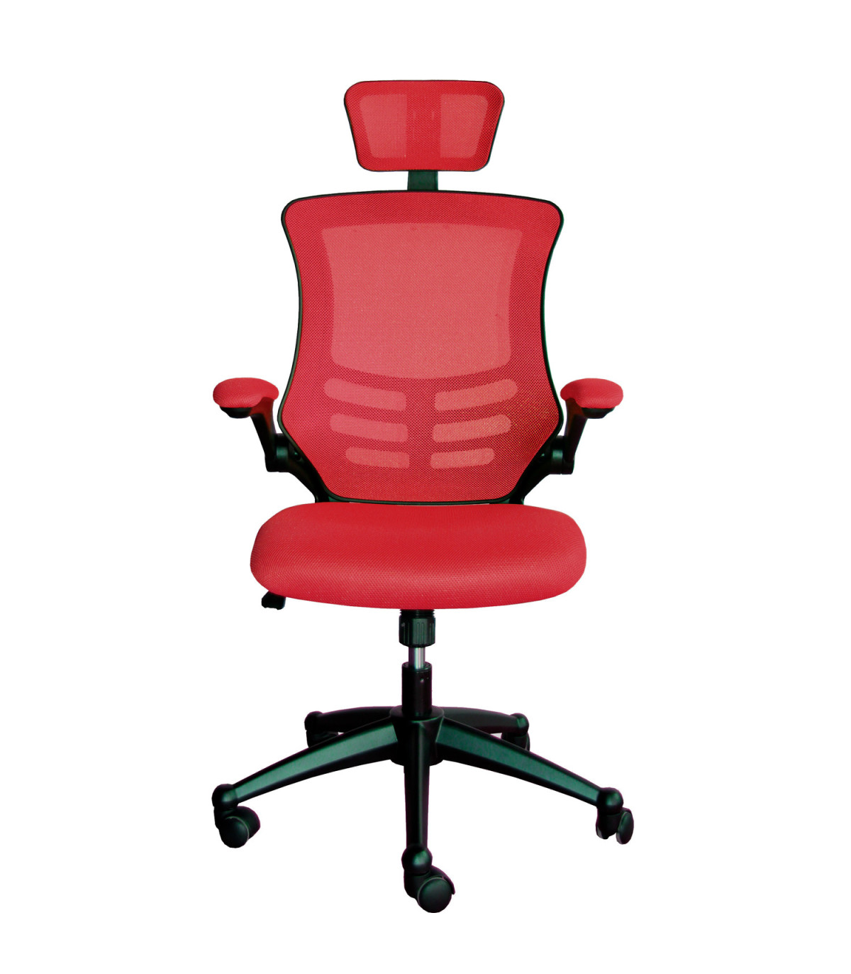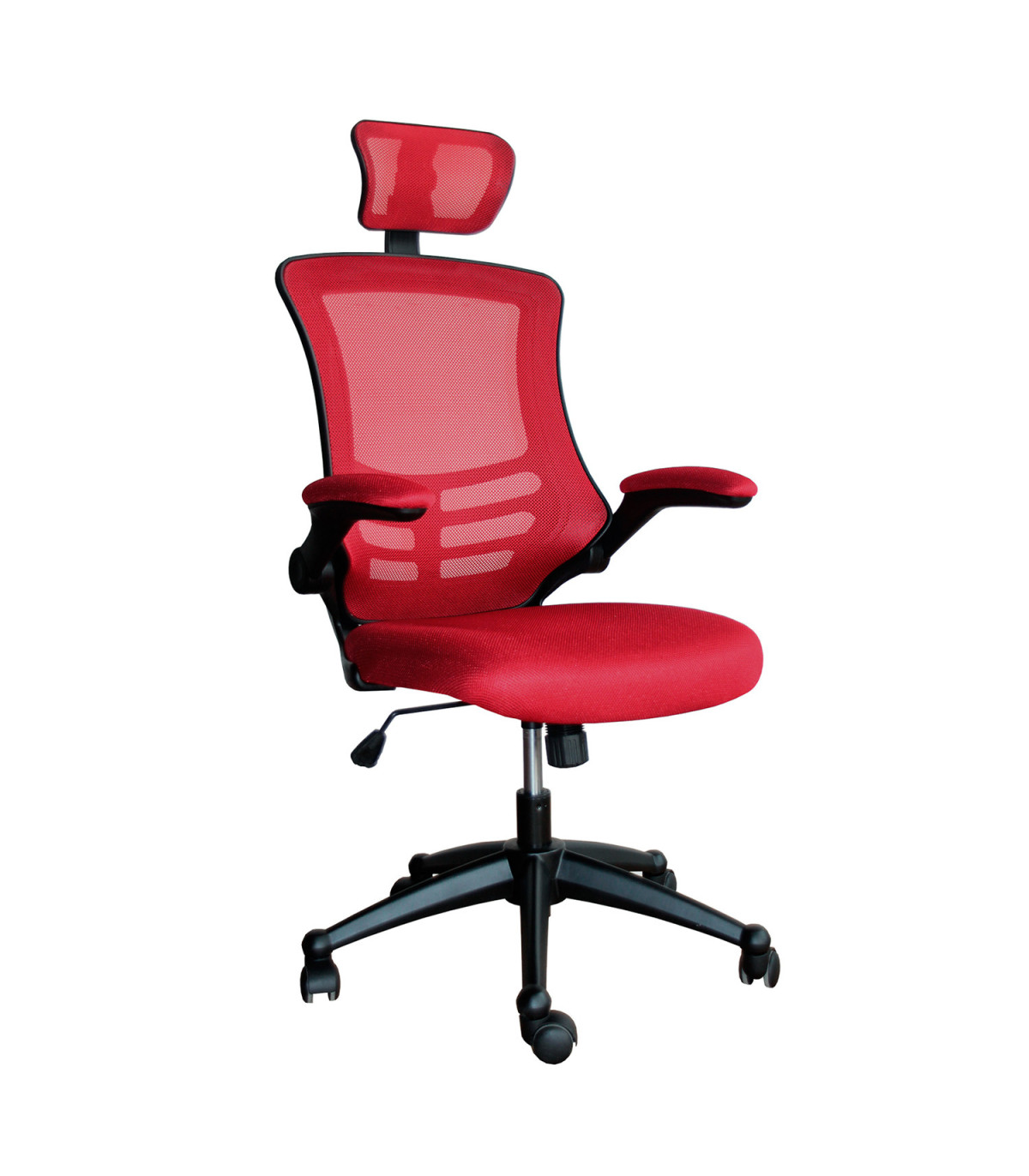 Рабочий стул RAGUSA красный. Материал покрытия: сиденье и спинка: сетка из полиэстера, цвет: красный. Цвет корпуса: чёрный. Механизм и настройки: механизм качели, высота сиденья регулируется с помощью газового амортизатора. Подлокотники: материал: пластик, мягкая полиэстеровая сетка, можно откинуть назад. Подголовник: высота регулируется. Крестовина: крестовина из пластика, цвет: чёрный. Колеса: пластиковые колеса, диаметр штифта: 11мм. Размеры: высота 117-126см, высота сиденья 42-49,5см, глубина сиденья 51см, ширина сиденья 50см. Дополнительная информация: предельный вес 120кг.