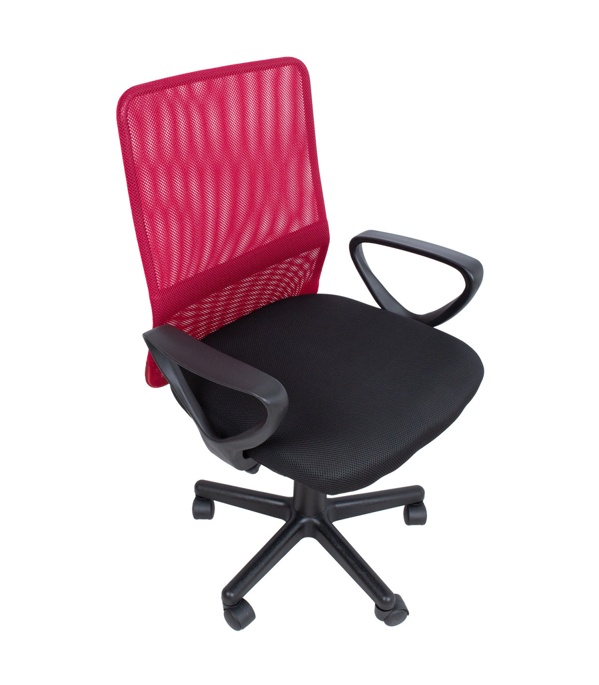 Рабочий стул BELINDA черный/красный. Слегка обитое сиденье обтянуто полиэфирной тканью. Спинка обтянута сеткой из полиэстера. Пневматическая регулировка сиденья по высоте. Черные пластиковые подлокотники. Пластиковая основа с 5 зубцами черного цвета, R27см. Кресло имеет пластиковые колесики, 50 мм. Высота 86,5-98,5см, ширина сиденья 46,5см, глубина сиденья 46,5см, ширина спинки 44см, высота спинки 55,5см. Размеры изделия 59x56xH86,5-98,5см. Грузоподъемность 80 кг.