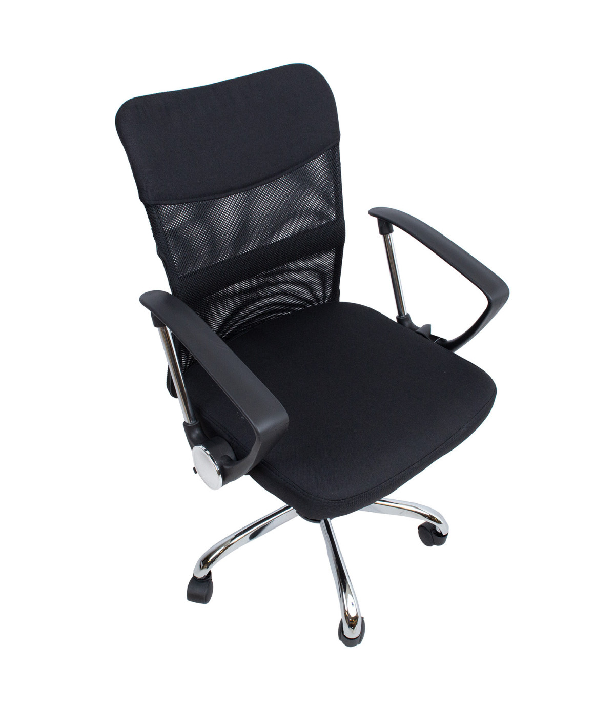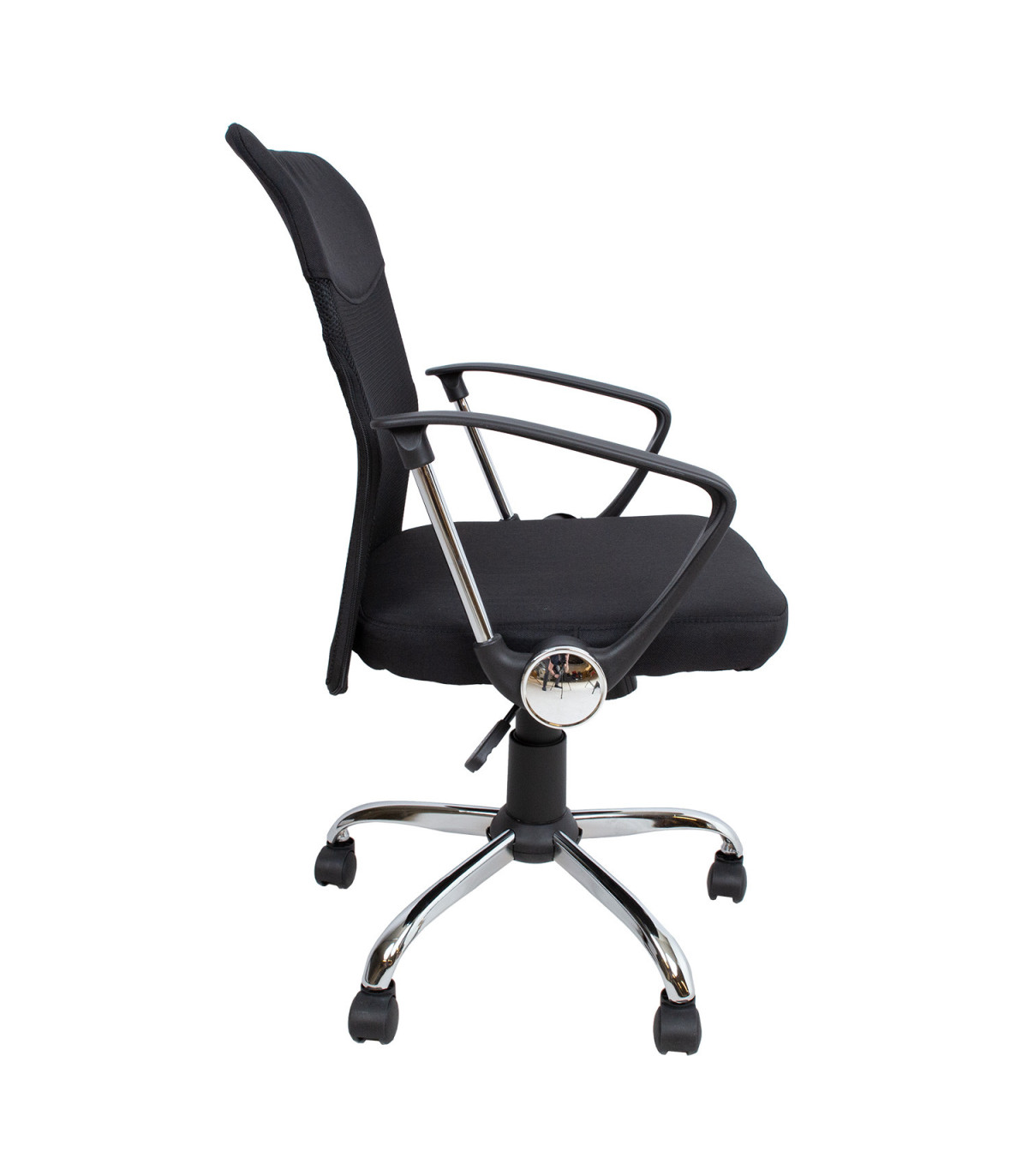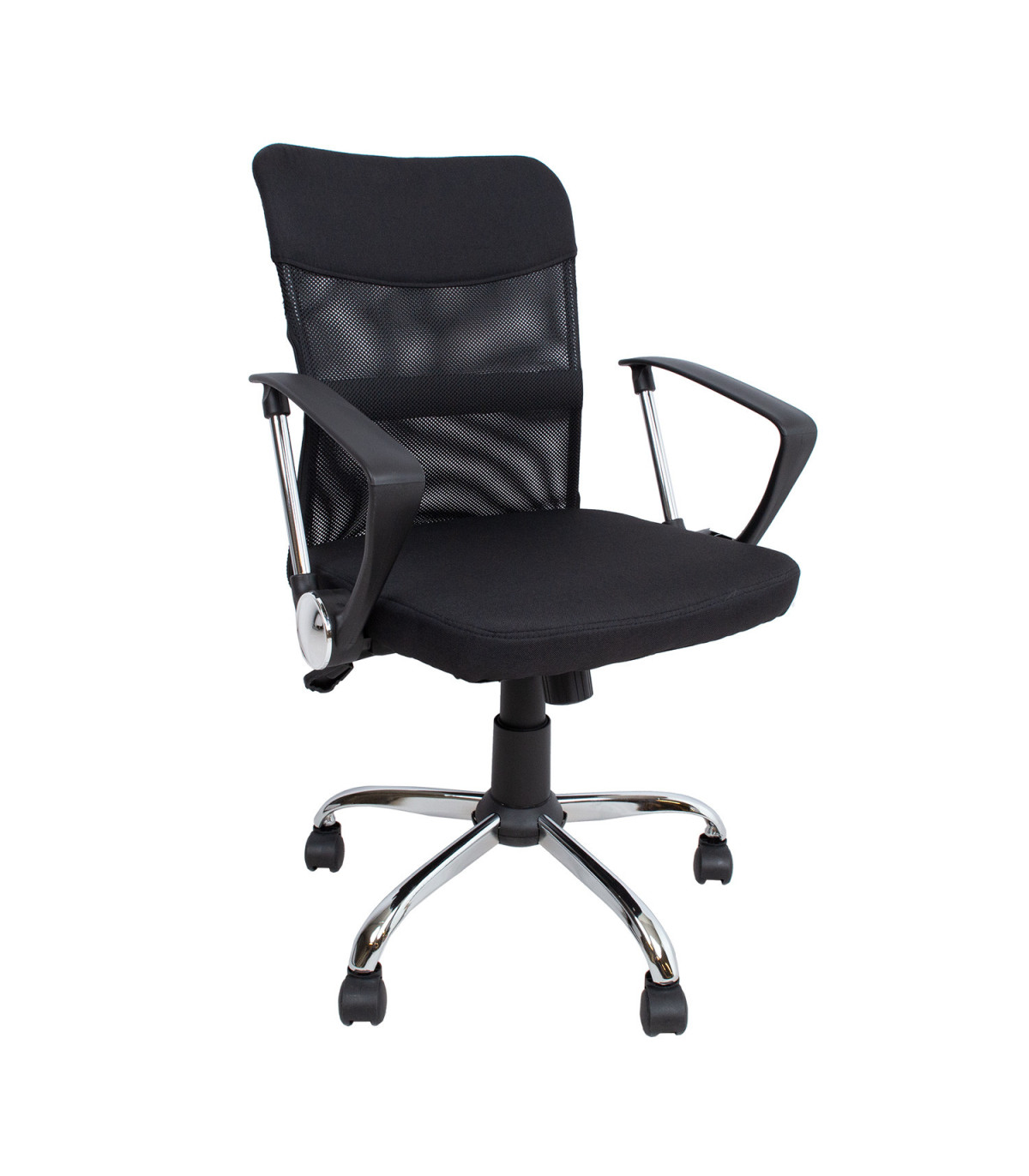 Рабочий стул DARIUS черный. Слегка обитое сиденье и верхняя часть спинки обиты полиэфирной тканью. Средняя часть спинки покрыта сеткой из полиэстера. Механизм наклона можно заблокировать в одном положении. Пневматическая регулировка сиденья по высоте. Подлокотники изготовлены из пластика и металла. Металлическое основание с 5 зубцами, R30см. Ролики пластиковые, 50 мм. Высота 93-103см, ширина сиденья 47см, глубина сиденья 46см, ширина спинки 43,5см, высота спинки 58см. Размеры изделия 57x57xH93-103см. Максимальный вес - 100 кг.