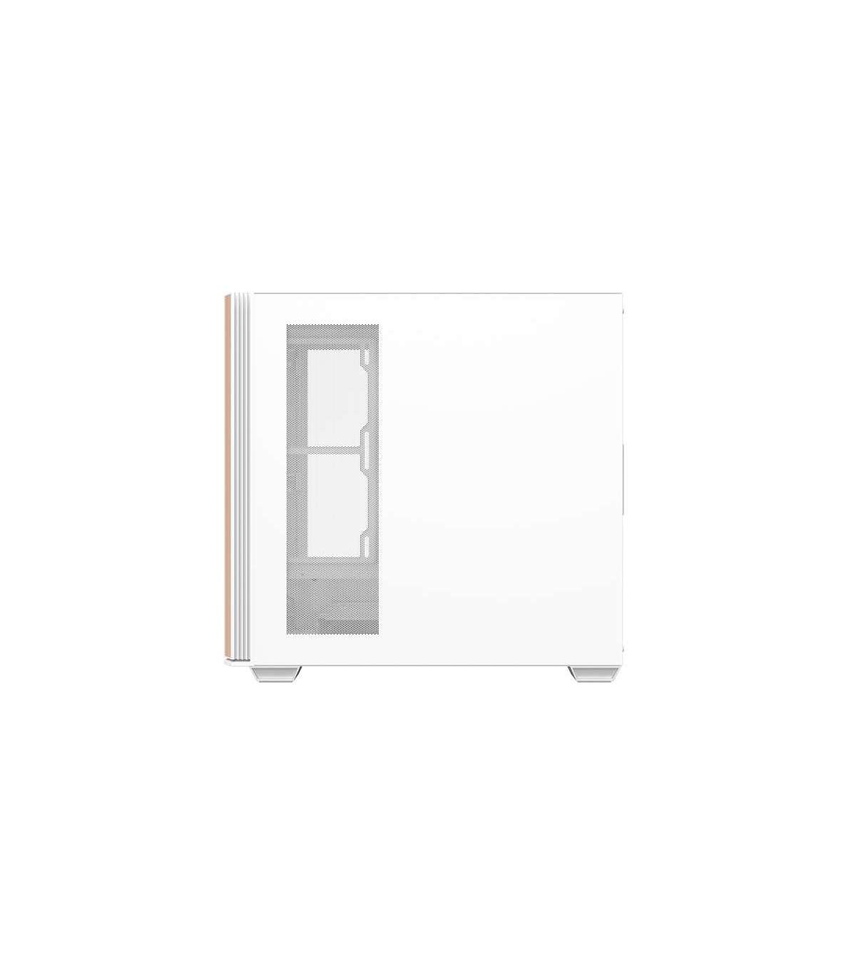 The left side of the case features a tempered glass panel to expose the computer's interior - including fan backlighting and components. An additional wood-style accent on the front adds a subtle but original touch.