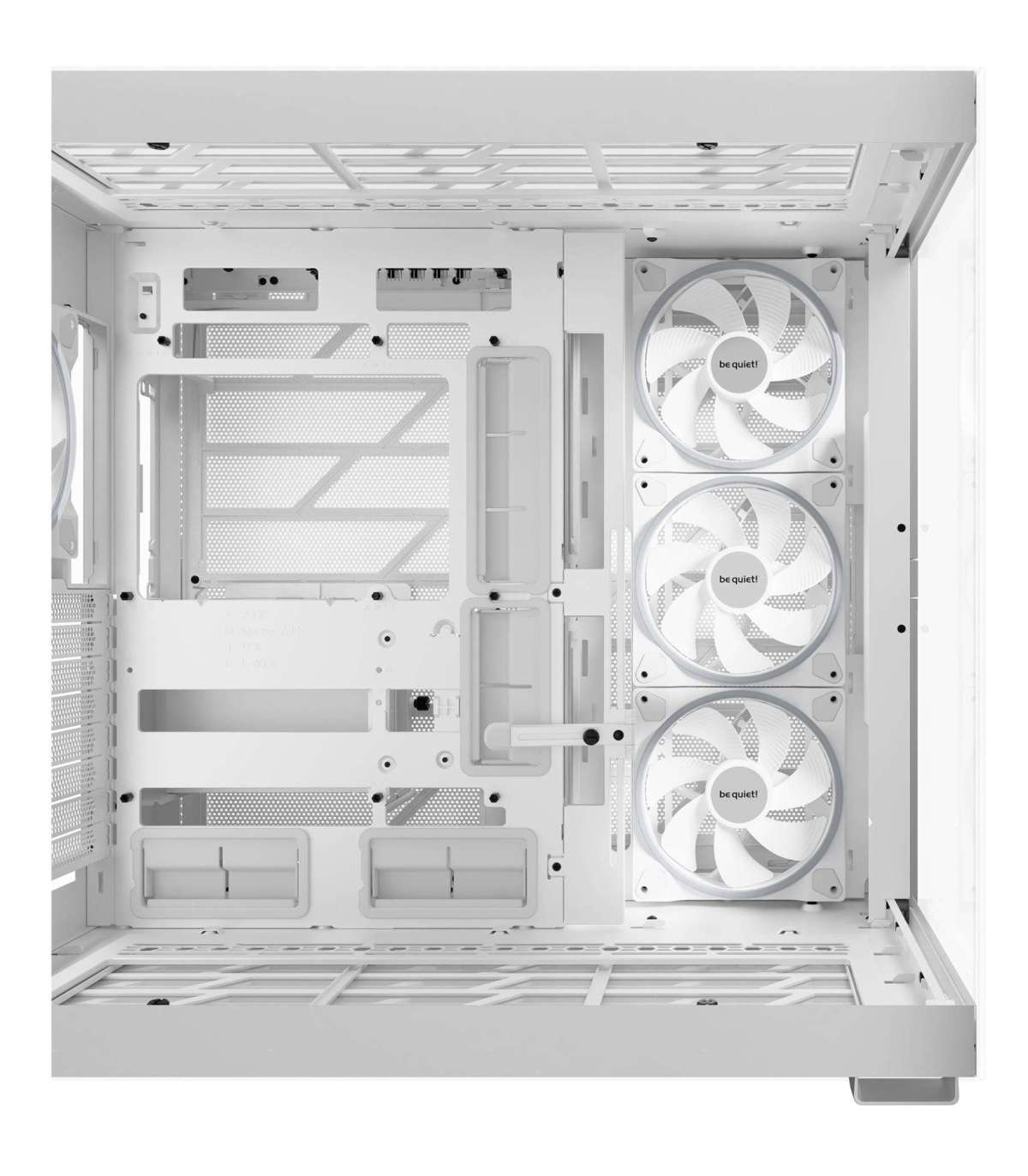 Light Base 900 DX White features no preinstalled fans. However, up to 10 fans can be installed in total, making Light Base 900 DX White extremely versatile. With its extra spacious design, it can hold up to 420mm radiators simultaneously, an E-ATX motherboard and even the most powerful graphics cards. Thanks to the two-chamber design, drives and cables are neatly tucked in the back and do not get in the way of airflow.