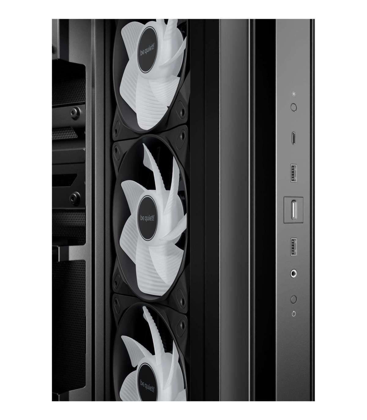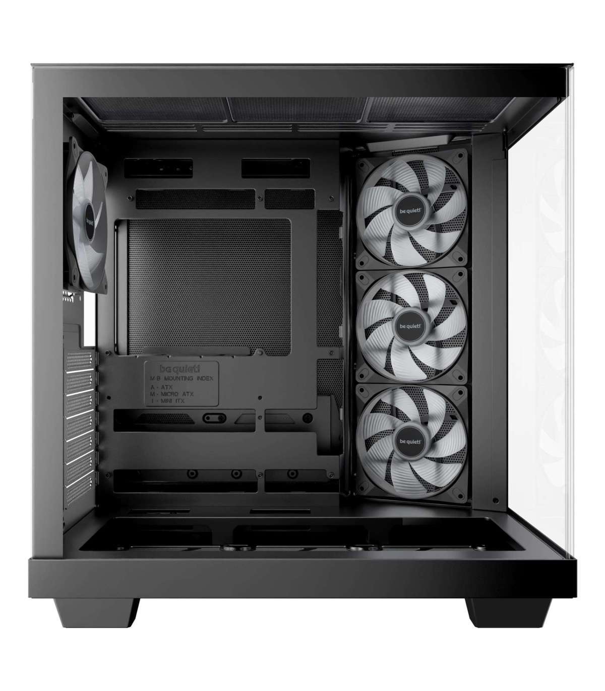 Light Base 500 LX Black features 4 preinstalled Light Wings LX fans. The rear fan is a Light Wings LX 120mm, the fans on the side are Light Wings LX 120mm PWM fans with reversed fan blades. All fans feature 16 LEDs inside their hub of the impeller, making for an unmistakable ARGB illumination. The reversed fan blades make sure that their pretty side is visible at all times.