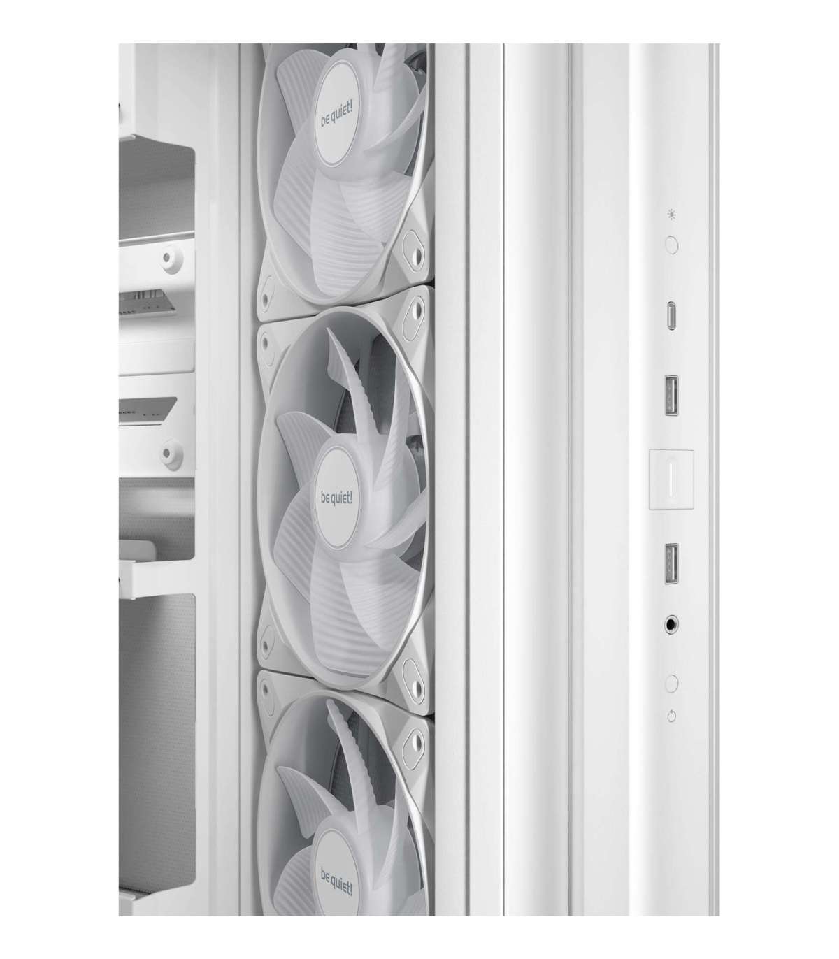 Light Base 500 LX White features 4 preinstalled Light Wings LX fans. The rear fan is a Light Wings LX 120mm White, the fans on the side are Light Wings LX 120mm PWM White fans with reversed fan blades. All fans feature 16 LEDs inside their hub of the impeller, making for an unmistakable ARGB illumination. The reversed fan blades make sure that their pretty side is visible at all times.