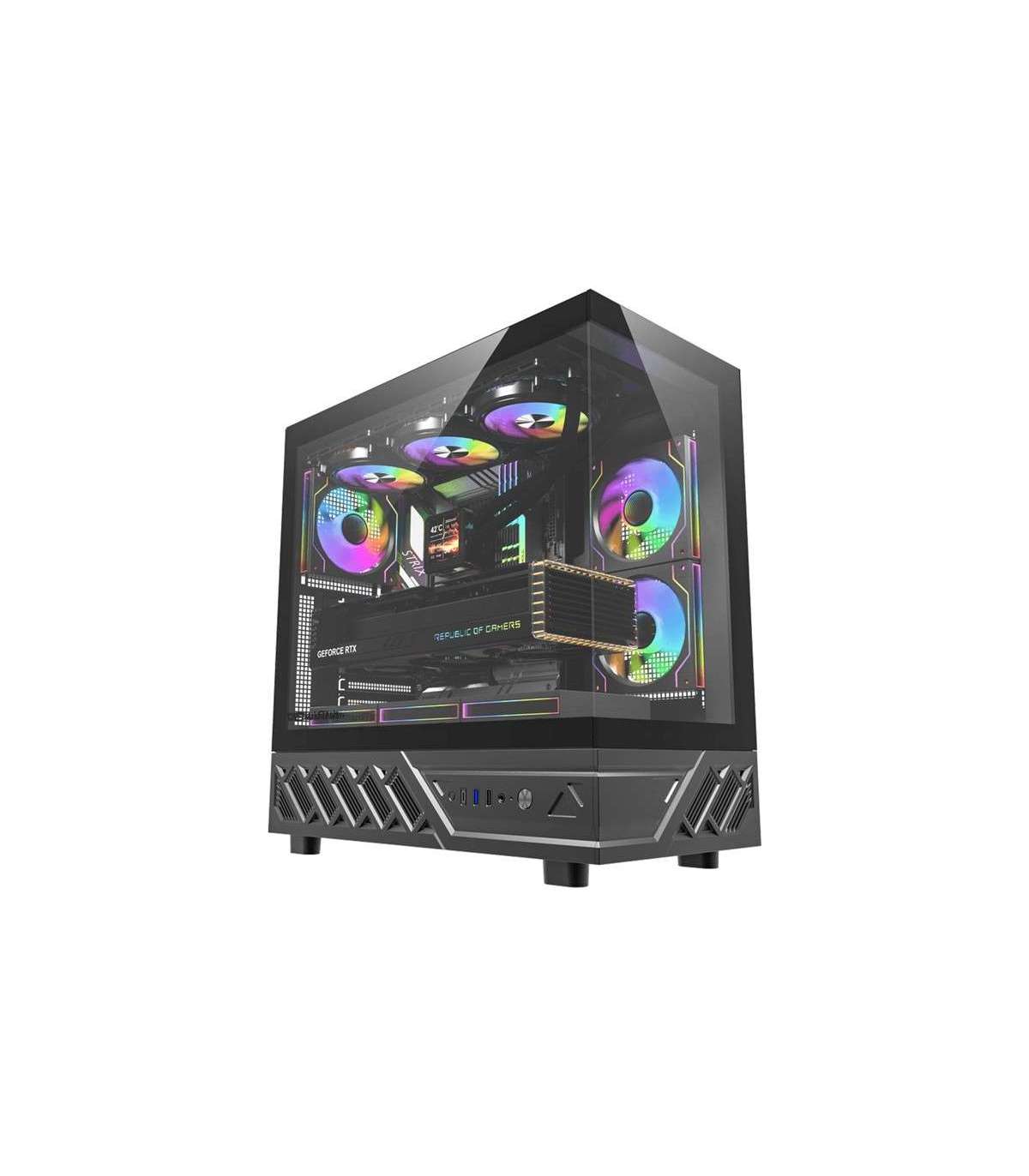 The case is equipped with two transparent panels without a vertical profile, providing a wide view of the components. This design allows for interesting visual effects – for example, you can showcase RGB fans or water cooling with a display. Give your computer a unique character!