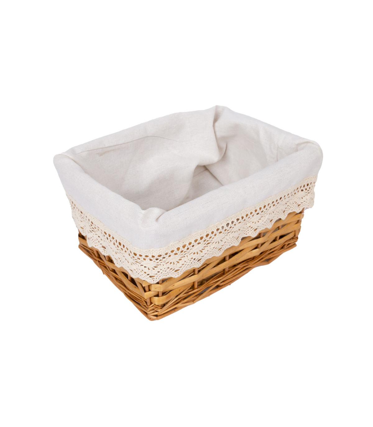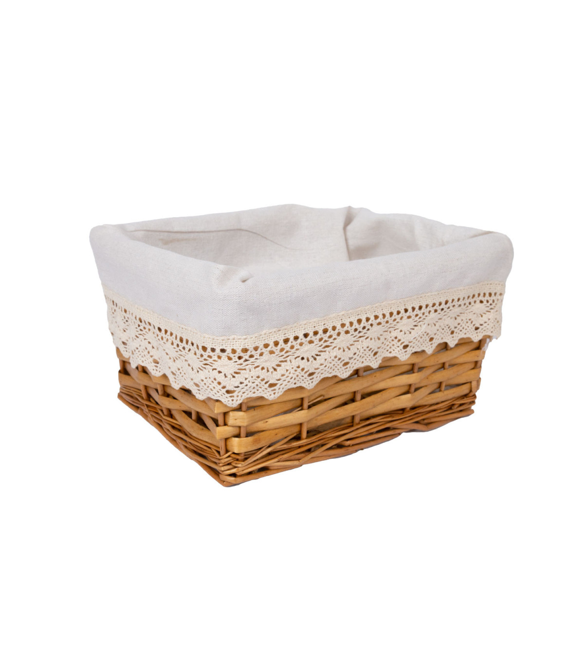 Korv MAX, 24x18xH12cm, helepruun, pitsiga. Korvi materjal: naturaalne korvipaju, lakitud. Tekstiilvooder: puuvillane pitsiga.