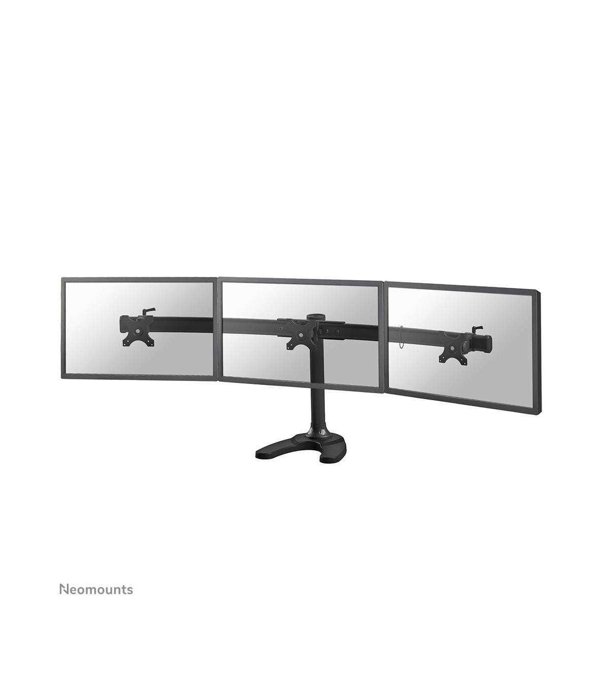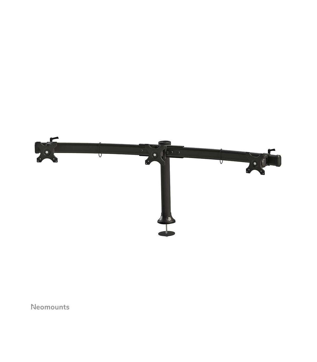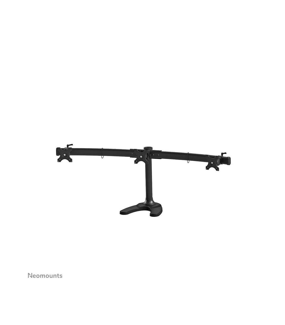 The NewStar desk mount, model FPMA-D700DD3 is a tilt- and rotatable desk mount for 3 flat screens up to 27”. This mount is a great choice for space saving placement on desks using a desk stand or grommet mount.