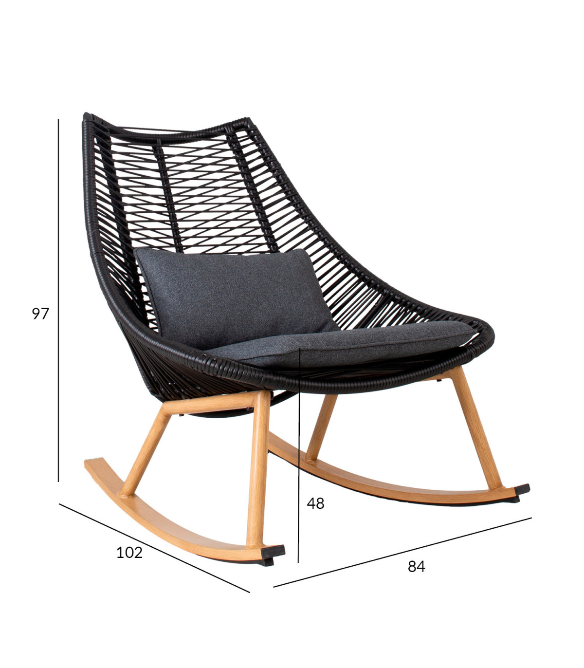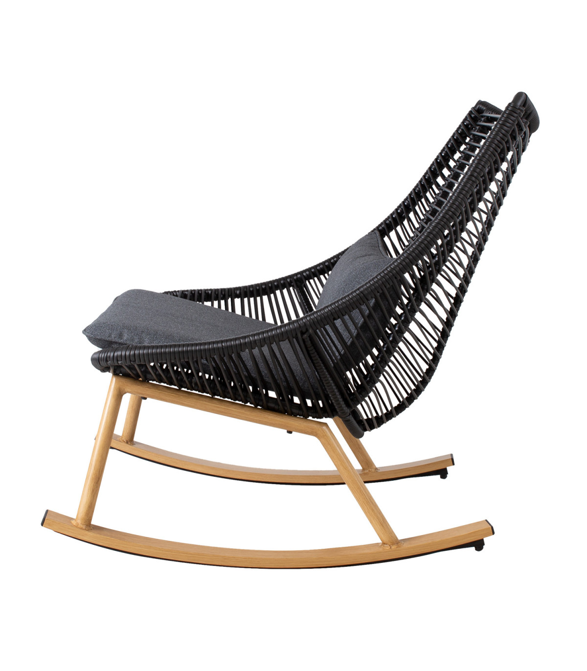 Сидения кресла-качалки покрыты плетеным пластиком из черной веревки, окрашенными ножками из тикового дерева и каркасом. Подушка в комплекте. Ткань подушки: темно-серая полиэфирная ткань.