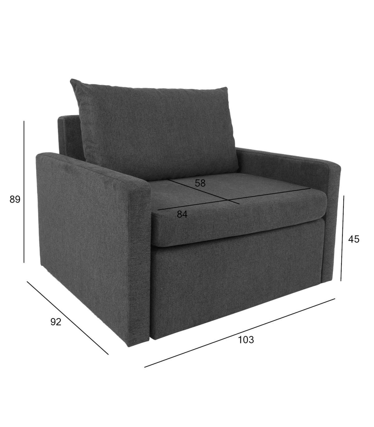 Кресло / кровать COLOGNE, 103x92x89см, 1 подушка. Размер спальной зоны: 85х195см, высота сиденья 45см. Материал покрытия: ткань темно-серая CHICAGO-97, 94% полиэстер / 6% нейлон, водоотталкивающий, мартиндейл: 100 000. Каркас и подвеска: деревянный каркас. Обивка: пенополиуретан.