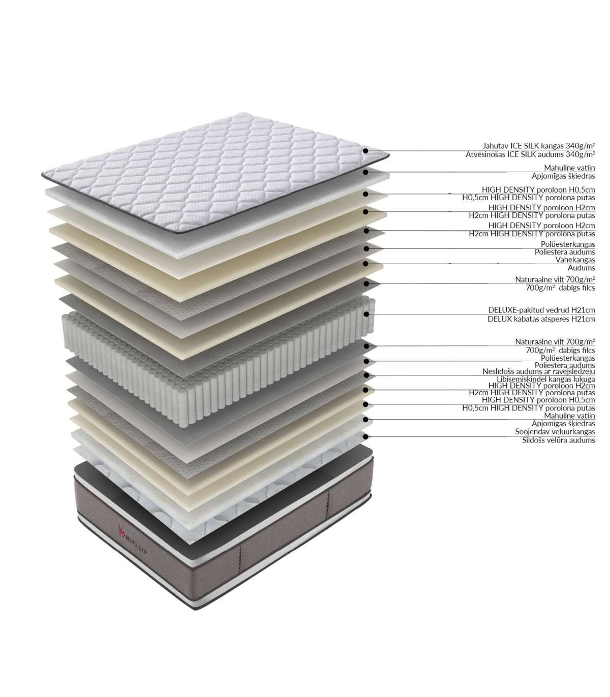 Vedrustus: DELUXE-pakitud vedrud 2,3mm/jäik, kõrgus 21cm. Vedruploki mõlemad pooled on kaetud 700g/m2 naturaalse vildikihiga.