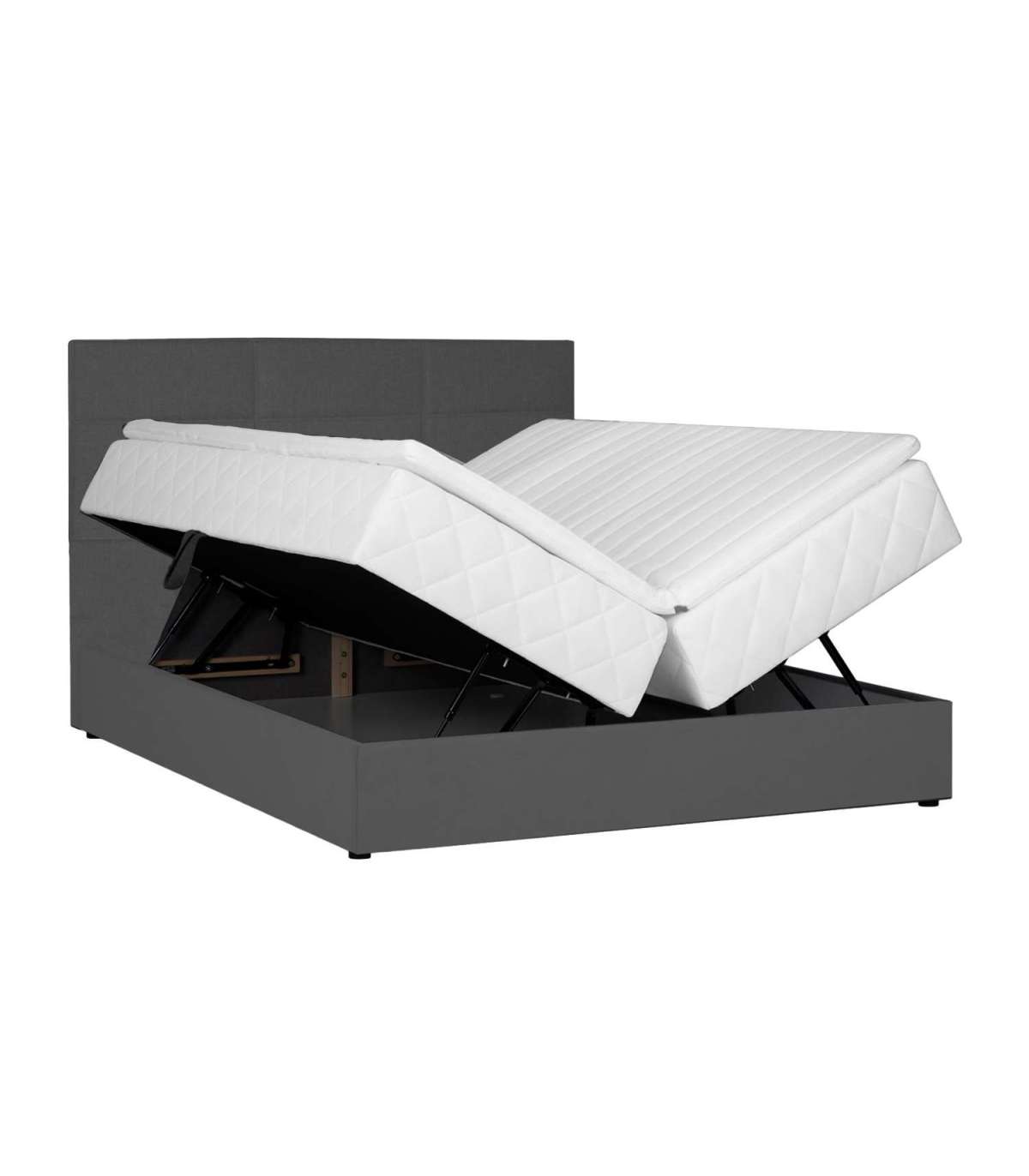 Voodil on pocket-vedrustusega madrats, 210 vedru/m2. Vedrude kõrgus on 13cm. Vedrusid katab 23kg/m3 poroloonikiht, mis on 2cm paks. Madratsi jäikus: jäik. Kattemadratsi sisuks on 23kg/m3 poroloon. Kattemadrats on kaetud 200g/m2 polüestervatiiniga. Voodi all on mahukas panipaik, mis on valmistatud täispuidust ja lamineeritud puitlaastplaadist. Selle küljed on kaetud porolooniga. Voodi karkass on valmistatud täispuidust. Voodiraam on kaetud kangaga, 30 000 Martindale´i. Komplekti kuulub voodipeats, mis on voodiga sama lai. Peatsi paksus on 7cm. Kaasas on ühenduselemendid peatsi kinnitamiseks voodi külge. Voodil on neli plastikust jalga, mis on musta värvi. Voodijalgade kõrgus on 2,5cm, kattemadratsi kõrgus 4cm, madratsi kõrgus 16cm. Voodi magamispinna kõrgus on 52cm. Toote mõõdud on 163x210x114,5cm. Toode on valmistatud EL-is.