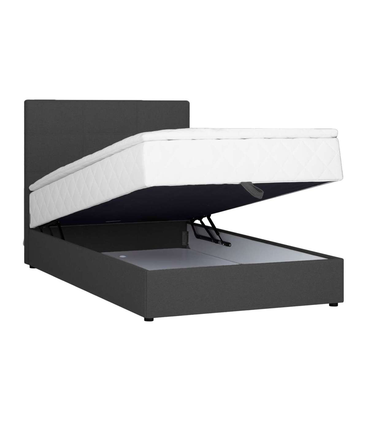 Voodil on pocket-vedrustusega madrats, 210 vedru/m2. Vedrude kõrgus on 13cm. Vedrusid katab 23kg/m3 poroloonikiht, mis on 2cm paks. Madratsi jäikus: jäik. Kattemadratsi sisuks on 23kg/m3 poroloon. Kattemadrats on kaetud 200g/m2 polüestervatiiniga. Voodi all on mahukas panipaik, mis on valmistatud täispuidust ja lamineeritud puitlaastplaadist. Selle küljed on kaetud porolooniga. Voodi karkass on valmistatud täispuidust. Voodiraam on kaetud kangaga, 30 000 Martindale´i. Komplekti kuulub voodipeats, mis on voodiga sama lai. Peatsi paksus on 7cm. Kaasas on ühenduselemendid peatsi kinnitamiseks voodi külge. Voodil on neli plastikust jalga, mis on musta värvi. Voodijalgade kõrgus on 2,5cm, kattemadratsi kõrgus 4cm, madratsi kõrgus 16cm. Voodi magamispinna kõrgus on 52cm. Toote mõõdud on 143x210x114,5cm. Toode on valmistatud EL-is.