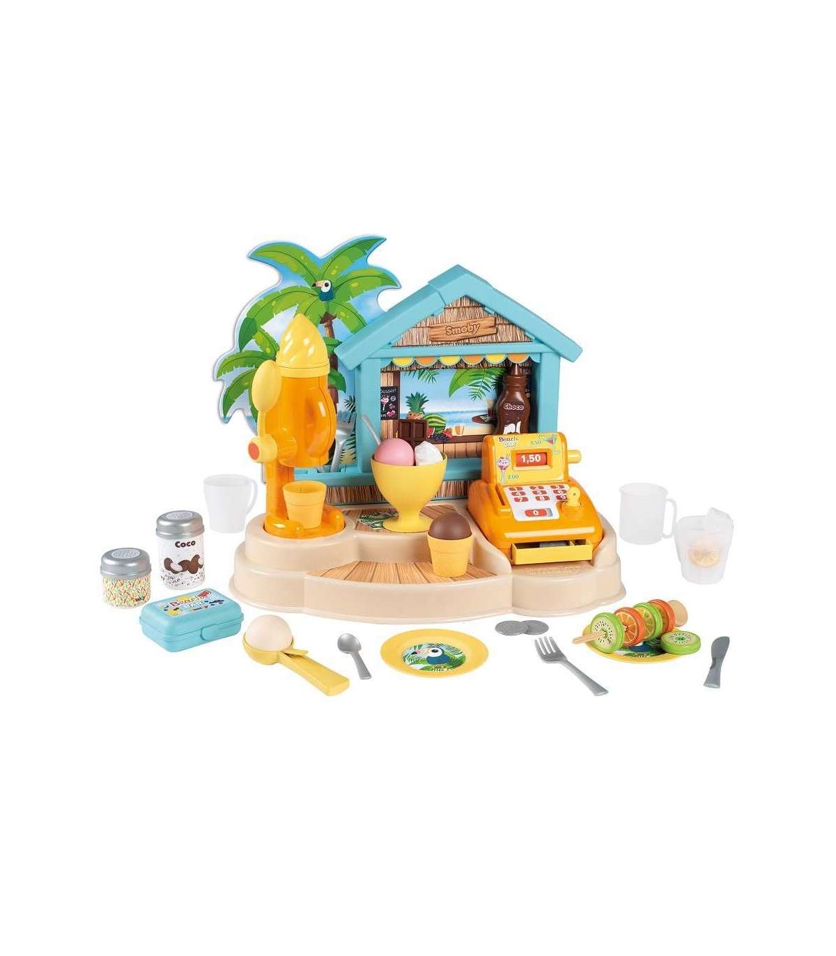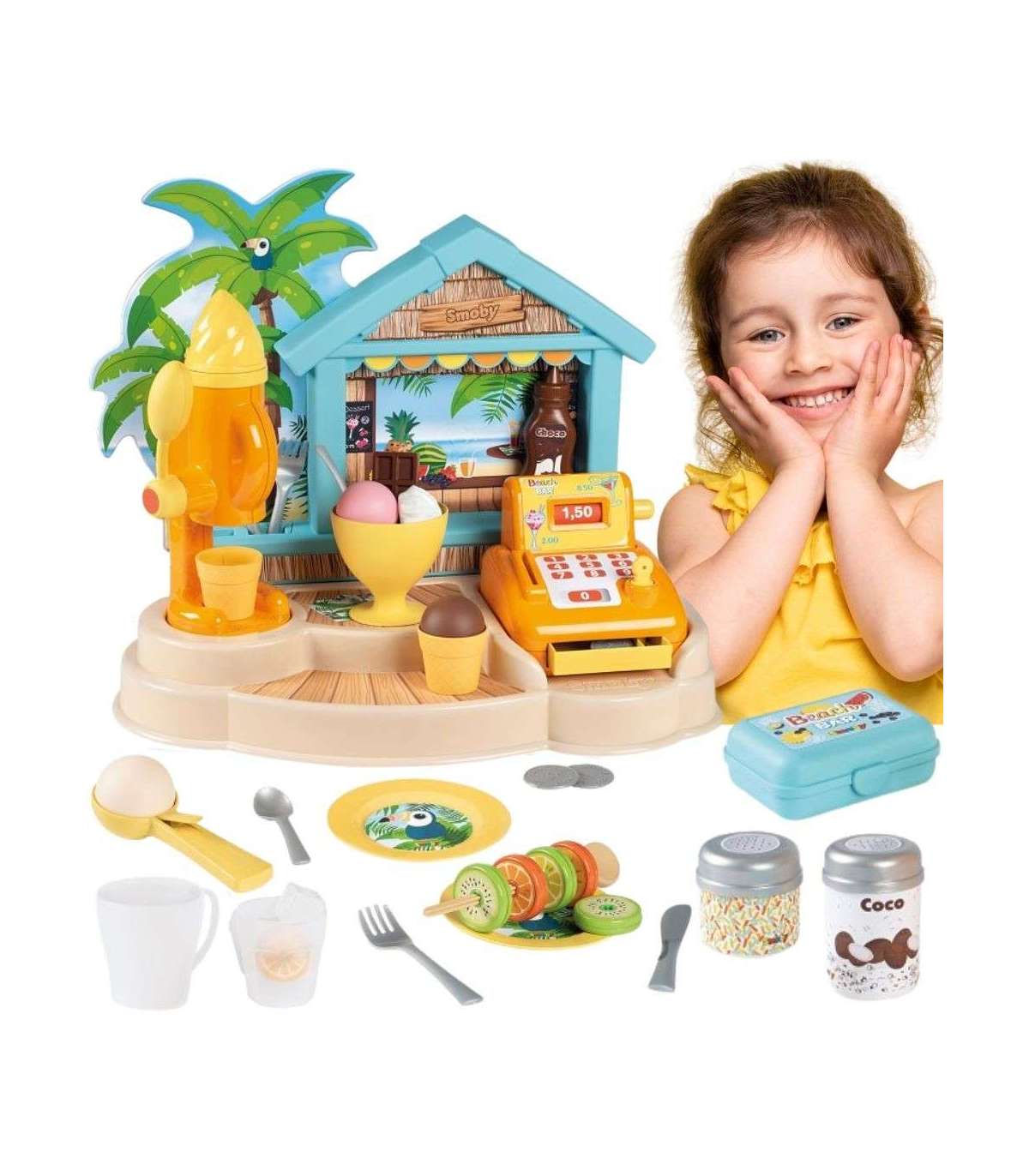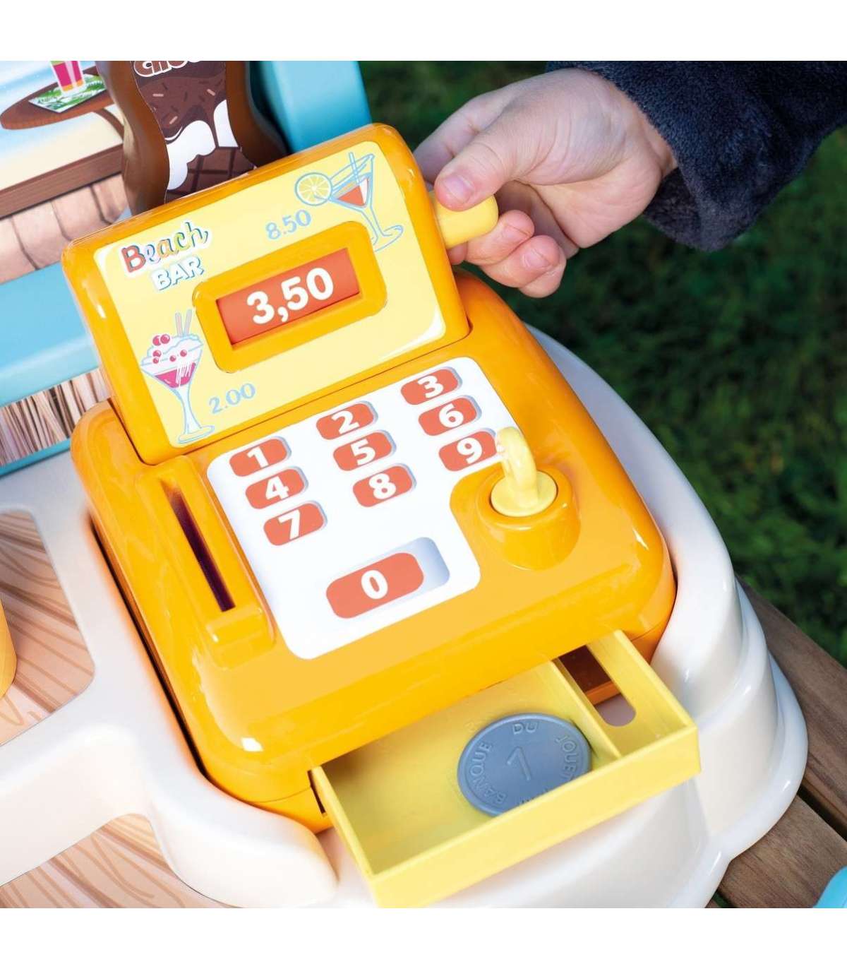 - Пляжный бар позволяет играть по-разному — дети могут готовить мороженое с соусом и посыпками, напитки, фруктовые шашлычки, а затем пробивать всё на кассе.