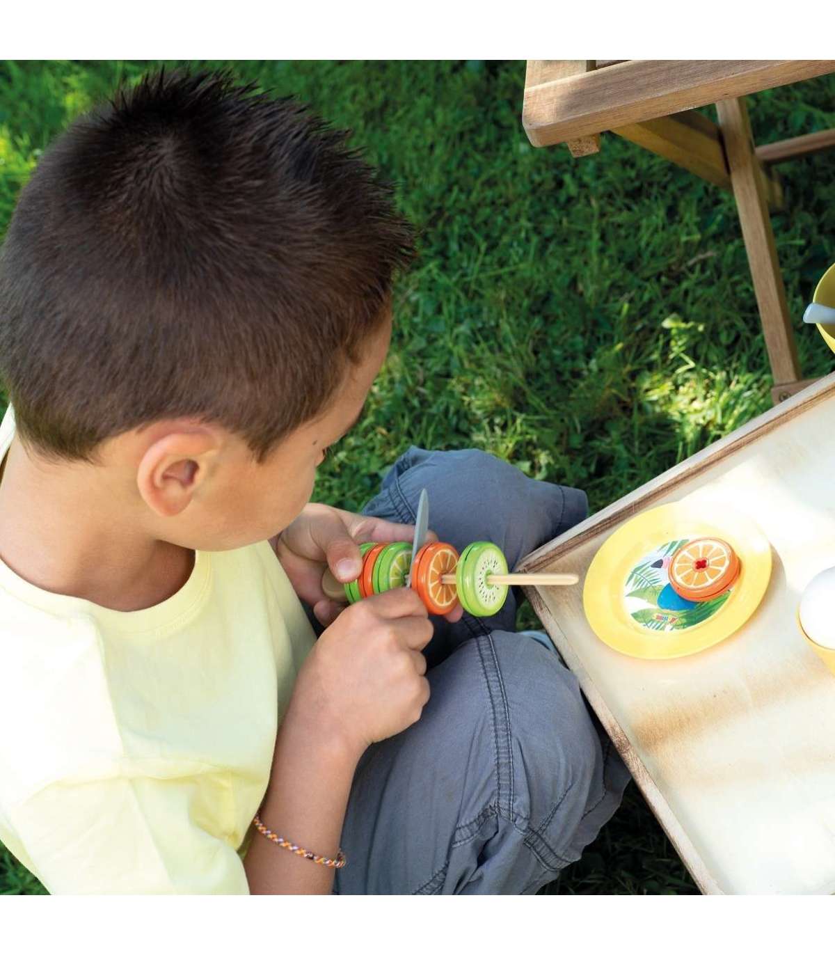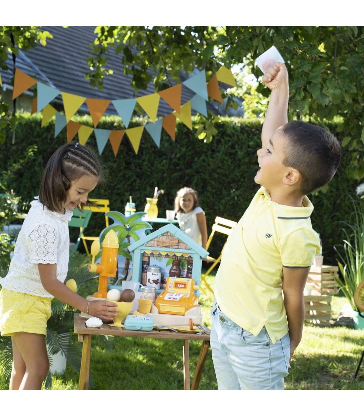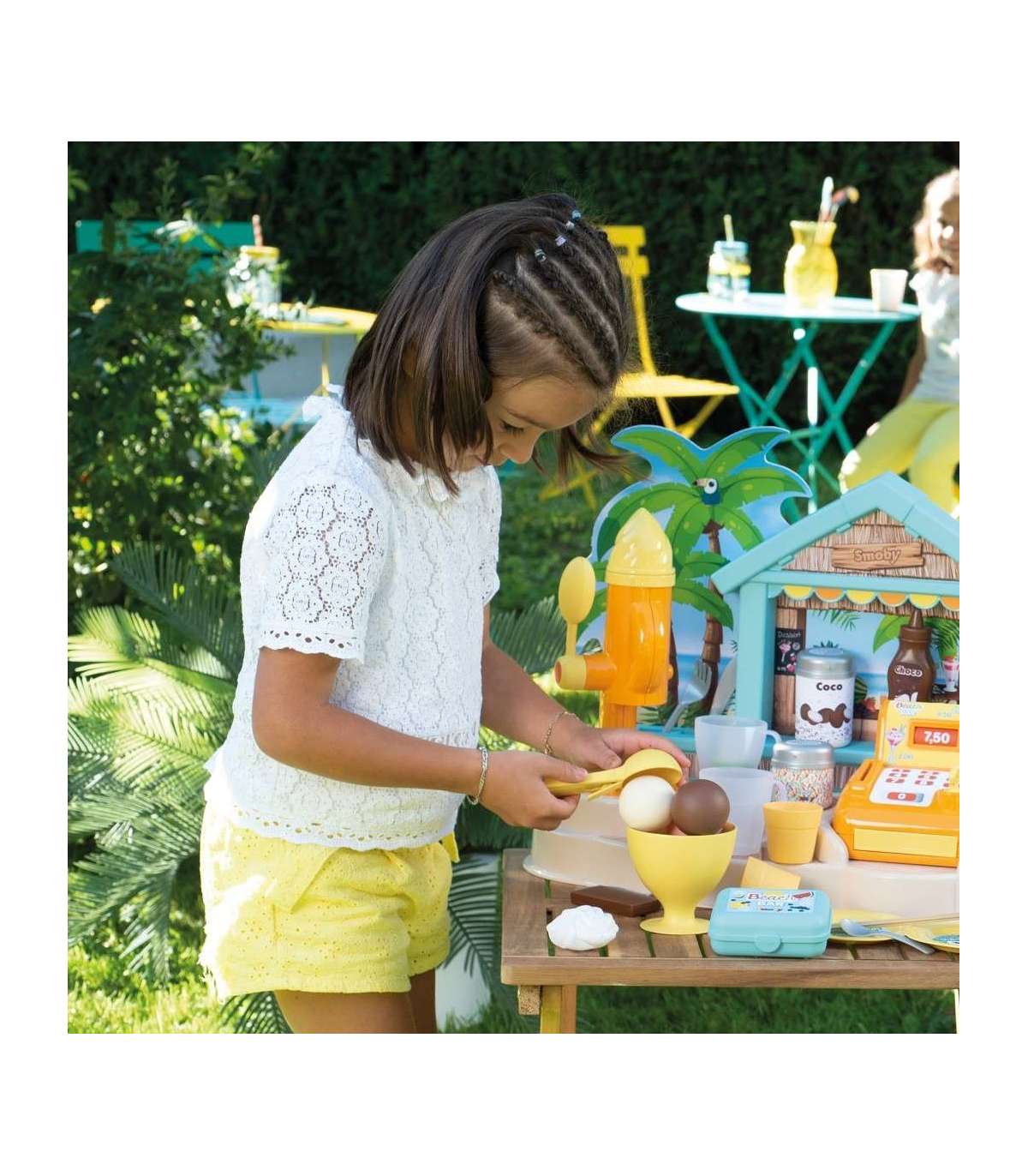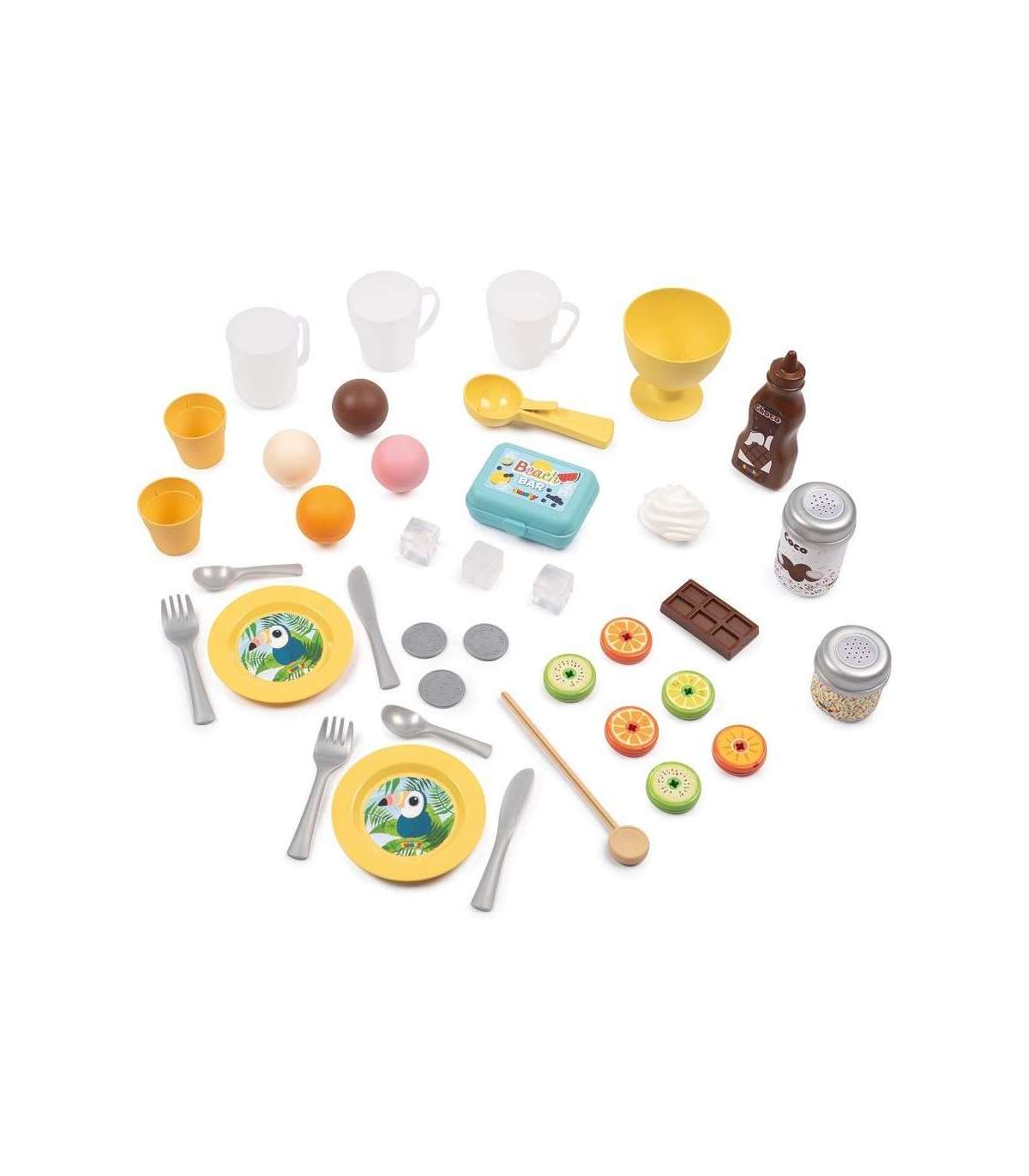 - Пляжный бар позволяет играть по-разному — дети могут готовить мороженое с соусом и посыпками, напитки, фруктовые шашлычки, а затем пробивать всё на кассе.
