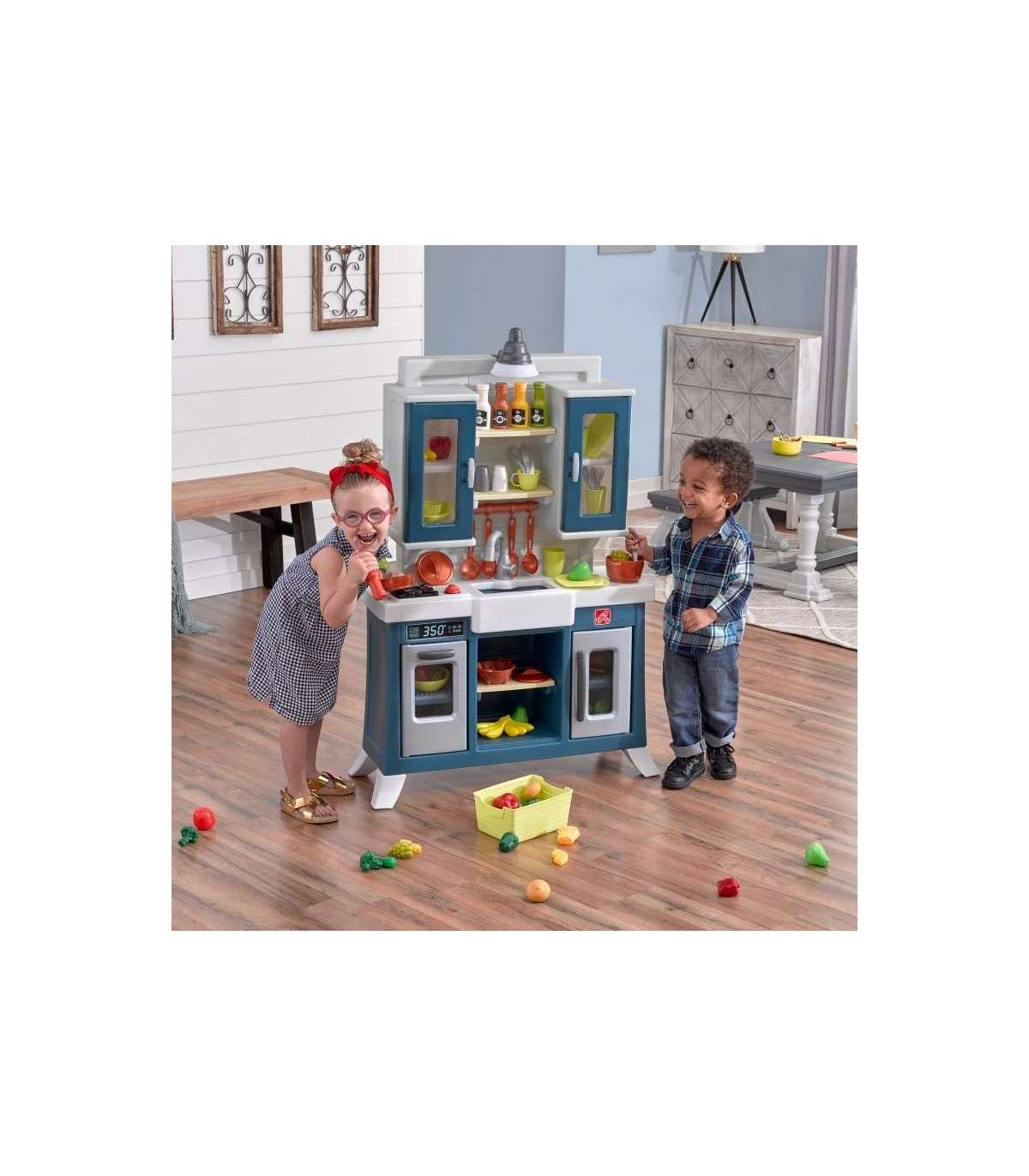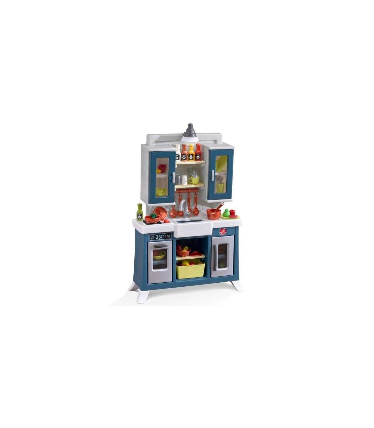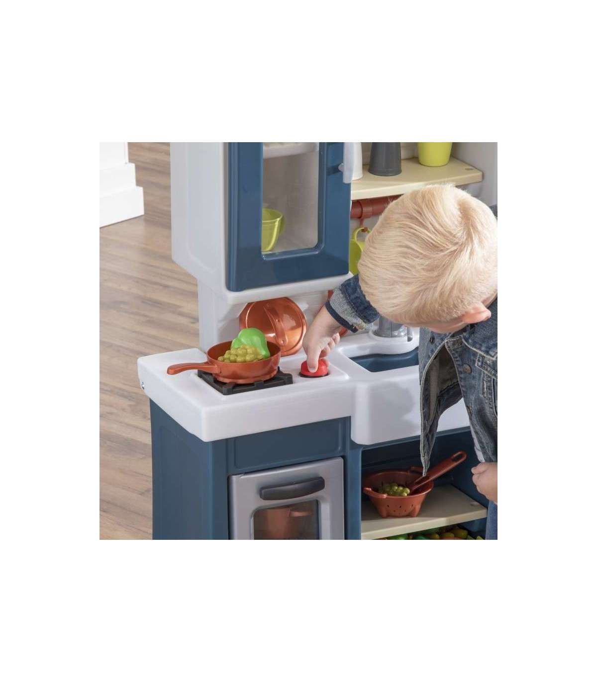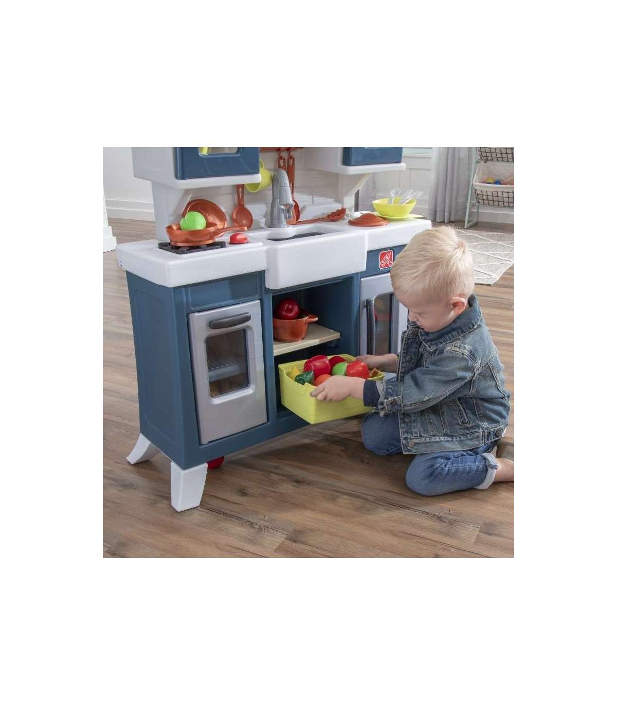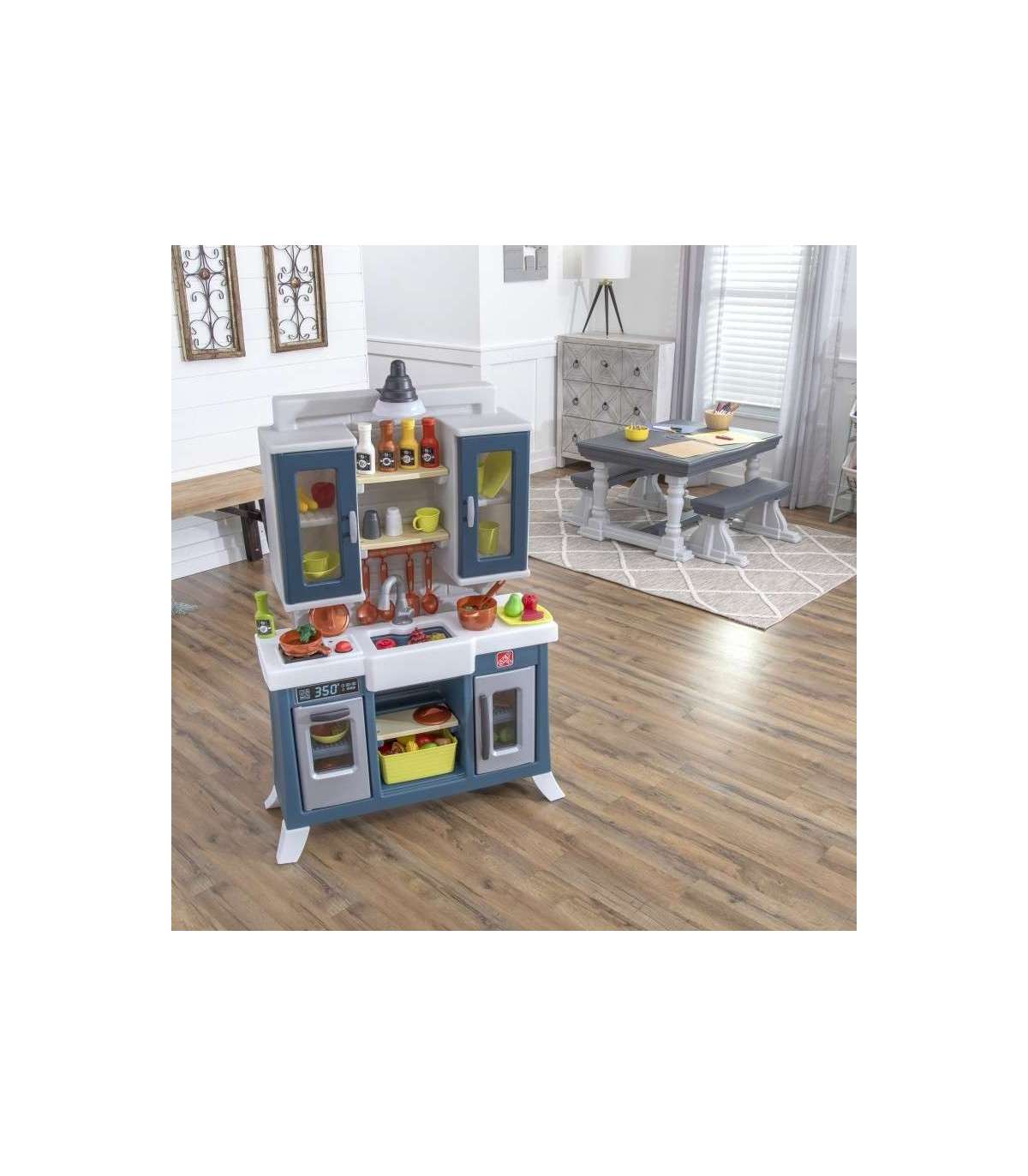 Детская игровая кухня Step2 характеризуется реалистичной деревенской эстетикой с современной функциональностью и большим количеством места для хранения! Готовьте блюда на большой искусственно-гранитной столешнице. Дотянитесь до верхних шкафчиков с полками для кружек и тарелок. В игрушке есть мойка в деревенском стиле с краном и реалистичный «медный» подвесной держатель для хранения. Эта кухня станет стильным дополнением любой игровой зоны. Электронная конфорка имеет забавные световые эффекты и реалистичные шипящие звуки, а работающая подвесная лампа над мойкой оживляет игру на кухне. Для работы требуются 2 батарейки AA и 2 AAA (не в комплекте).