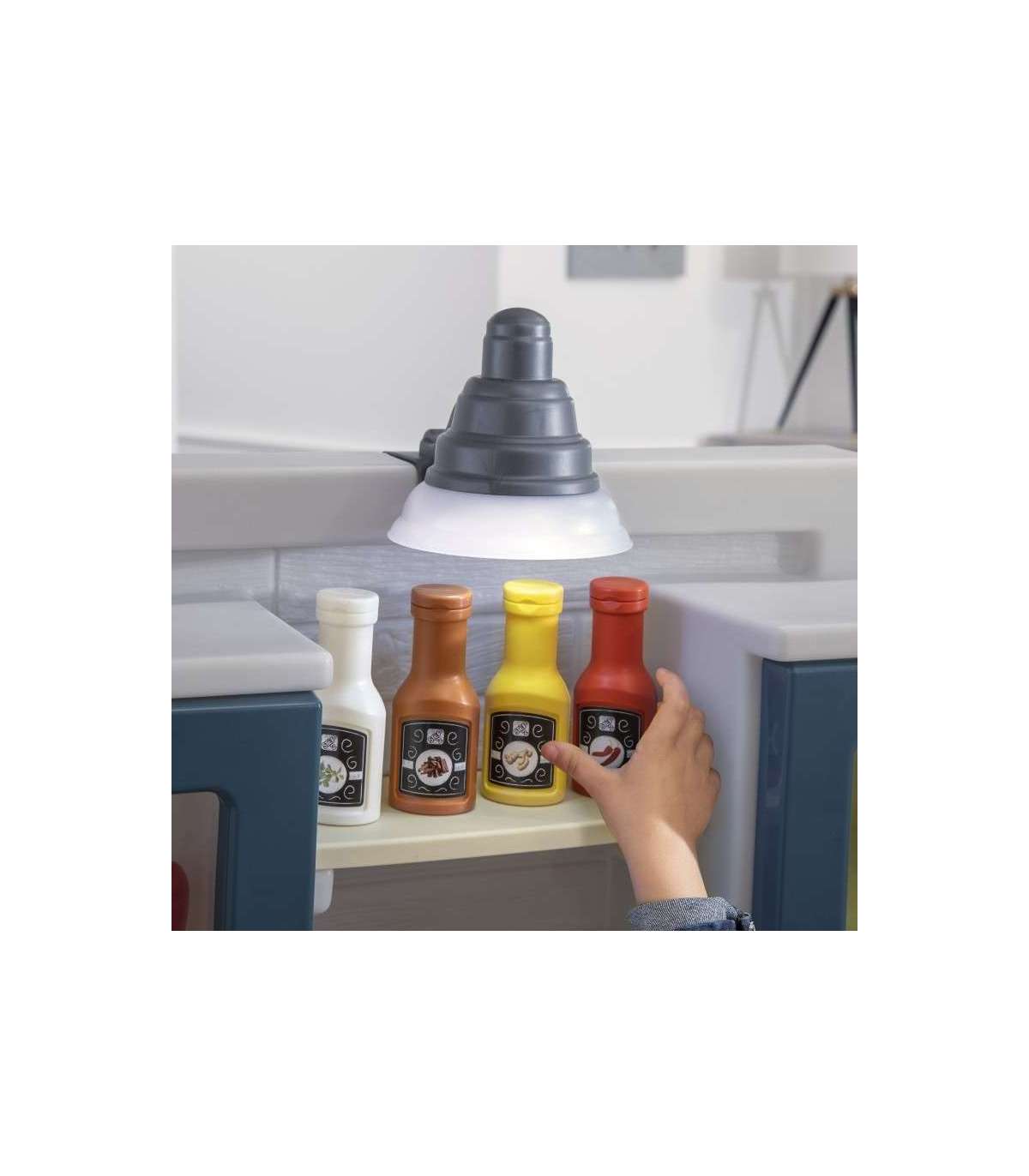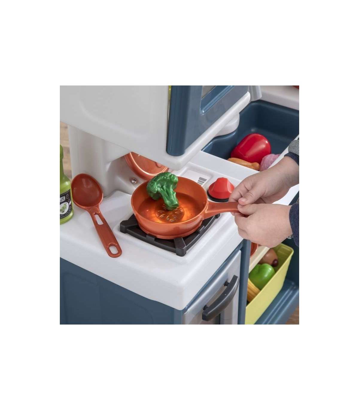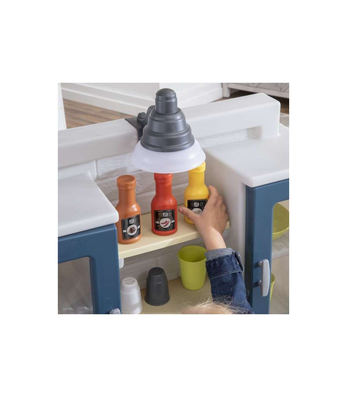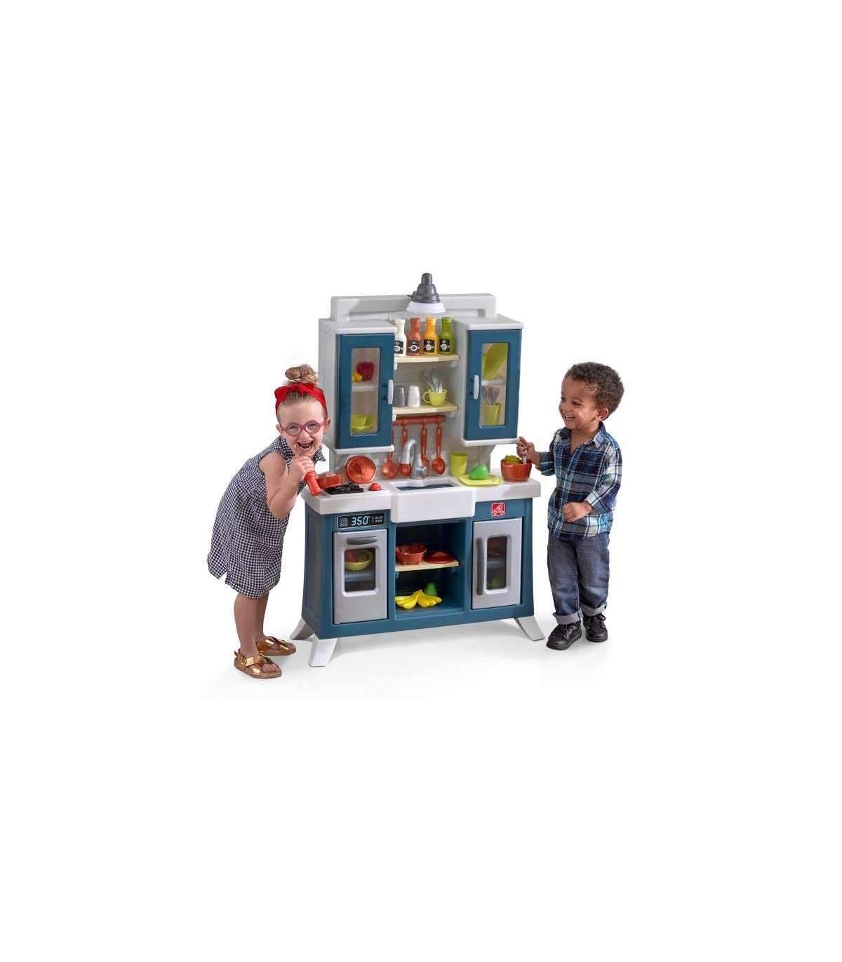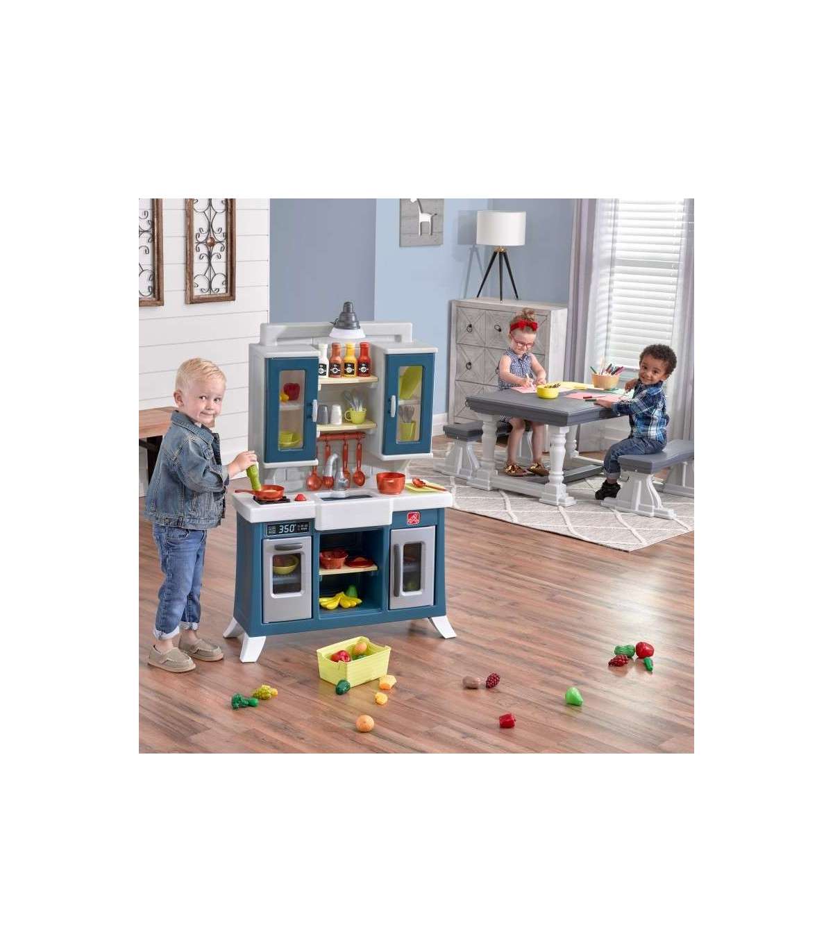 Детская игровая кухня Step2 характеризуется реалистичной деревенской эстетикой с современной функциональностью и большим количеством места для хранения! Готовьте блюда на большой искусственно-гранитной столешнице. Дотянитесь до верхних шкафчиков с полками для кружек и тарелок. В игрушке есть мойка в деревенском стиле с краном и реалистичный «медный» подвесной держатель для хранения. Эта кухня станет стильным дополнением любой игровой зоны. Электронная конфорка имеет забавные световые эффекты и реалистичные шипящие звуки, а работающая подвесная лампа над мойкой оживляет игру на кухне. Для работы требуются 2 батарейки AA и 2 AAA (не в комплекте).