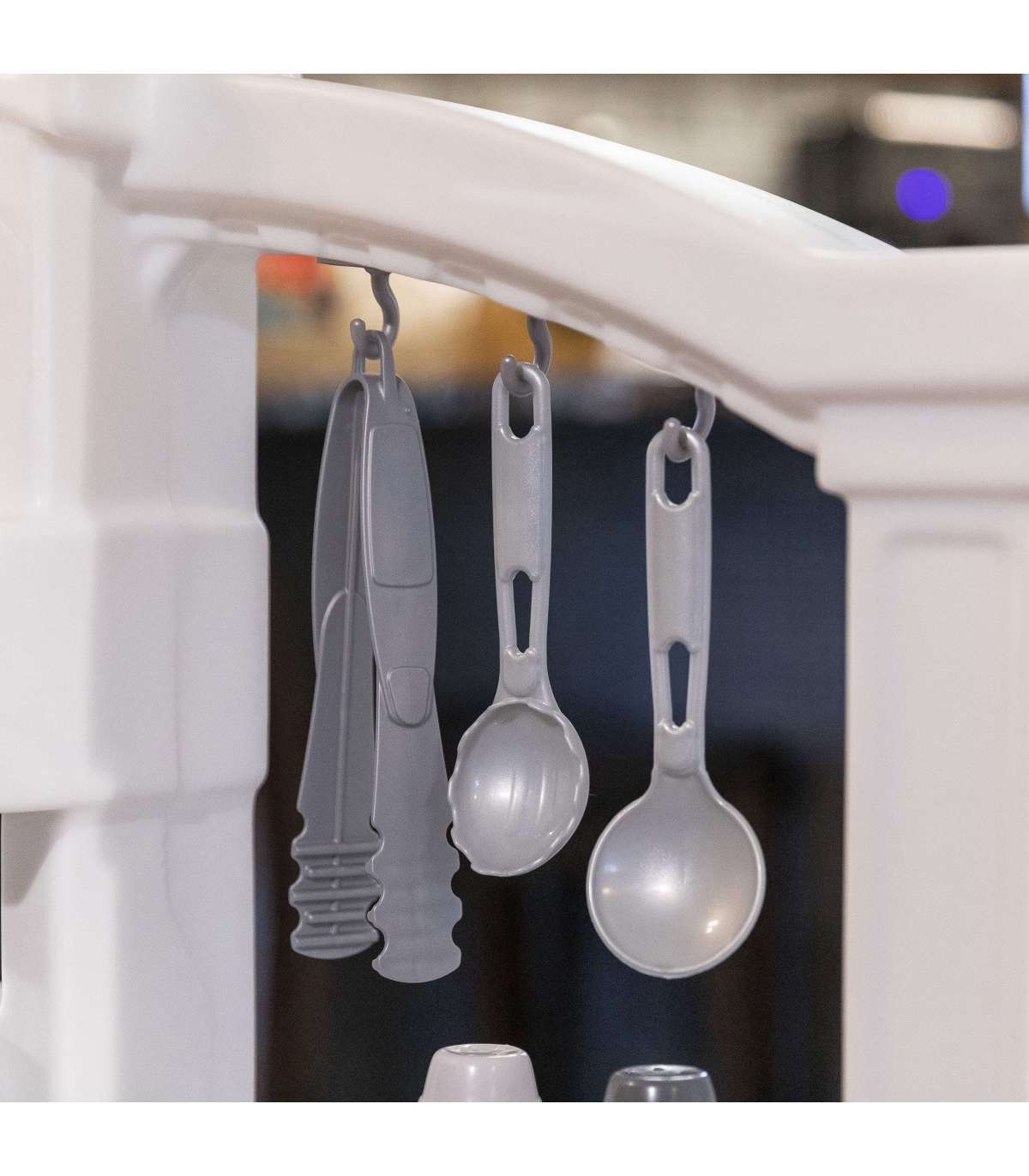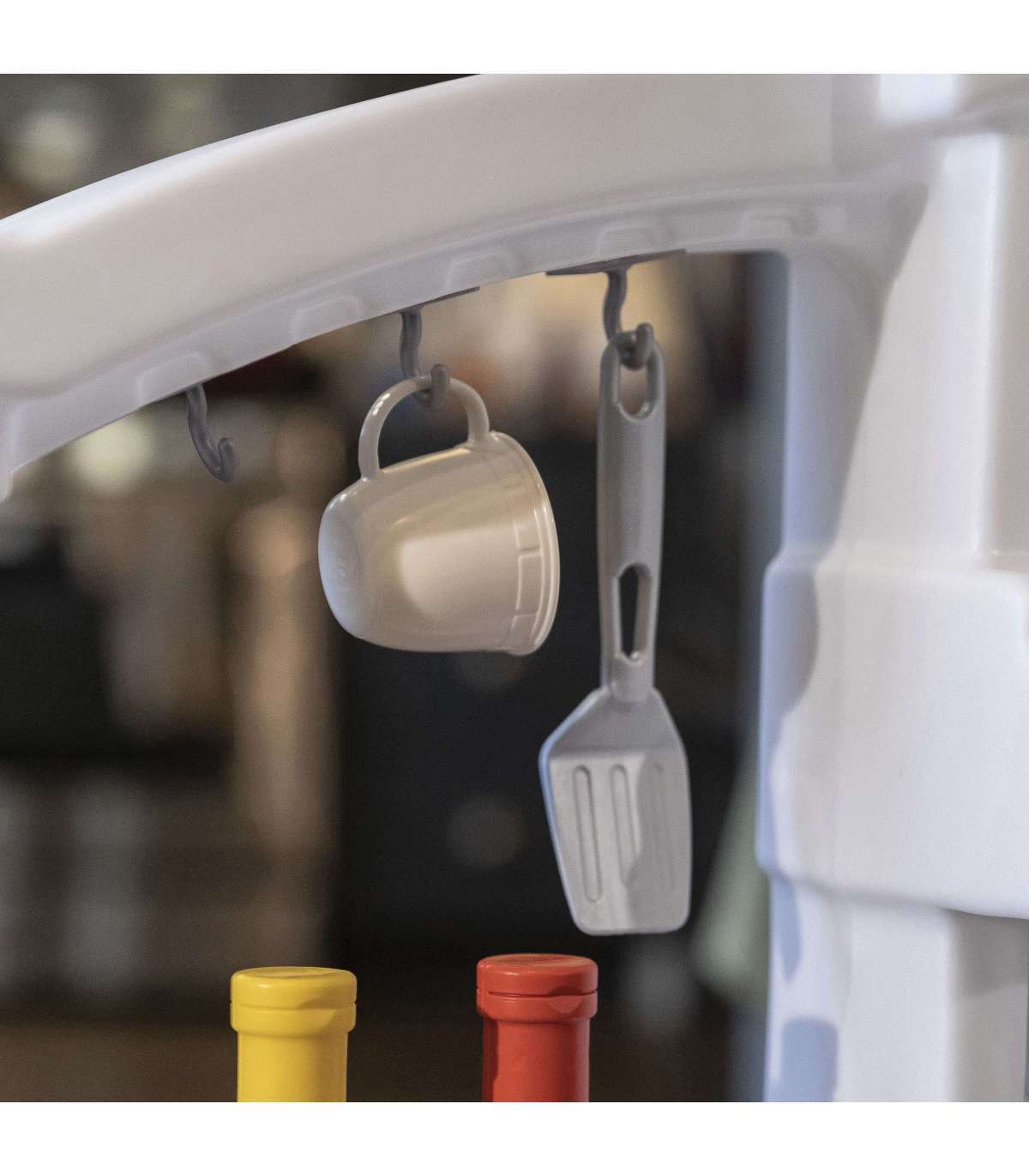 - - Mnóstwo wiszących schowków pozwala przechowywać sprzęt kulinarny w zasięgu ręki, a także uformowany stojak na naczynia, który pozwala zachować porządek.