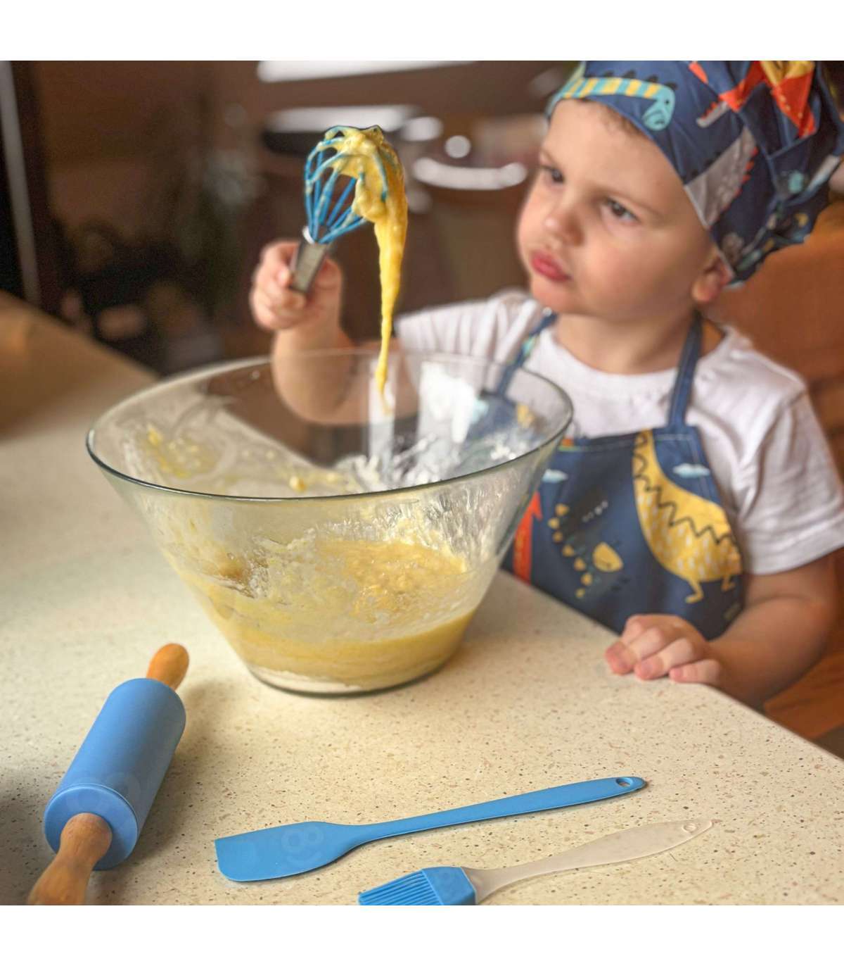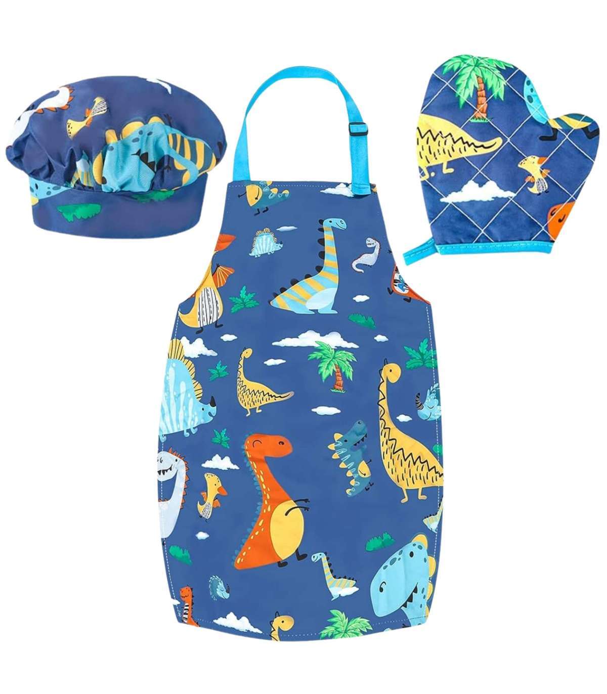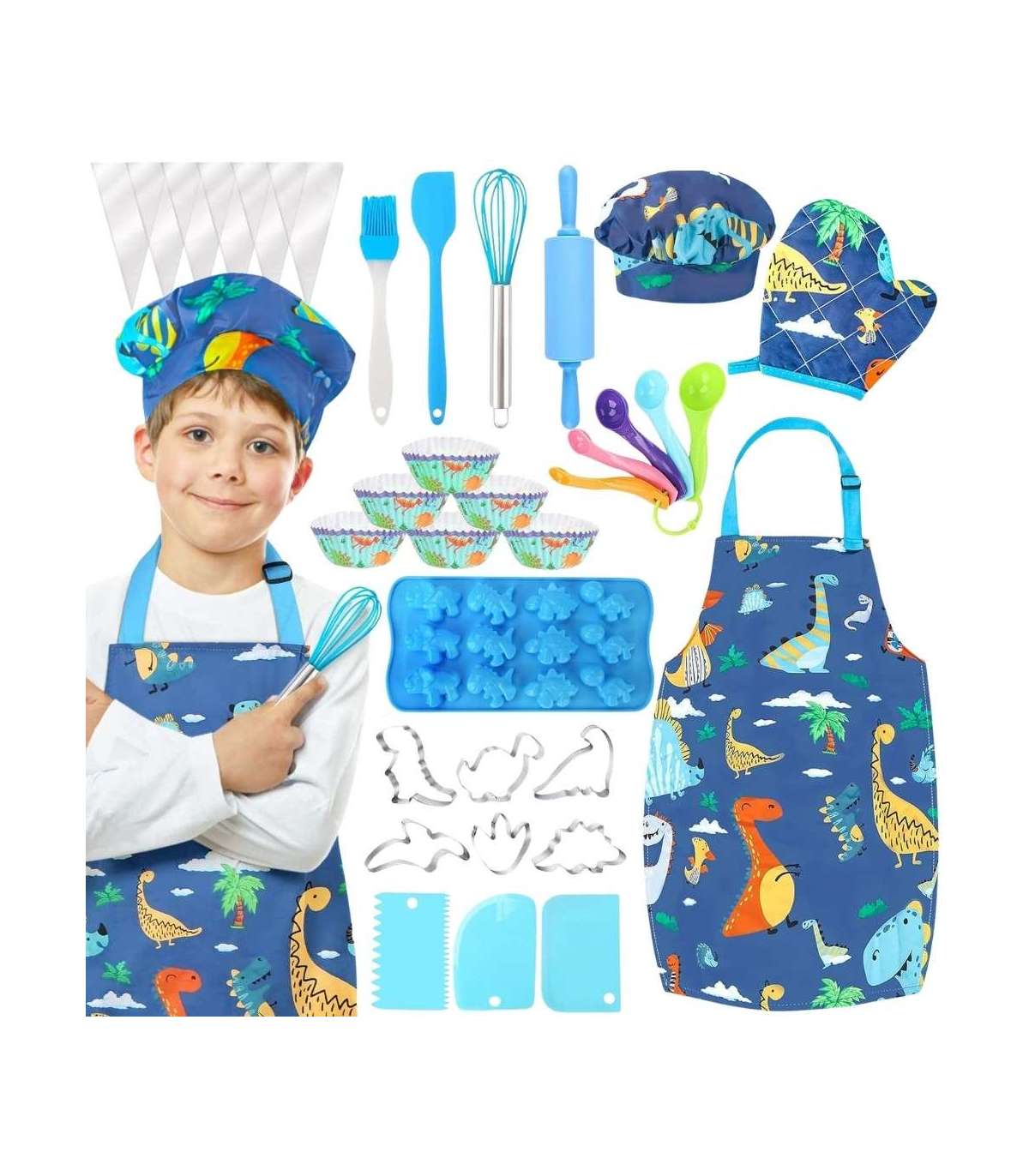 Przenieś zabawę do kuchni! Dino Zestaw Małego Kucharza marki WOOPIE to kolorowy zestaw akcesoriów kuchennych dla dzieci, który łączy naukę z kulinarną frajdą. Uroczy fartuszek i czapka z motywem dinozaurów, bezpieczne narzędzia oraz silikonowe foremki zachęcają do wspólnego gotowania. Regulowane paski, miękki materiał i lekkie przybory sprawiają, że zestaw jest wygodny i dopasowany do małych rączek.
