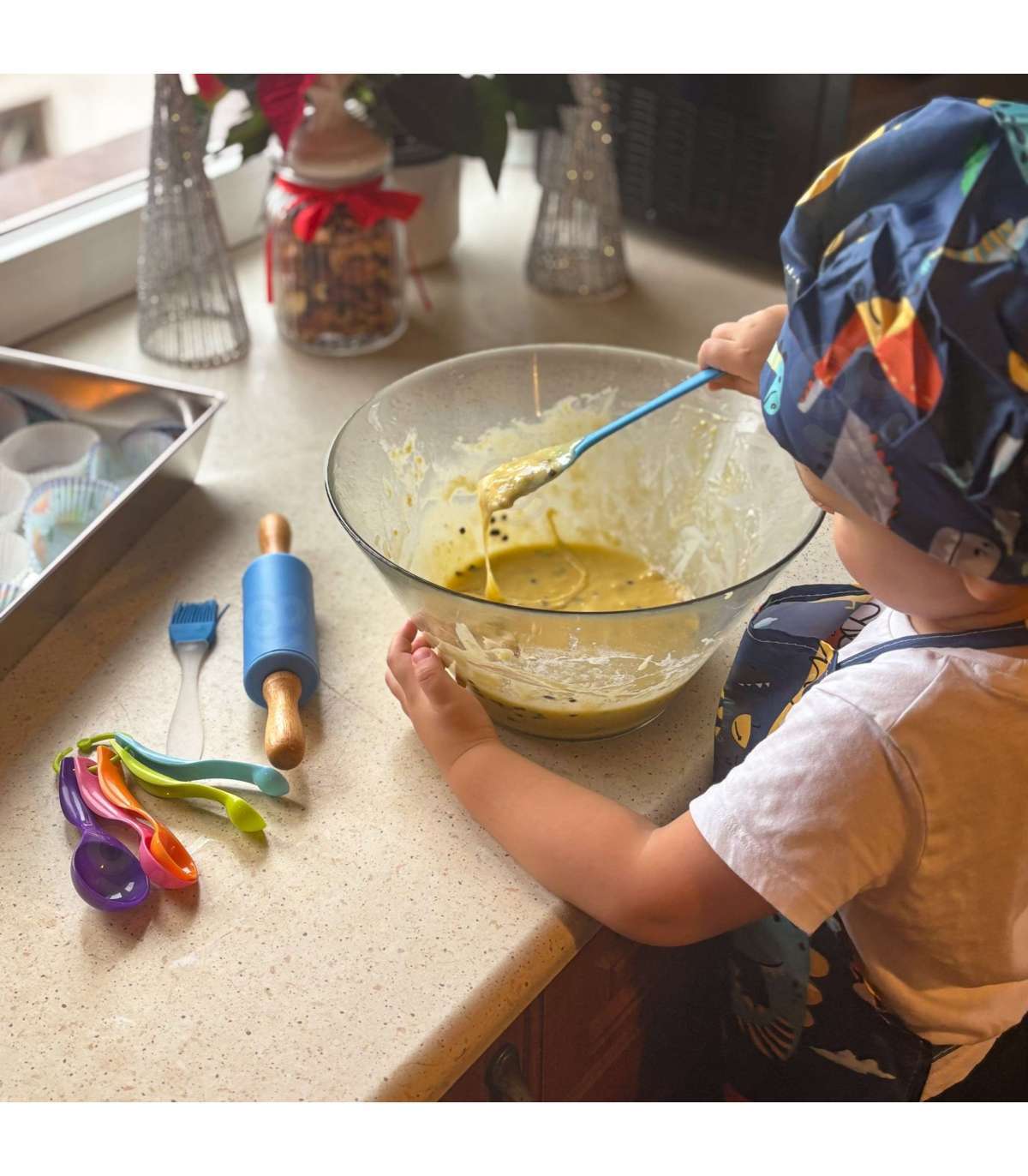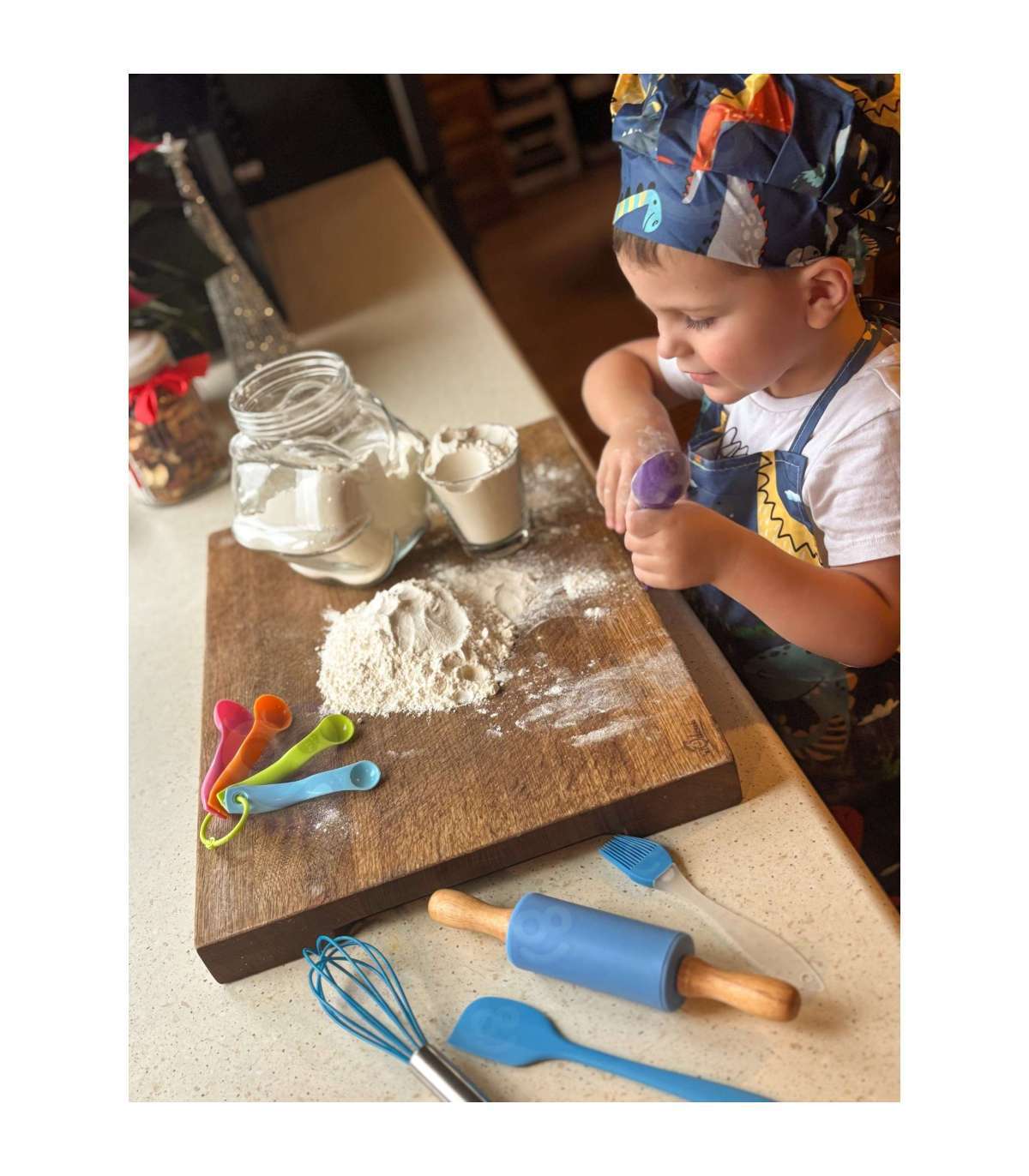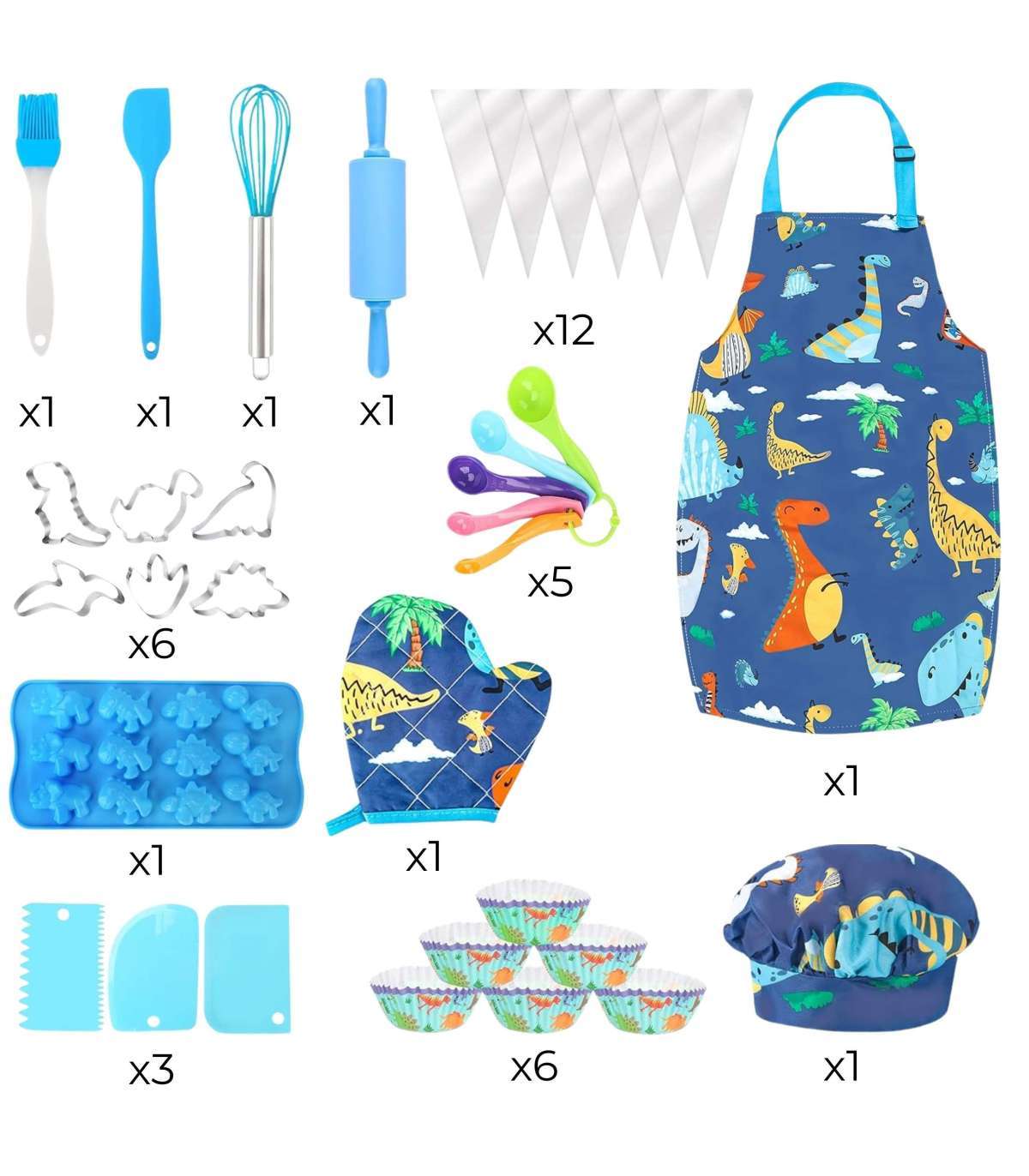 Przenieś zabawę do kuchni! Dino Zestaw Małego Kucharza marki WOOPIE to kolorowy zestaw akcesoriów kuchennych dla dzieci, który łączy naukę z kulinarną frajdą. Uroczy fartuszek i czapka z motywem dinozaurów, bezpieczne narzędzia oraz silikonowe foremki zachęcają do wspólnego gotowania. Regulowane paski, miękki materiał i lekkie przybory sprawiają, że zestaw jest wygodny i dopasowany do małych rączek.