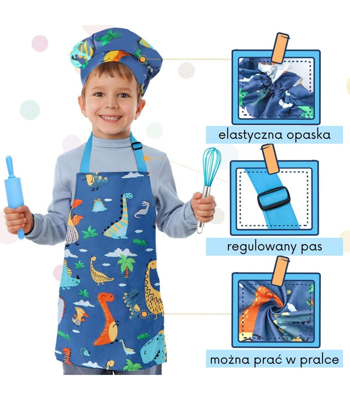 - - Fartuszek z regulowanym paskiem oraz czapka z elastyczną gumką dopasują się do każdego wzrostu