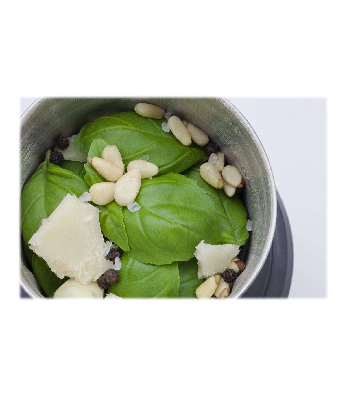 Container with 2-bladed stainless steel fly cutter: Perfect as a grinder for coffee, dried herbs / spices. Container with 4-bladed stainless steel cutter: Ideal as a chopper and grinder for nuts, onions, vegetables, fruit, etc.
