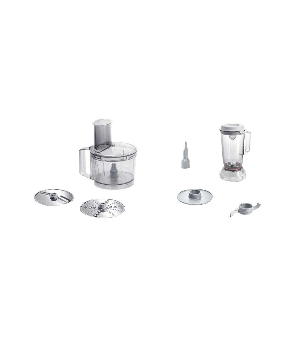1 x Lid, 1 x Plastic mixing bowl 500g, 1 x Plastic blender attachment, 1 x Reversible shredding disc coarse/fine, 1 x Beating disc, 1 x Reversible slicing disc thick/thin, 1 x Pusher, 1 x Universal knife, 1 x Accessory carrier, 1 x Blade protection cap
