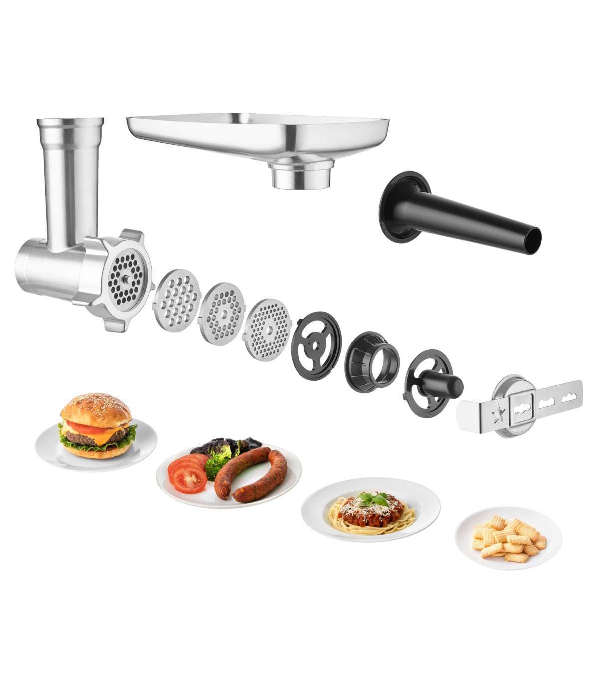 The metal meat grinder has interchangeable cutting discs for fine, regular, and coarse grinding, and 2 attachments for filling sausages or making kebabs.