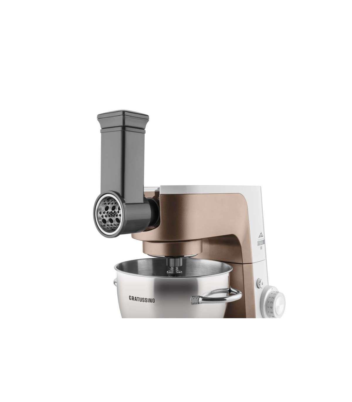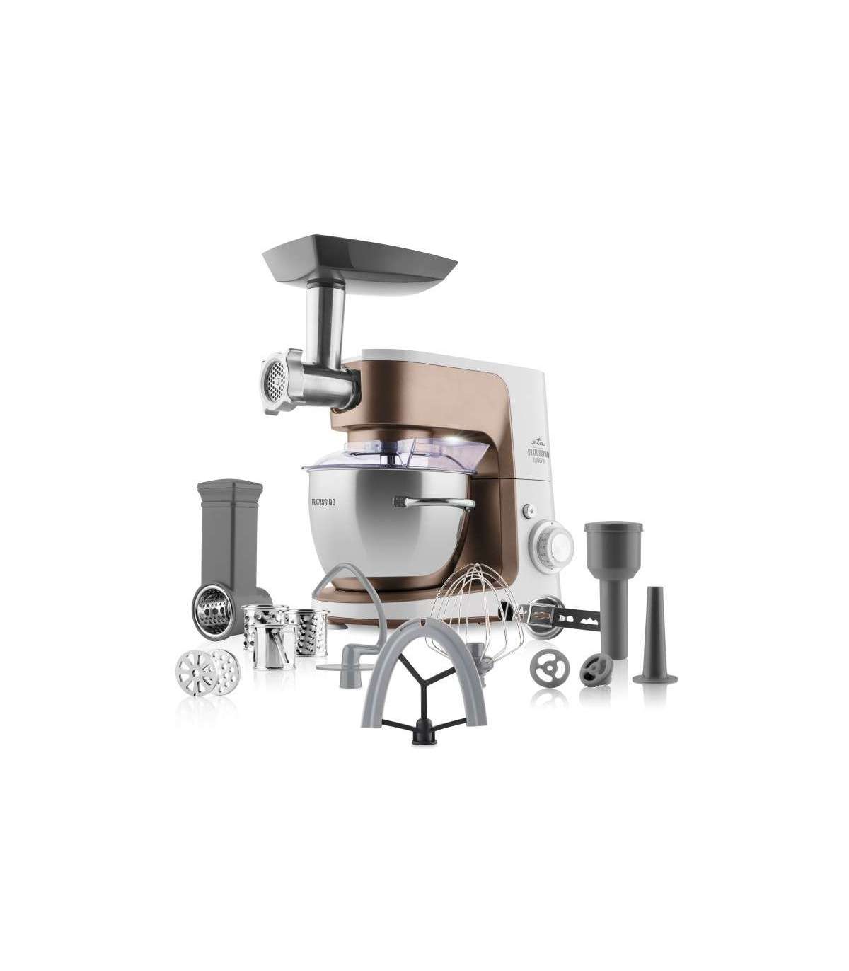 Drum grater, flexi broom, kneading hook, meat grinder, transparent bowl cover, whisk