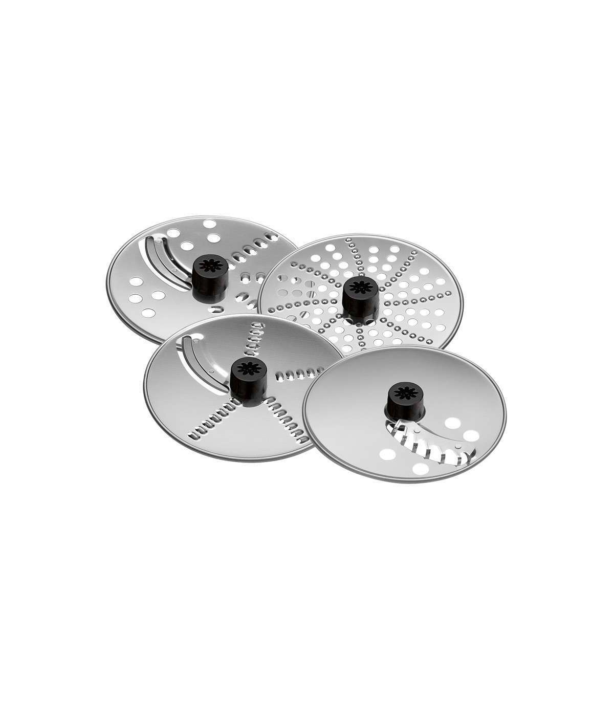 11 accessory parts: Citrus press insert, 2 x grating and cutting discs (fine & coarse), potato grating disc, chipping disc, guillotine blade, stainless steel dicing blade, special kneading/stirring attachment, stainless steel whisk, dough scraper