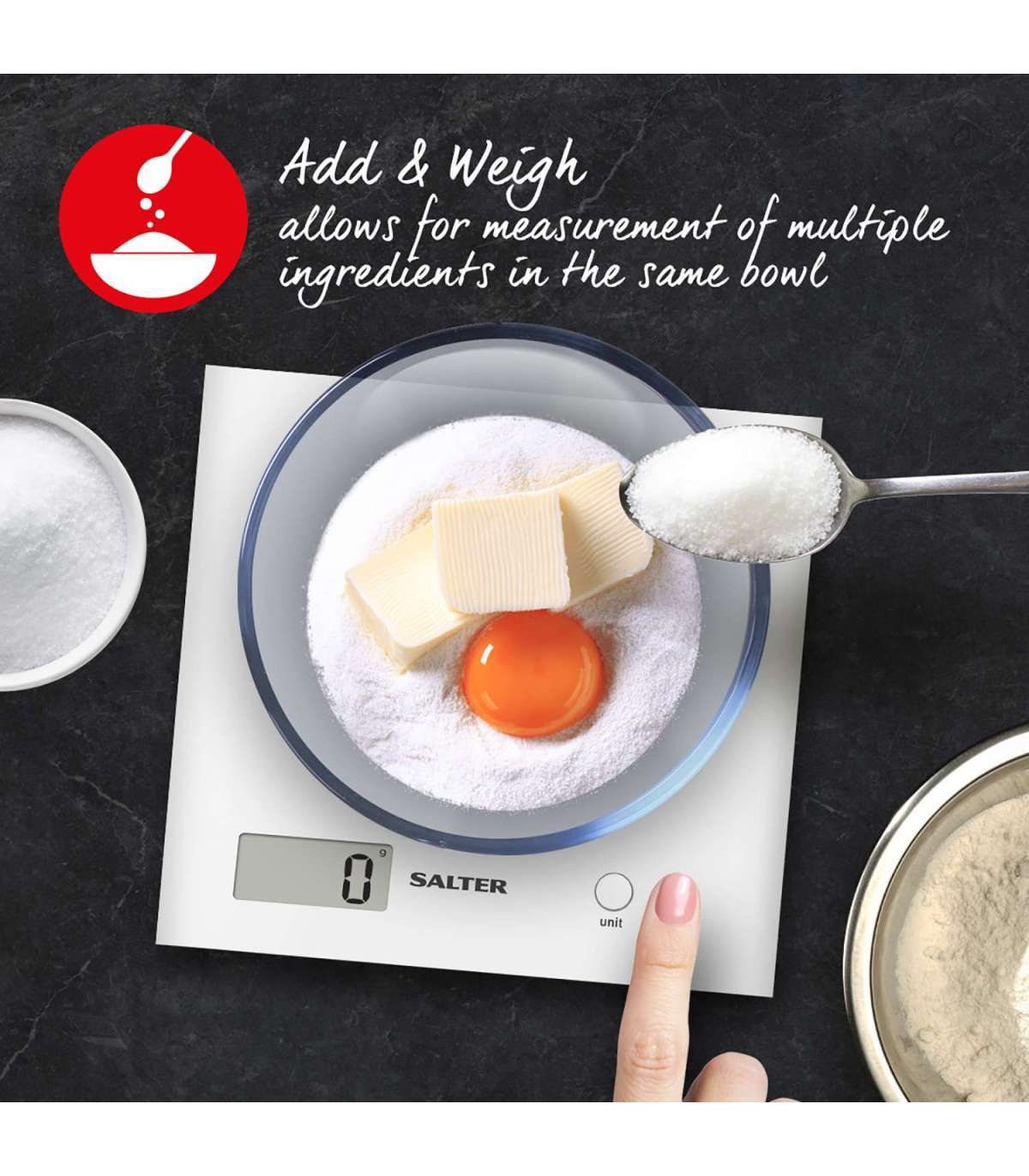Kaaluge otse platvormil või oma segamisnõuga - sobib kasutamiseks enamiku kausside või anumatega