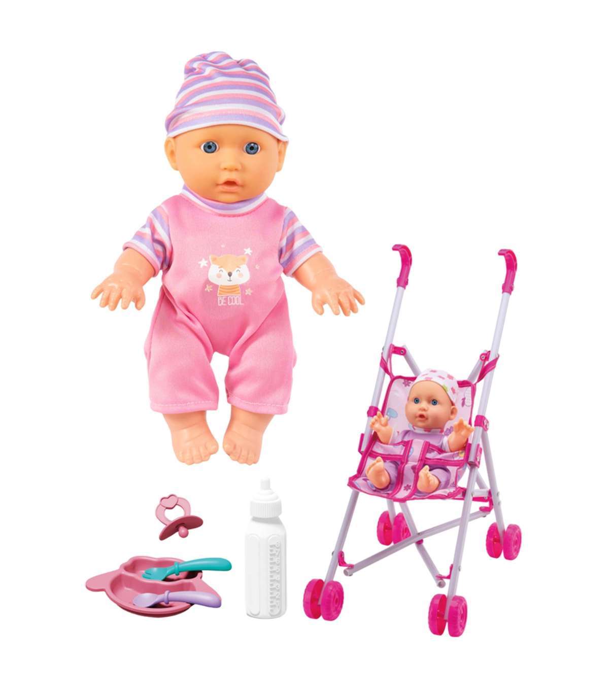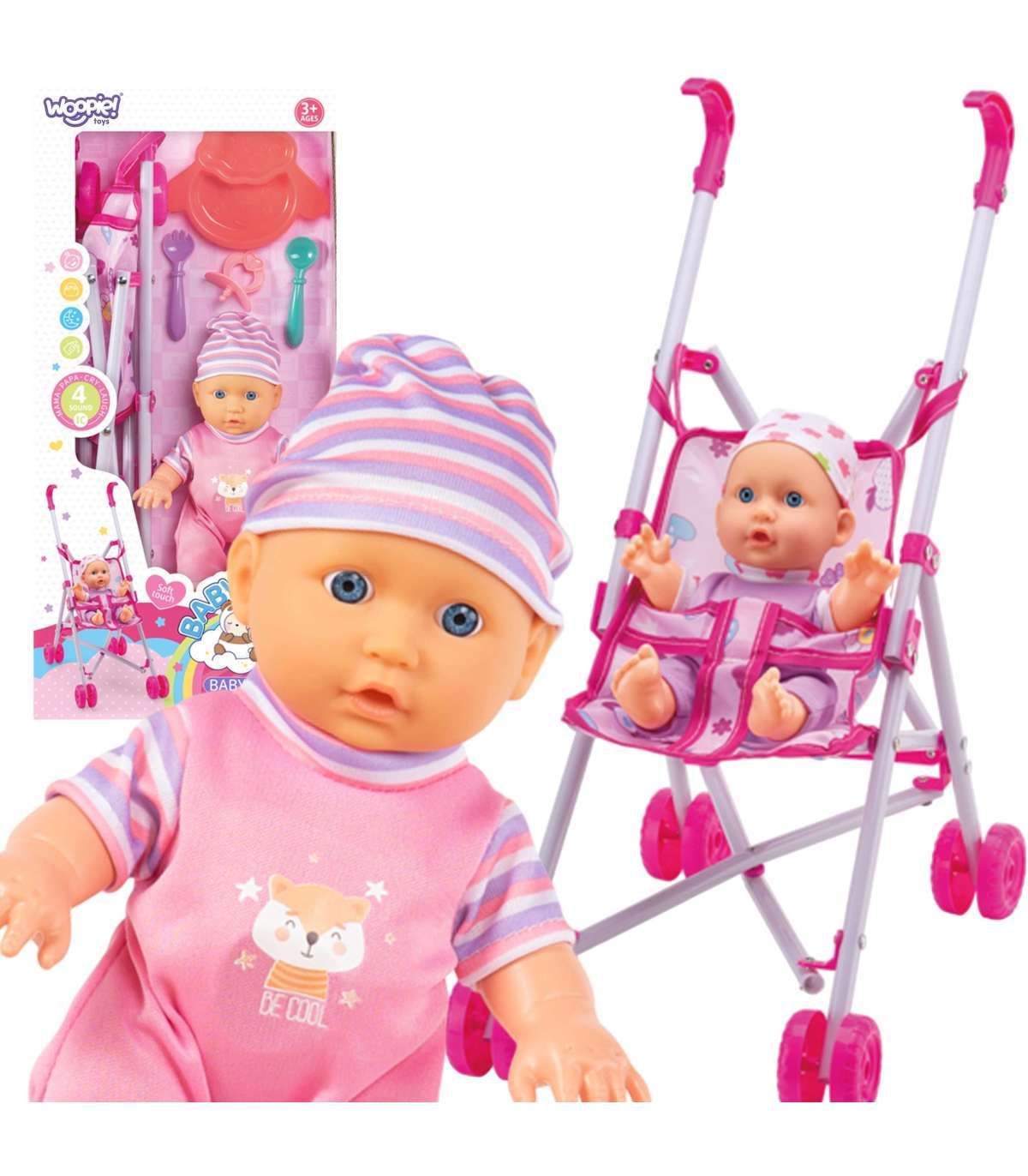 Кукла-малыш с коляской и набором для кормления от бренда WOOPIE — идеальная первая кукла для ребёнка, желающего подражать взрослым в уходе за детьми. Кукла издаёт звуки, например мама, папа, плач или смех, что придаёт игре ещё больше реализма. Ребёнок может её кормить или выгуливать благодаря коляске, входящей в набор.