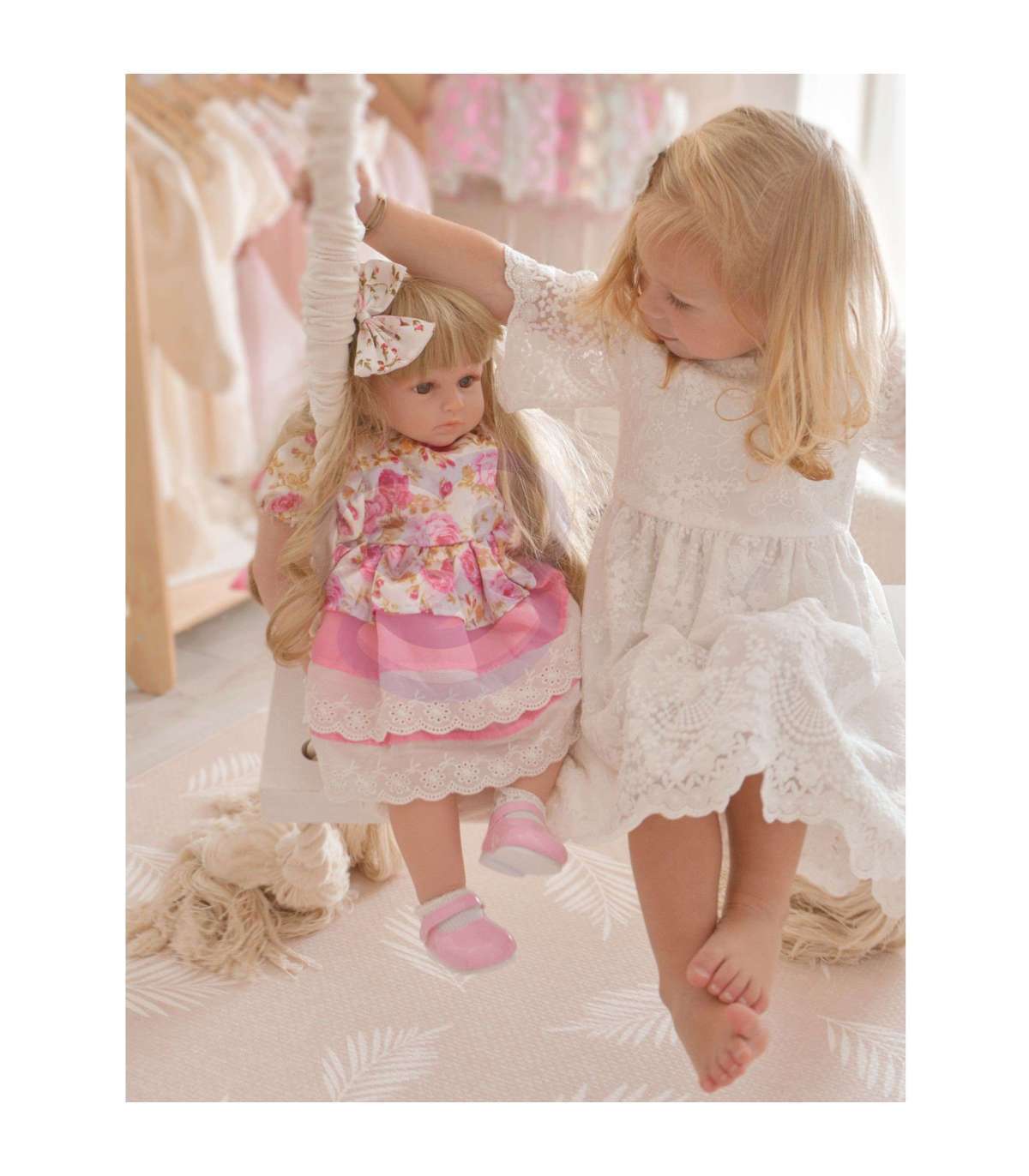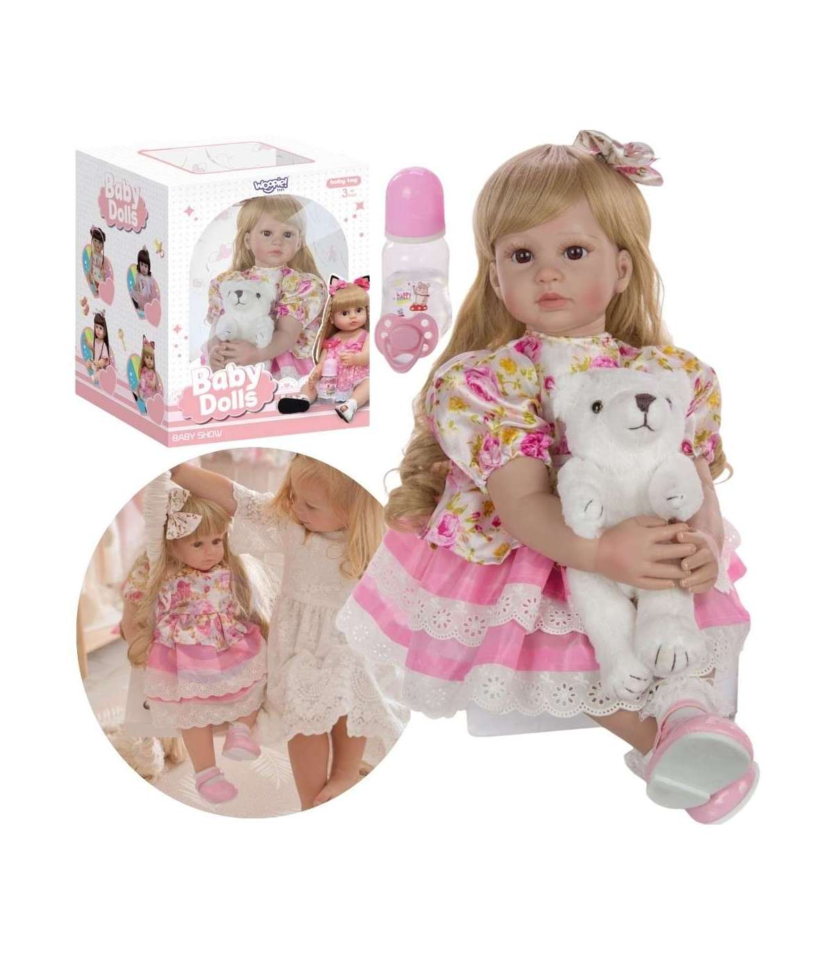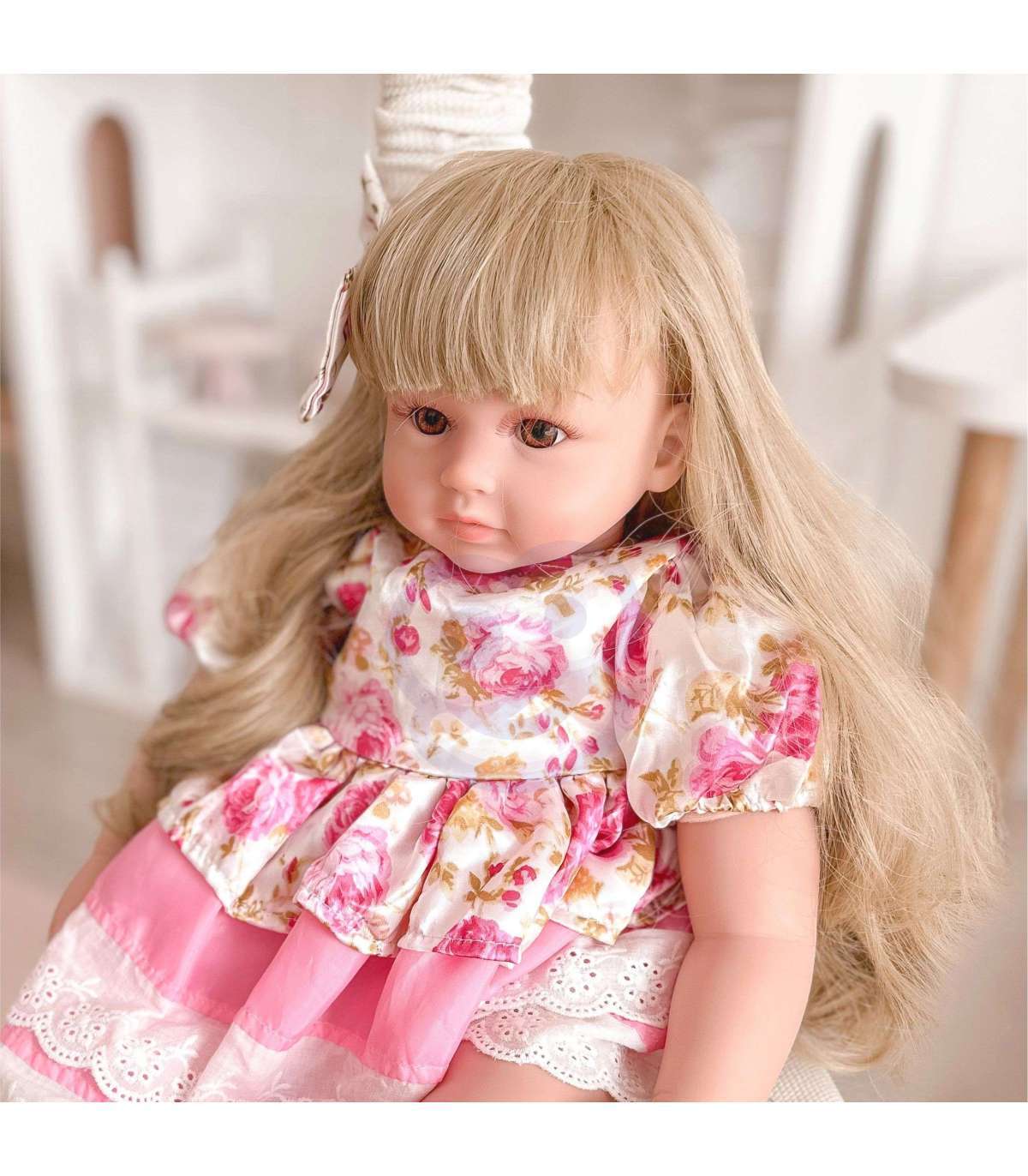 Интерактивная кукла от бренда WOOPIE из серии ROYAL как настоящий ребенок! Игра с куклой развивает у ребенка эмпатию и ответственность. Кукла мягкая на ощупь, а ее красивые глаза привлекают внимание ребенка. Безусловным преимуществом куклы являются ее красивые, длинные и блестящие волосы, идеально подходящие для расчесывания. Благодаря отличному качеству волос ваш ребенок может проявить креативность, создавая разные прически. Руки куклы проработаны, придавая ей реализм через деликатные ногти, а слегка румяные щеки подчеркивают красоту куклы. Множество элементов в наборе — игры не будет конца, малыш будет доволен, а вы будете спокойны, зная, что он проводит время за полезной игрой. Наши куклы были изготовлены с большой точностью и тщательностью в деталях, чтобы выглядеть как настоящие. На кукле розовое платье с милыми оборками. Платье отрезное на талии и украшено цветным принтом. Образ дополняют розовые туфельки и подходящая повязка на голову.