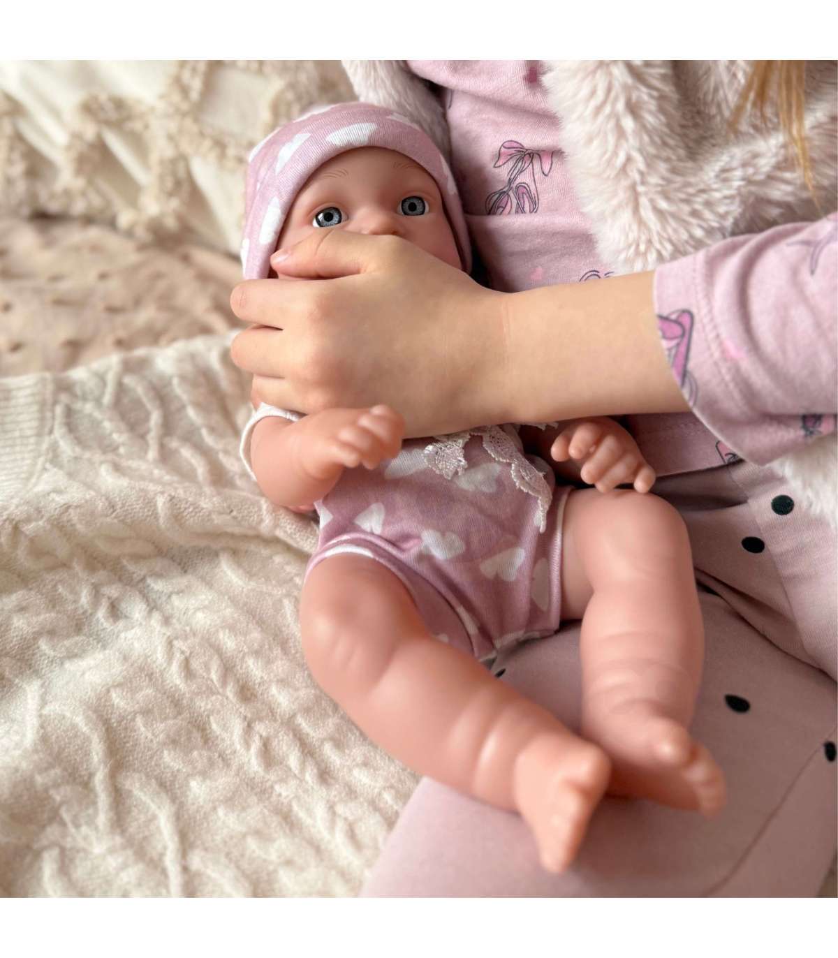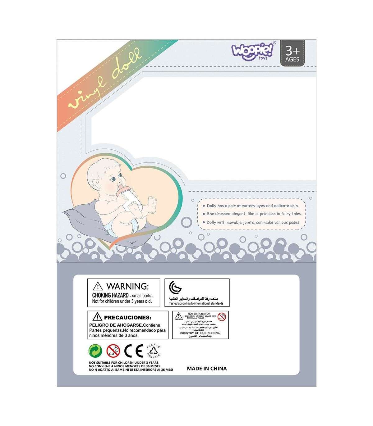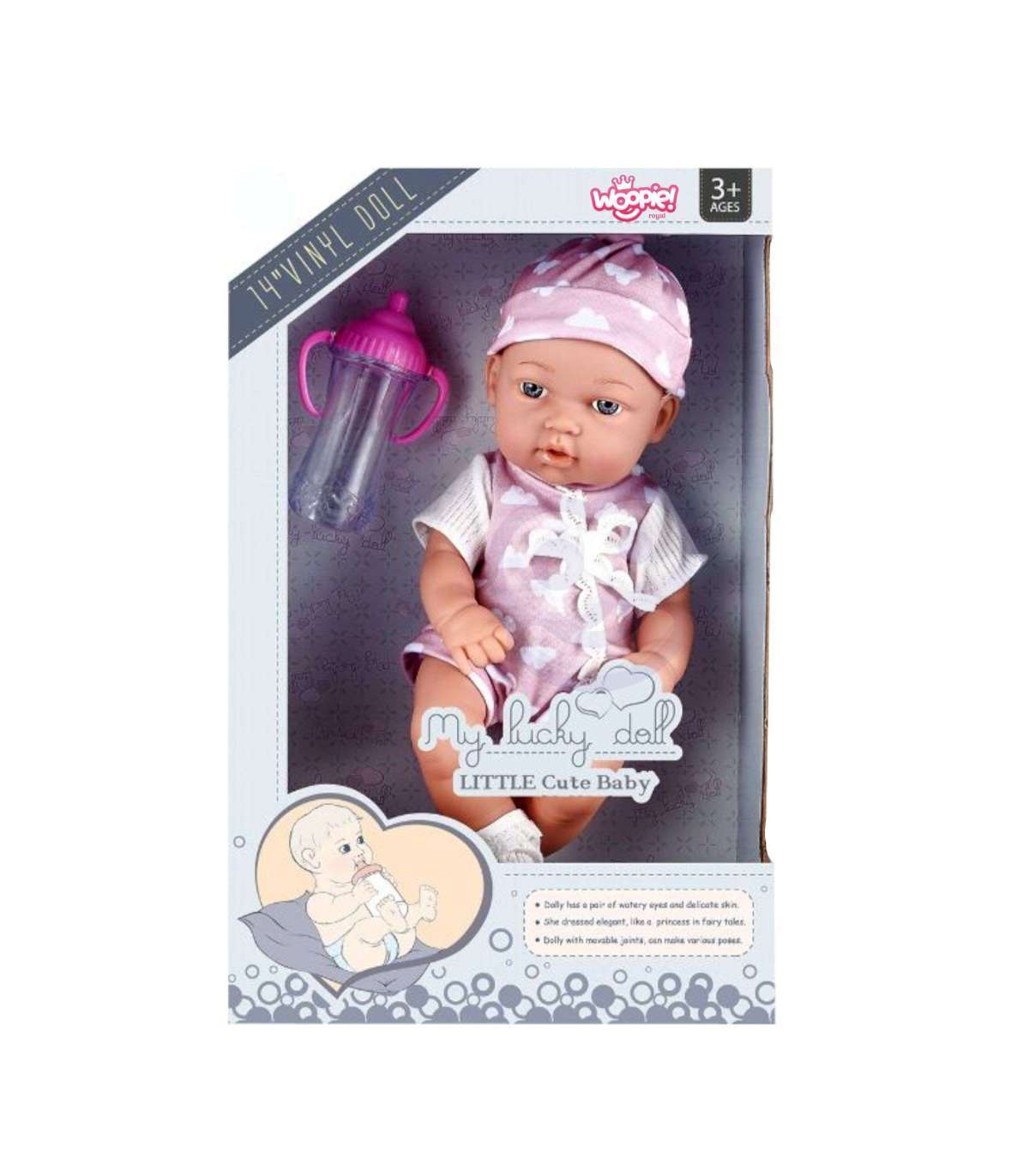Мой милый малыш от бренда Woopie Royal — это продукт, который порадует вашего ребёнка. У него подвижные конечности и красивые привлекающие внимание глаза. Кукла одета в розовый милый боди, на голове у неё подходящая шапочка и носочки. Дополнительно в комплект входит розовая бутылочка, которую кукла может держать в руках.