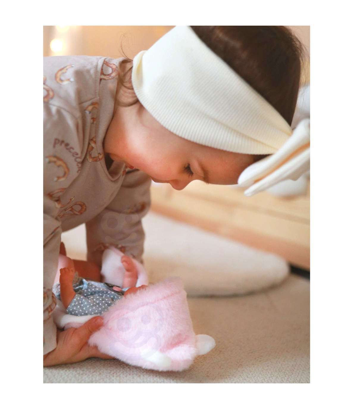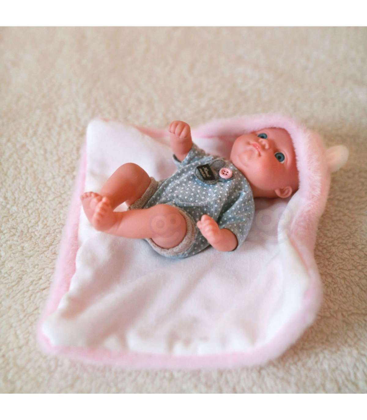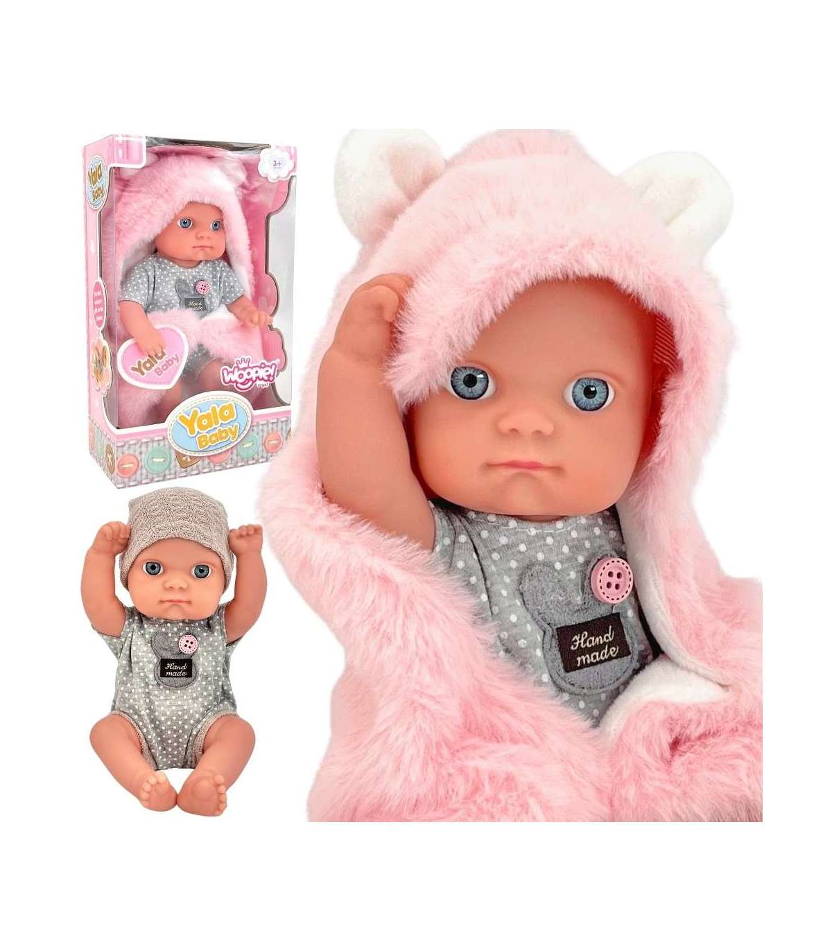 Познакомьтесь с куклой-младенцем от WOOPIE из серии ROYAL – Ваша новая подружка для игр! Эта очаровательная куколка имеет личико, которое всегда готово к улыбке и взгляду, полному тепла. Её реалистичные ручки, ножки, личико и остальное тело выполнены из мягкой резины, одета в милый ручной работы ромпер, идеальный для объятий. Куколка укомплектована розовым пледом, который превращается в палатку, переноску или просто идеальное укрытие для холодных дней. Кроме того, плед с ушками делает куклу ещё более милой и неповторимой.