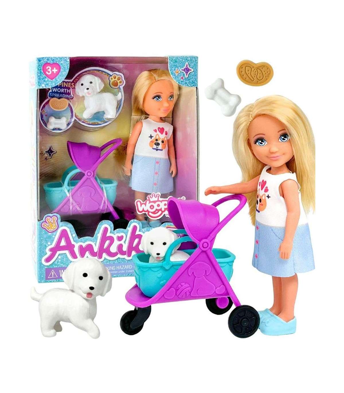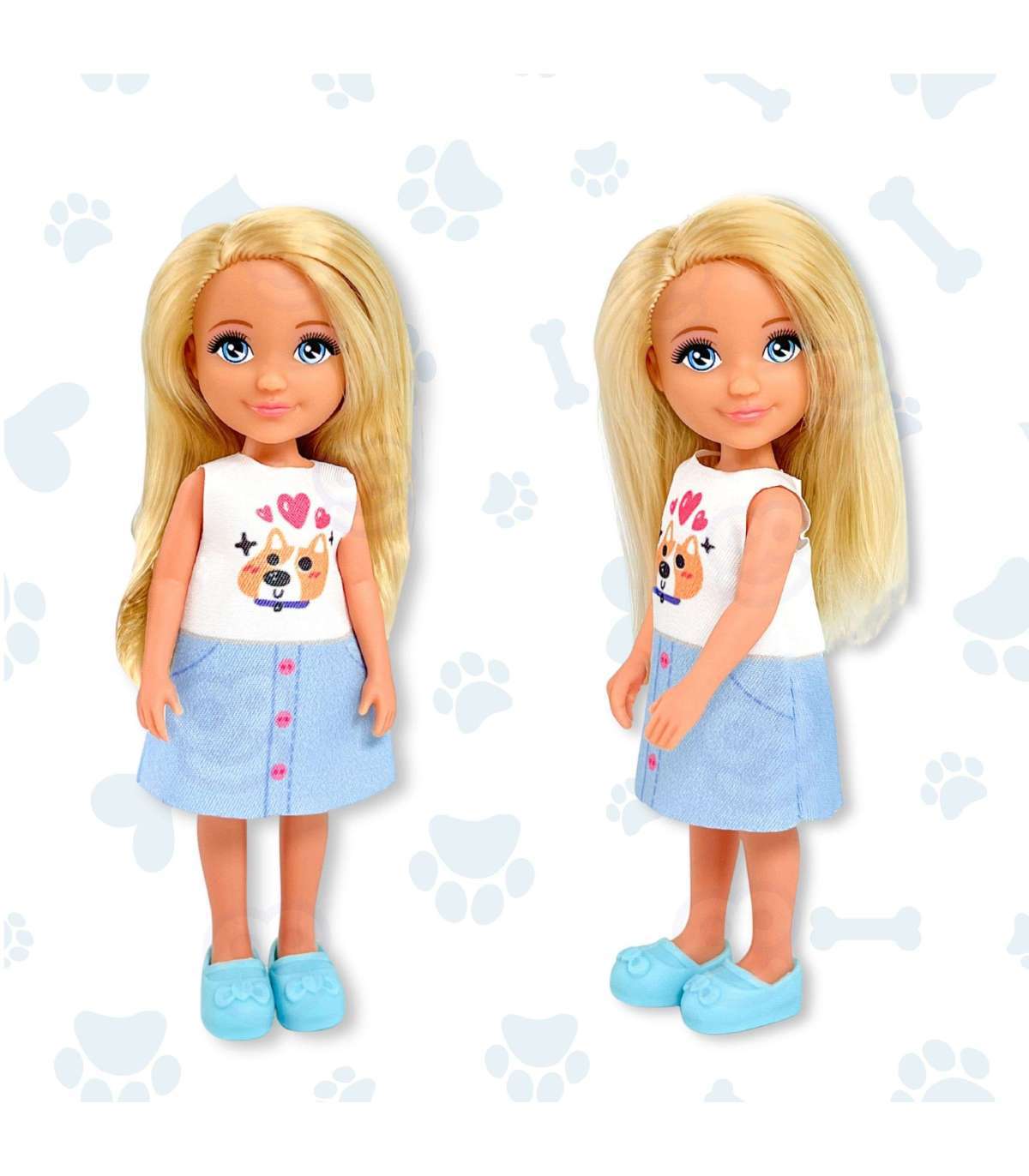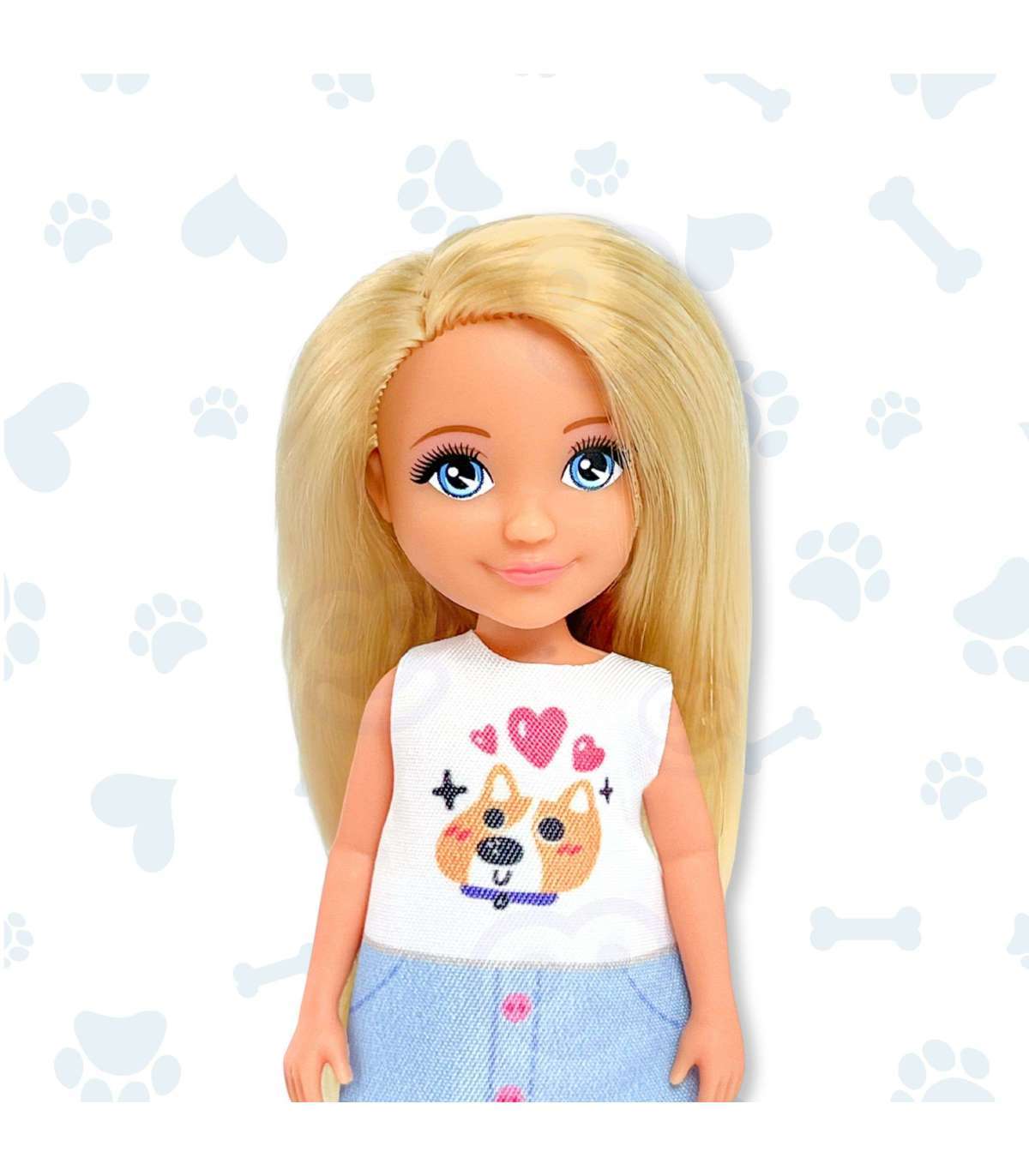 - - Śliczna laleczka z blond włosami, niebieskimi oczy, ubrana w białą bluzeczkę z uroczym nadrukiem pieska i błękitną spódniczkę.