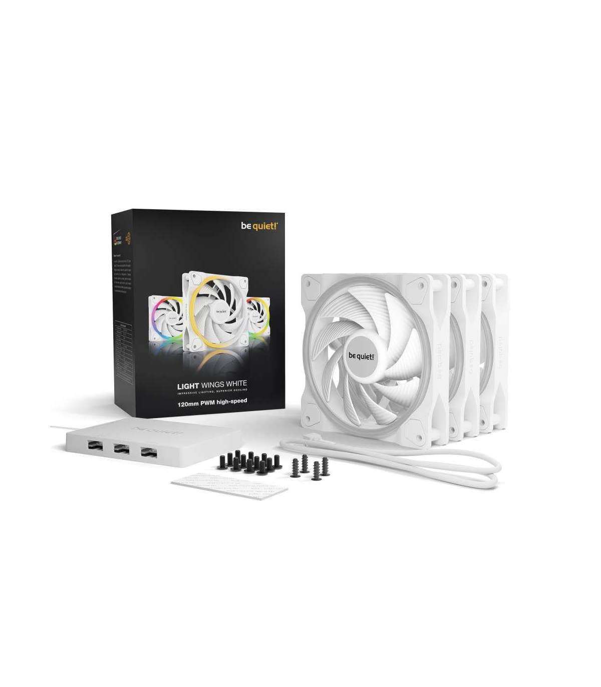 The Light Wings White 120mm PWM high-speed Triple Pack offers impressive illumination for a vibrant unique look, strong performance and quiet operation with efficient cooling. If you are looking for high performance fans with an impressive look from every angle, the Light Wings White 120mm PWM high-speed are your fans of choice.