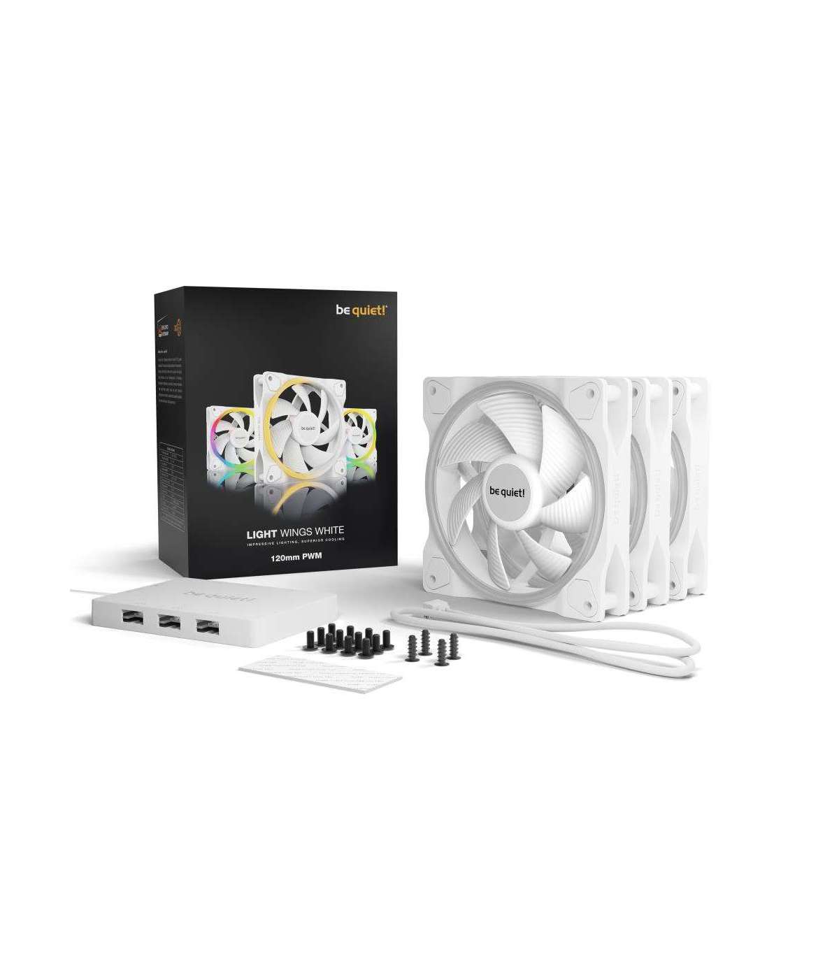 The Light Wings White 120mm PWM Triple Pack offers impressive illumination for a vibrant unique look, strong performance and quiet operation with efficient cooling. If you are looking for quiet case fans with an impressive look from every angle, the Light Wings White 120mm PWM are your fans of choice.