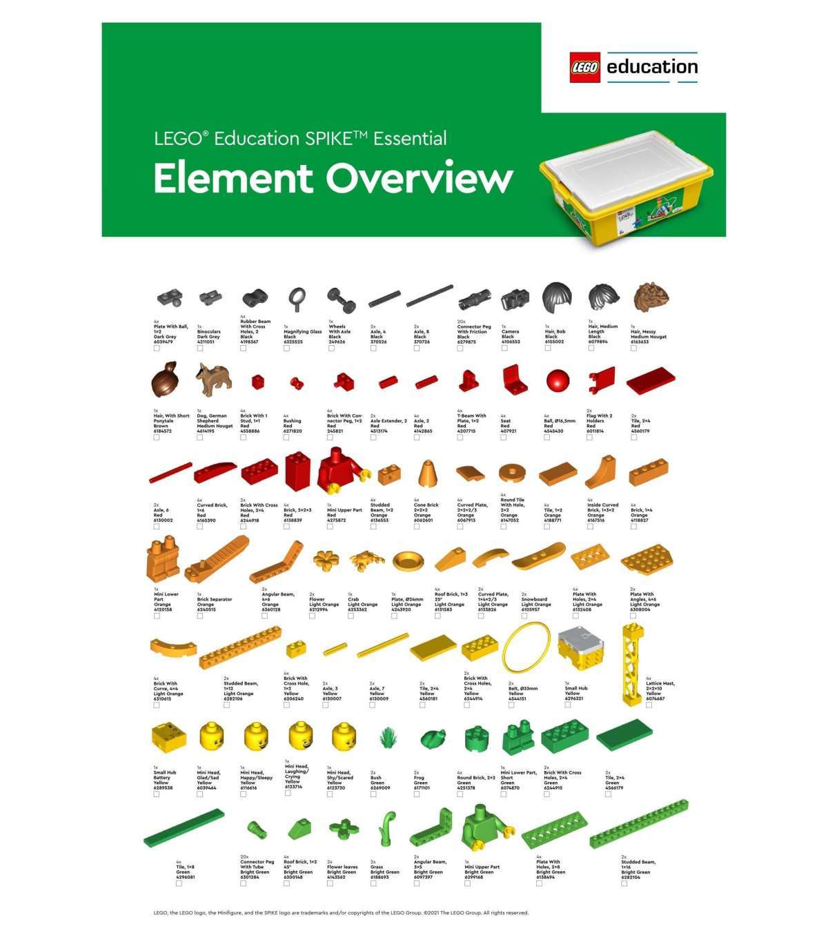 SPIKE Essential sisaldab 449 elementi, sealhulgas intelligentne riistvara ja tuttavad värvilised LEGO klotsid. Riistvara hõlmab endas 2-pordilist kontrollerit, 2 väikest mootorit, valgusmaatriksit ja värviandurit, mida õpilased saavad programmeerida LEGO Education SPIKE äpp'i kasutades.