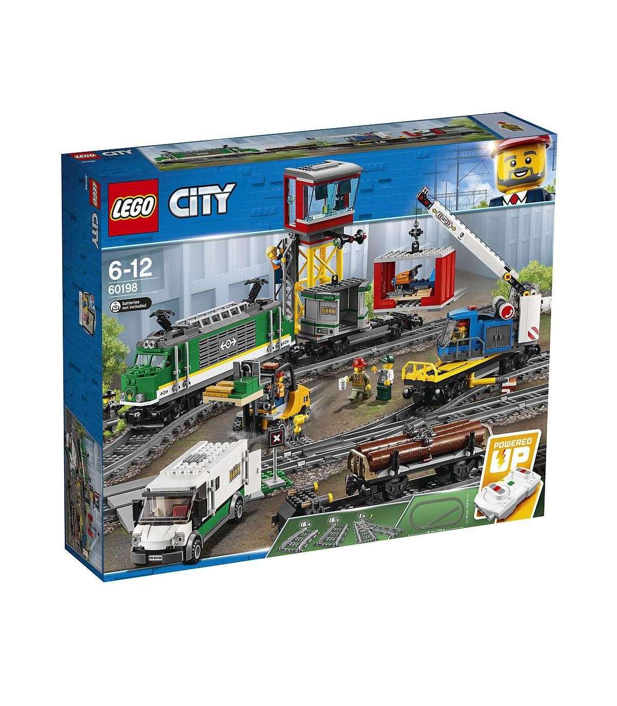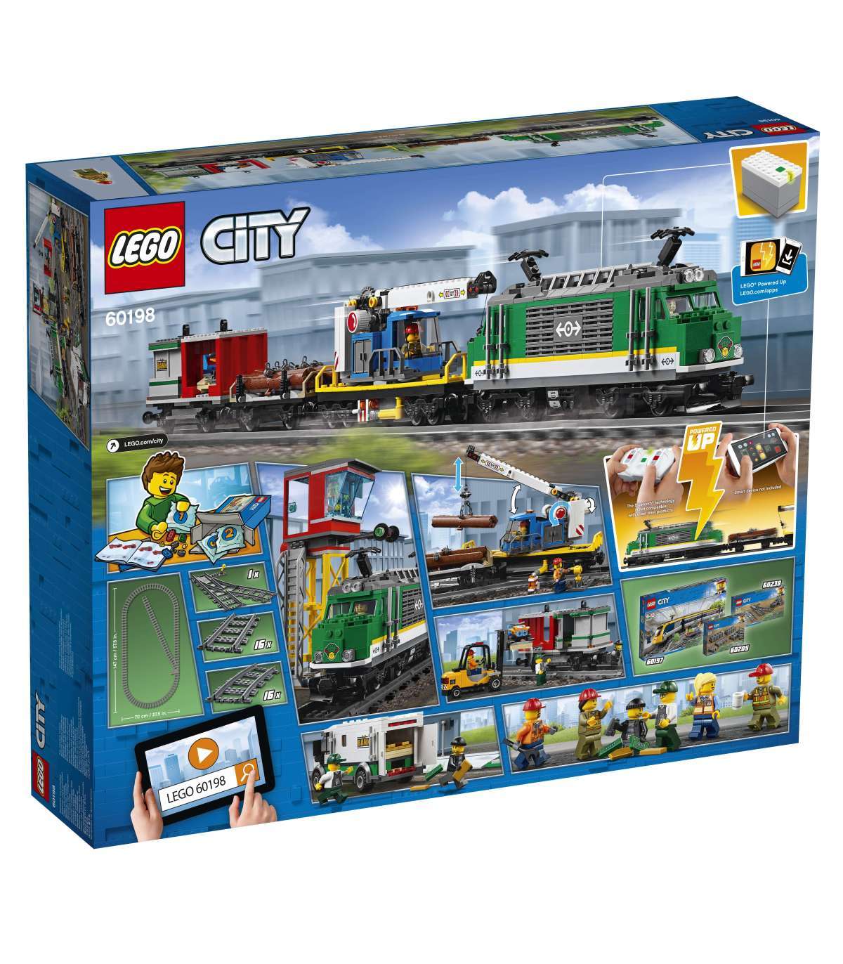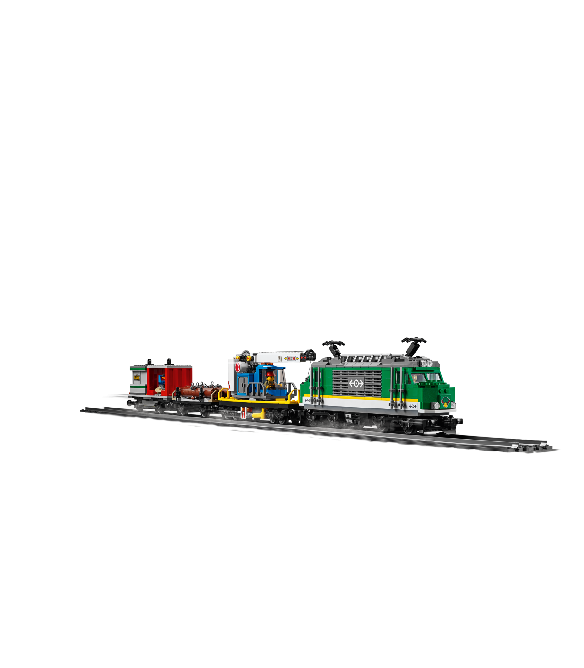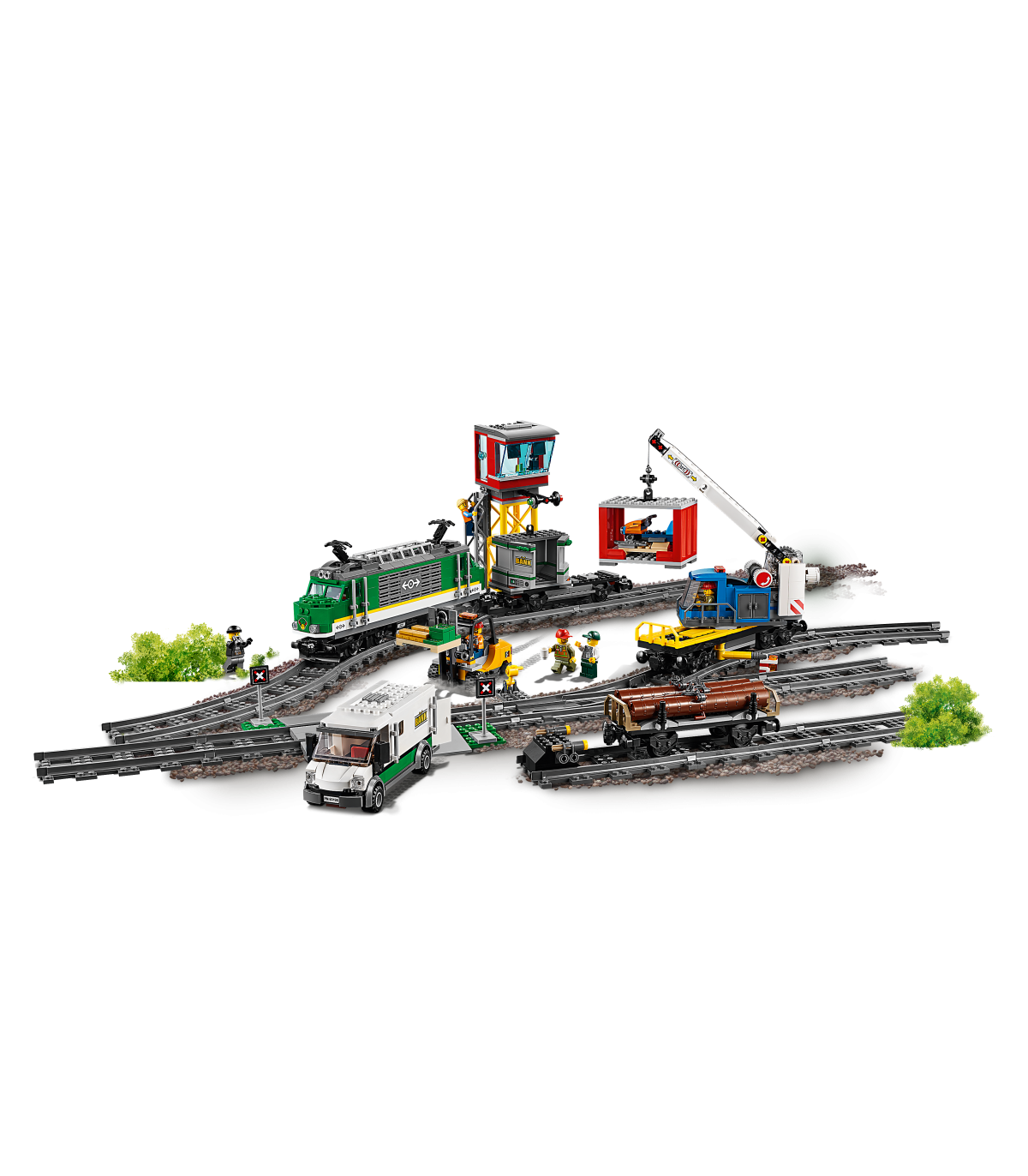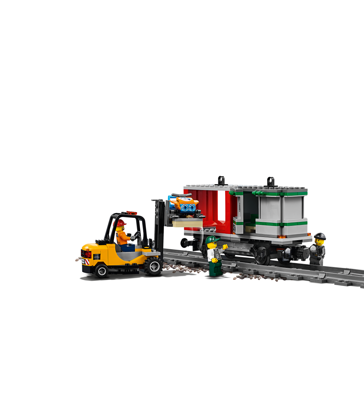 Sellesse vahvasse LEGO City komplekti kuulub mootor, 10 kiirusevalikuga Bluetooth-kaugjuhtimispult, juurdepääsetav juhikabiin, kraanavagun pöörleva noolesüsteemiga, konteinerivagun kahe konteineriga, palgivagun, soomusveok avatavate ustega, kahveltõstuk avatava kaitseraami ja tõstekahvlitega. Sellesse lahedasse LEGO kaubarongikomplekti kuulub ringikujuline rongirada (16 kaardus ja 16 sirget raudteeosa), hoovaga raudteelüliti, juhtimiskeskus redeli ja kahe kokkupandava kaubaalusega, rahatähed, kuldsed elemendid, mootorsaan ja kuus LEGO minifiguuri.