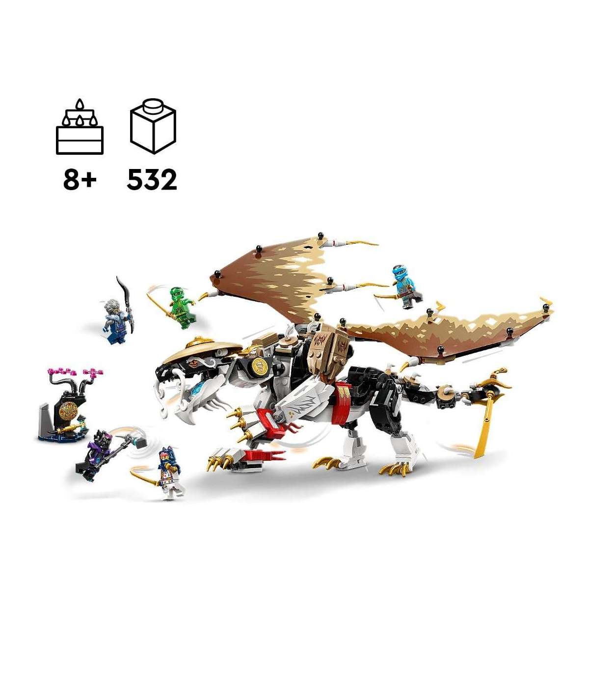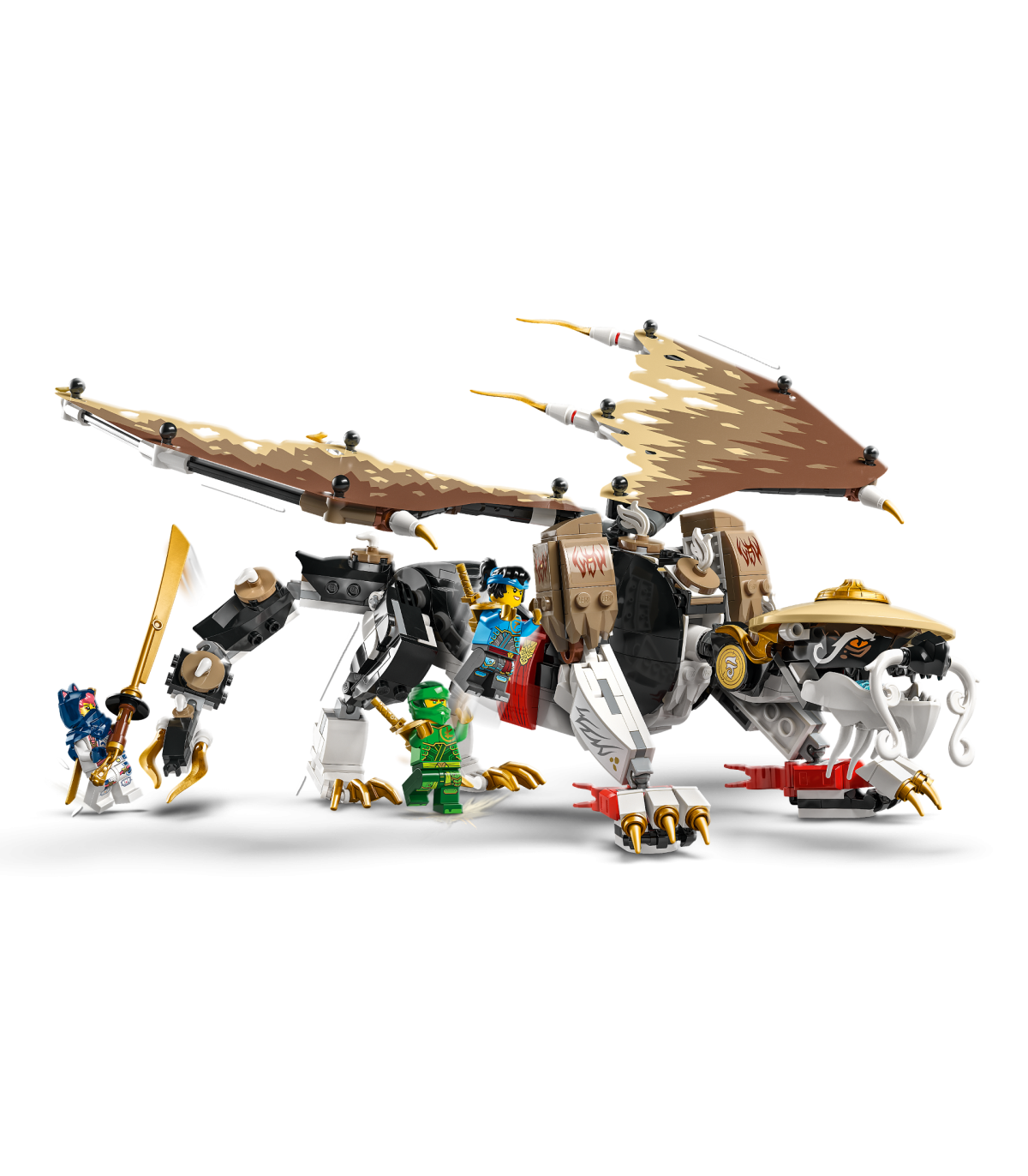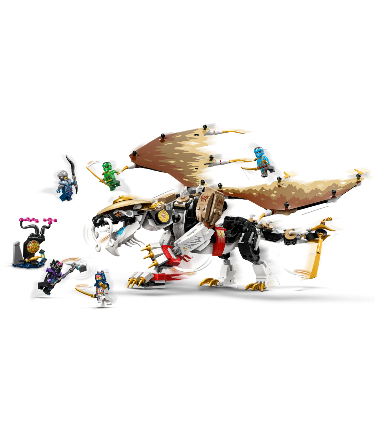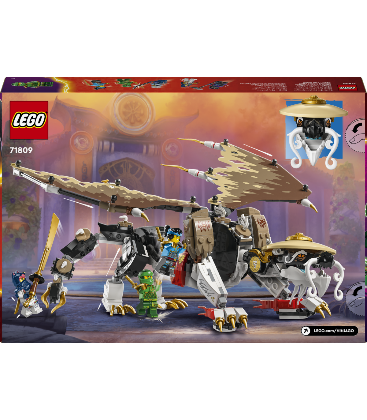 • Liigutatav draakonimänguasi – lapsed saavad taasluua stseene telesarja „NINJAGO® Dragons Rising“ 2. hooajast koos valitsejadraakoniga, millel on liigutatav pea, saba, jalad, käed ja kokkukäivad tiivad