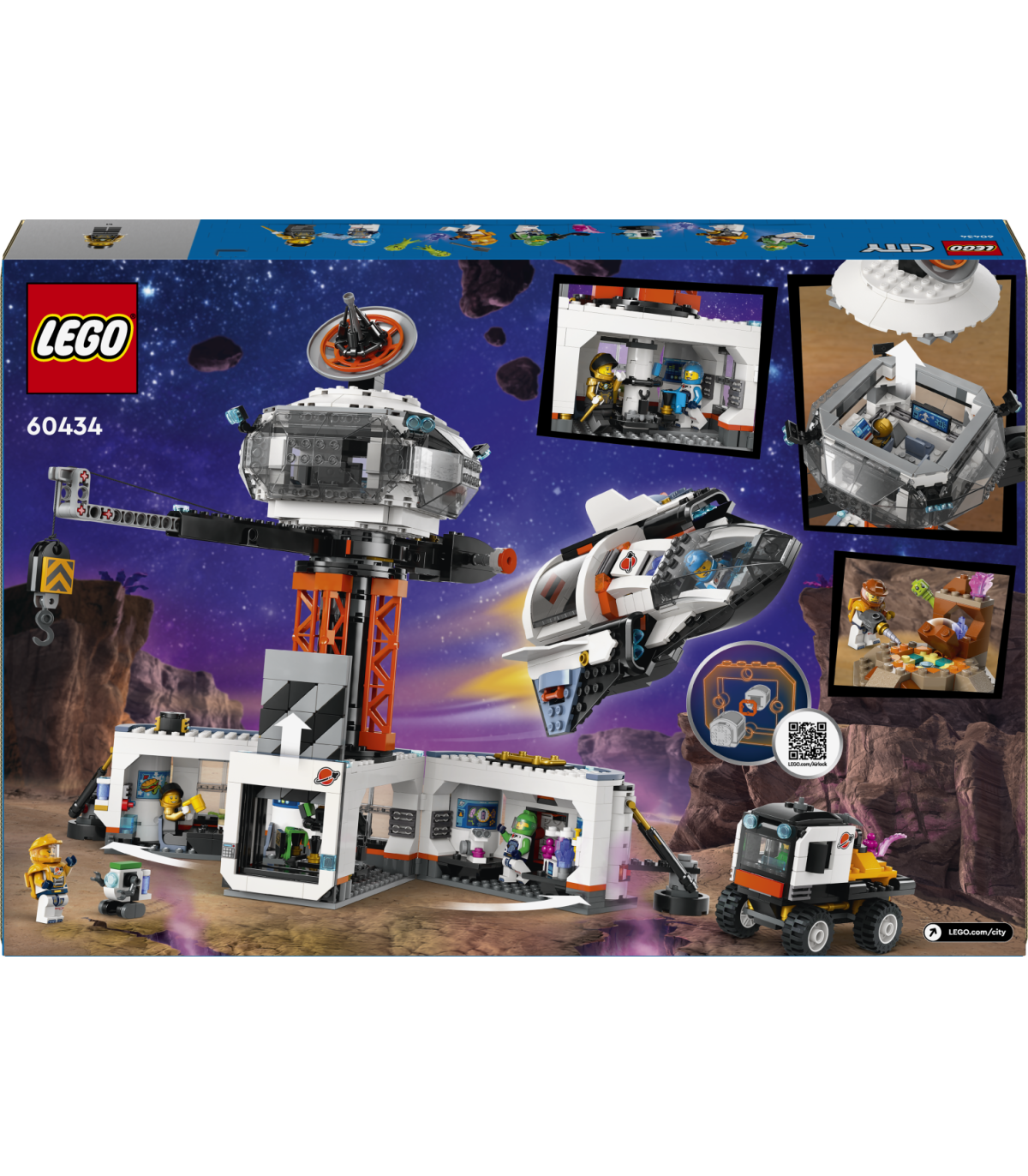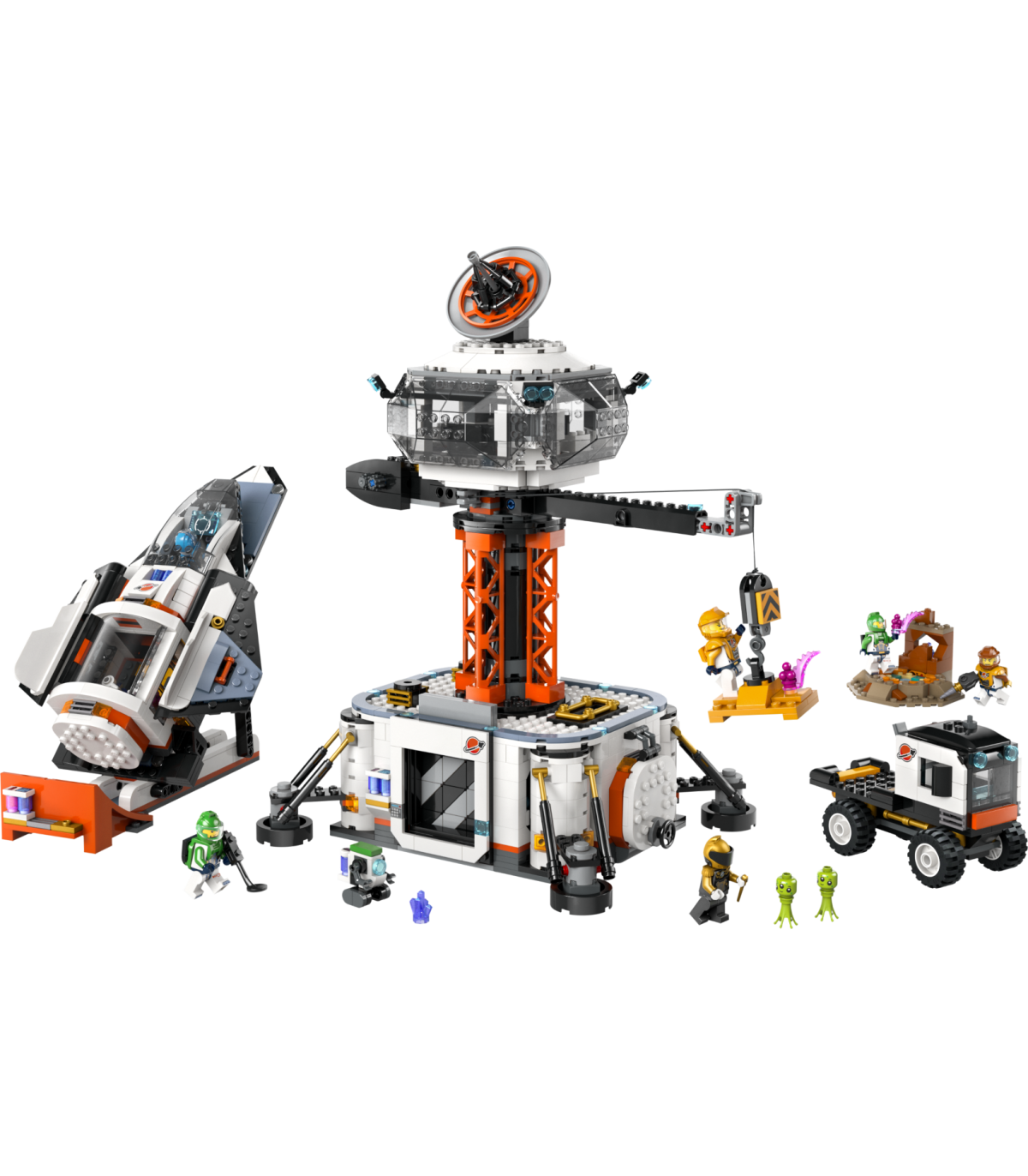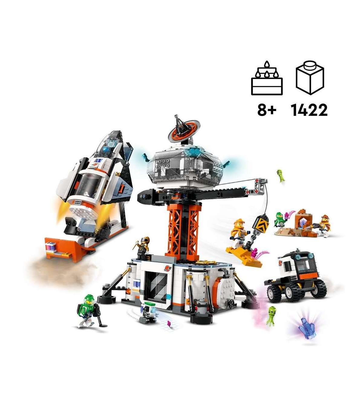 • Mis on selles LEGO® City kosmosekomplektis? – kõik, mida lapsed vajavad kosmosebaasi ehitamiseks, koos 360° tornkraana, kosmoselaeva, stardiplatvormi, veoauto, planeedi dekoratsiooni, kuue minifiguuri, roboti ja kahe tulnuka figuuriga
