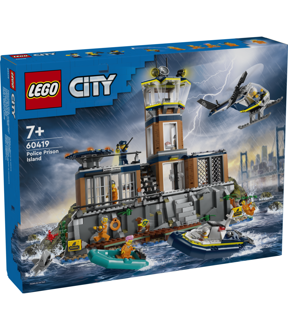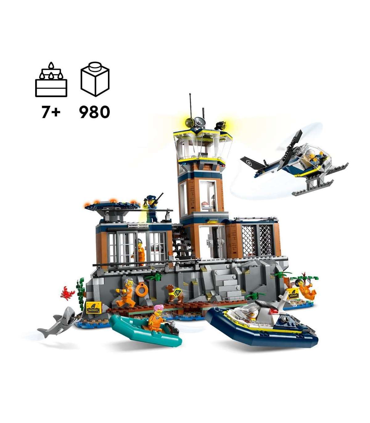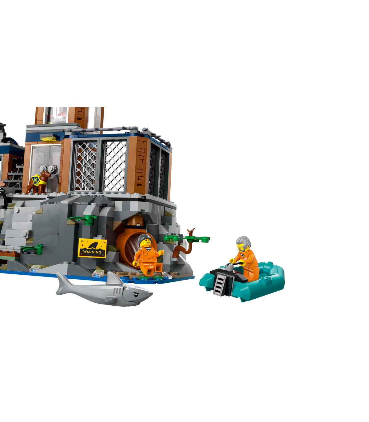 • Mis on selles LEGO® ehituskomplektis? – kokkupandav vanglasaar koos kaljuseina, vangla, politseipaadi,kummipaadi, helikopteri, kolme politseiniku ja nelja vangi minifiguuri ning politseikoera ja hai figuuriga